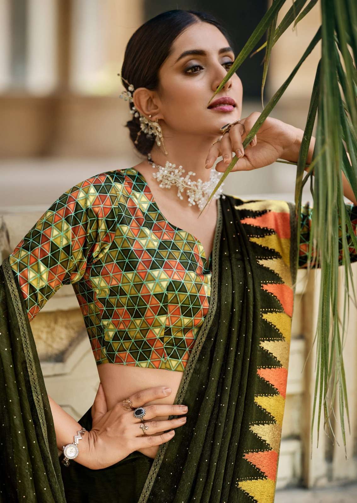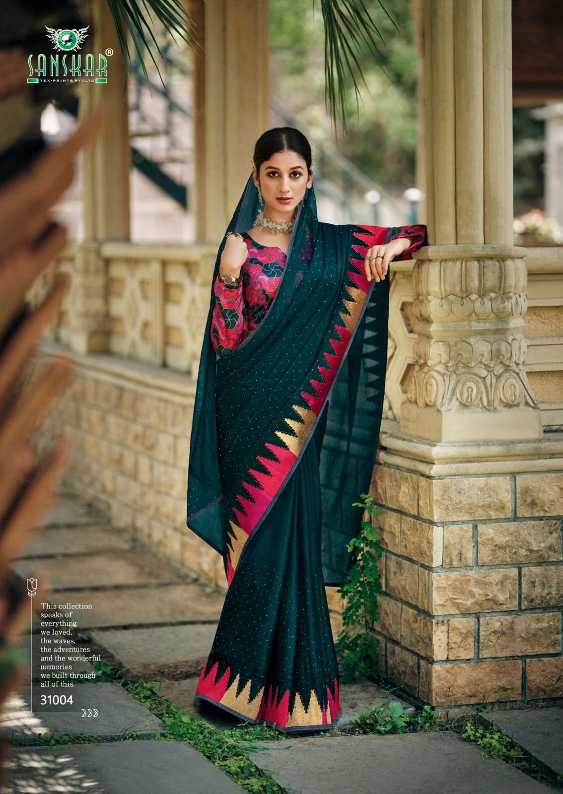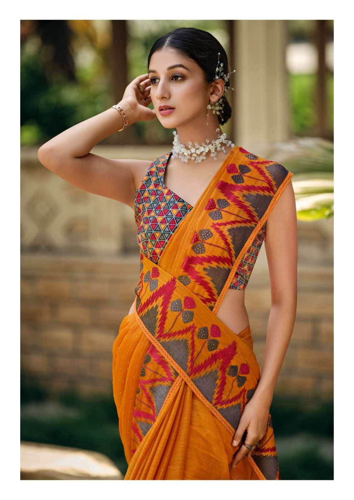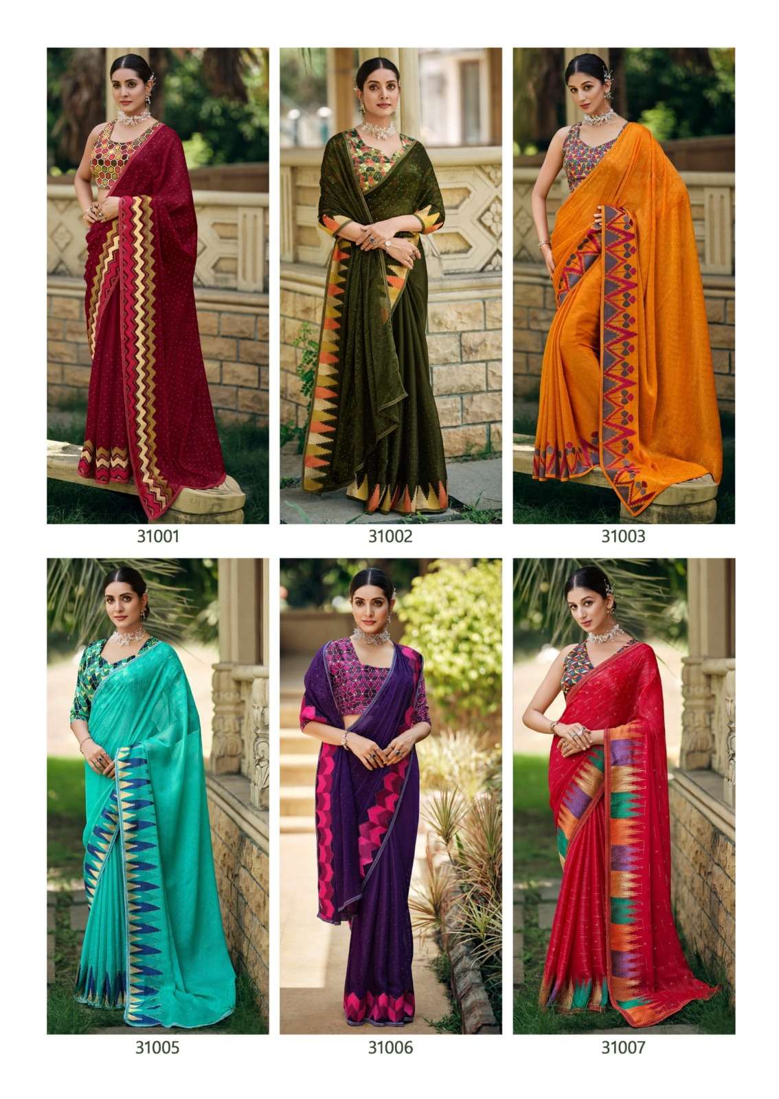 Sanskar Tex prints pvt. ltd. CATLOUGE- WOW Fabric- Simmer Georgette chiffon with embroidery 🪡 thread 🧵 work full saree sirowski work border & Digital blouse Qty- 8 dis RATE - 1155₹ |