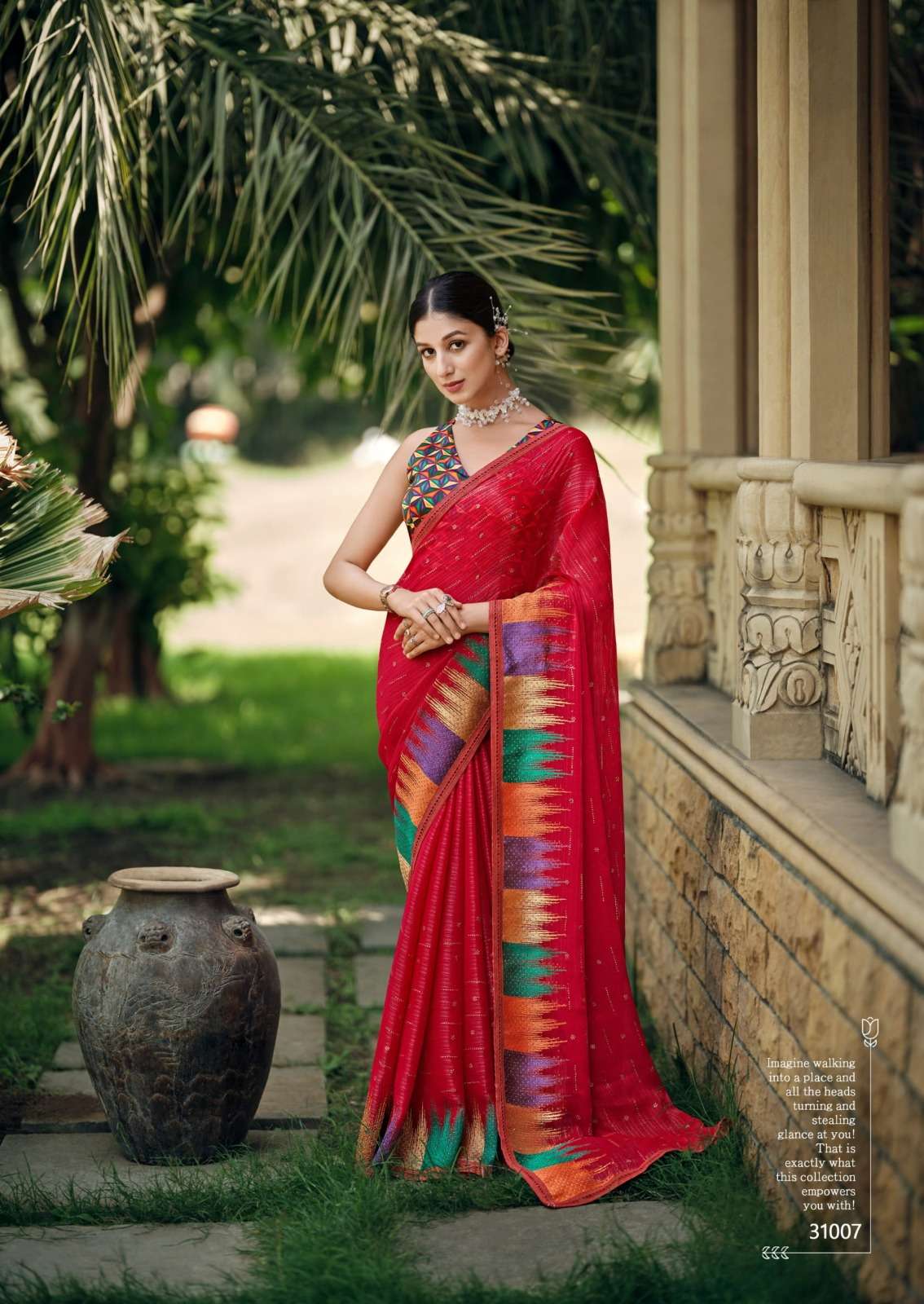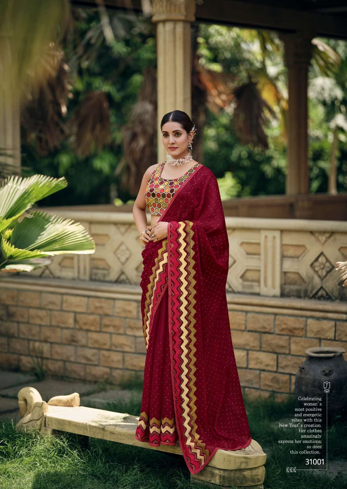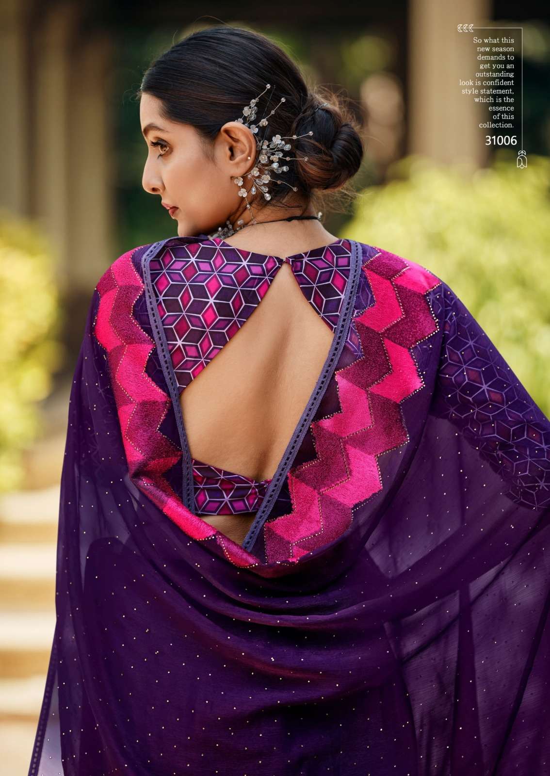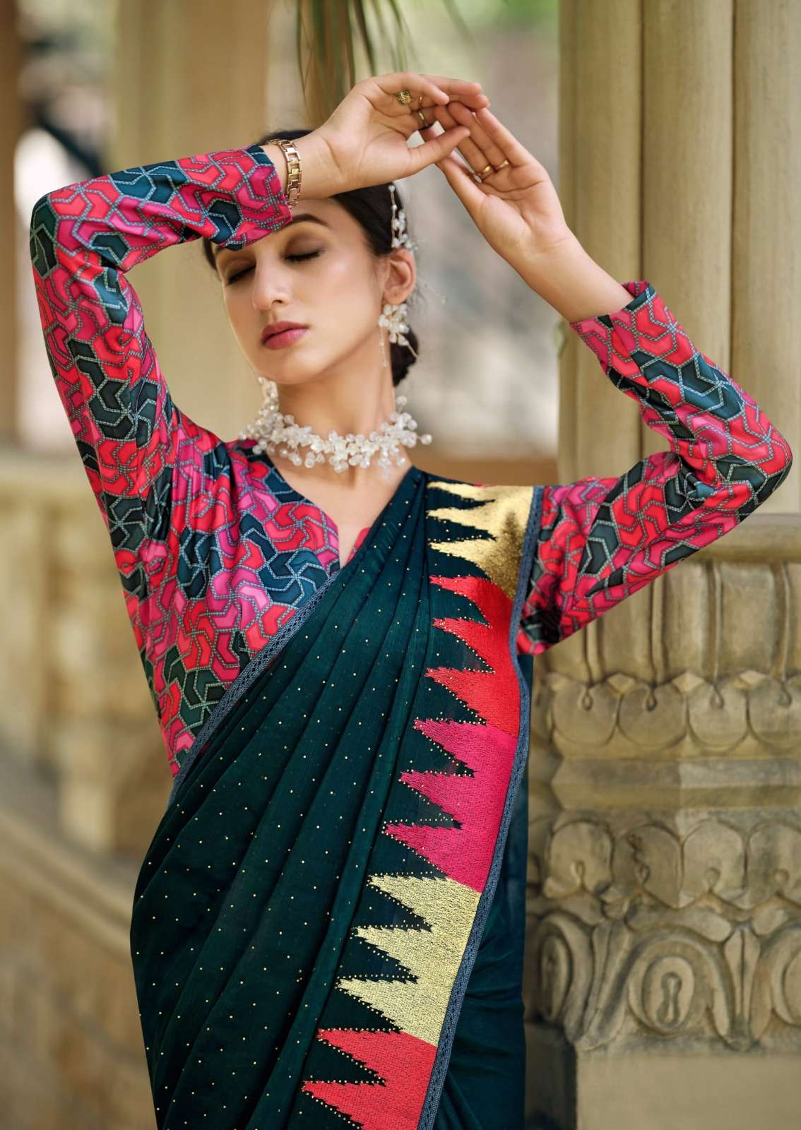 Sanskar Tex prints pvt. ltd. CATLOUGE- WOW Fabric- Simmer Georgette chiffon with embroidery 🪡 thread 🧵 work full saree sirowski work border & Digital blouse Qty- 8 dis RATE - 1155₹ |