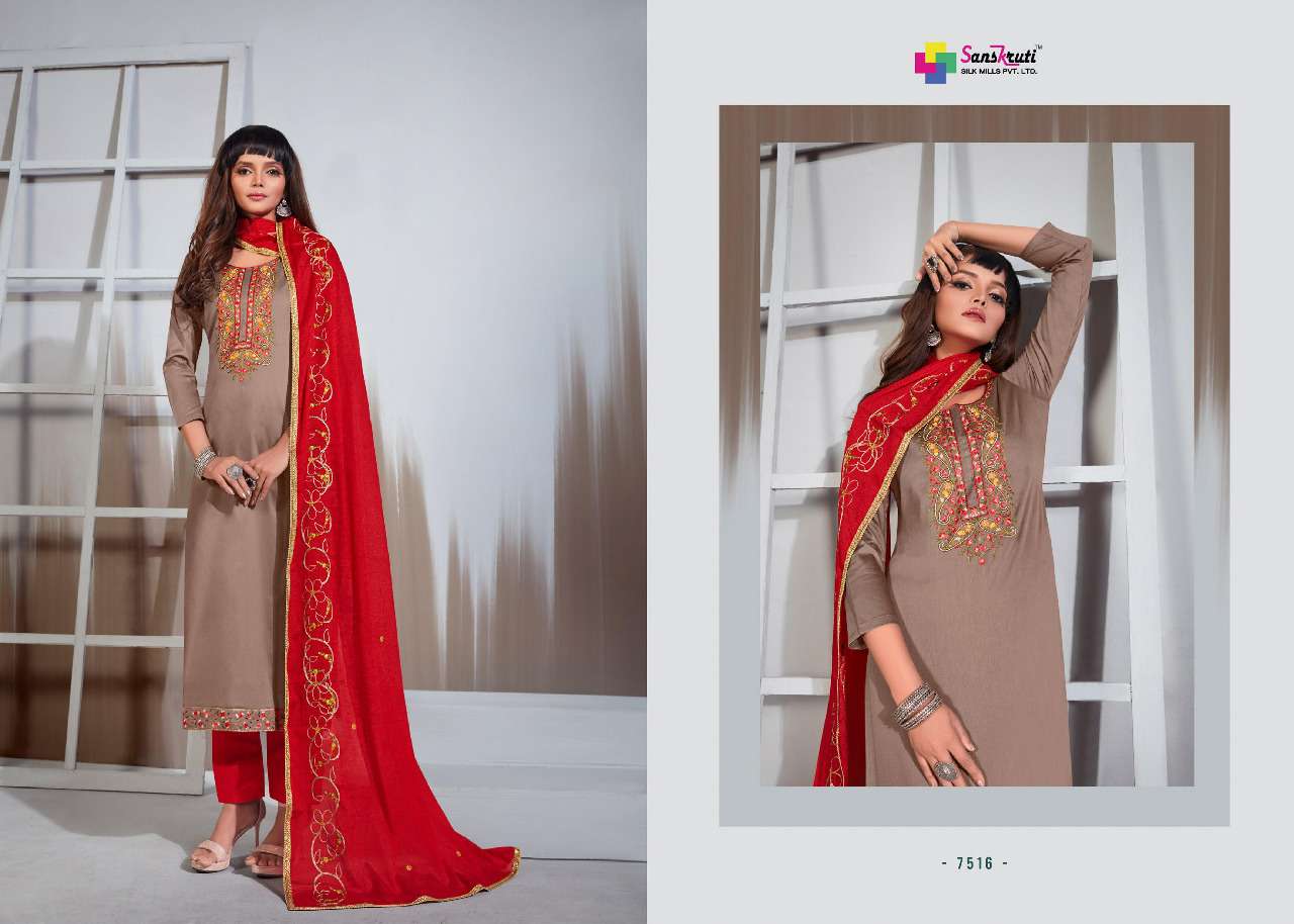 SANSKRUTI SILK MILLS PVT LTD       Present New Catlog        ORION       Fabric Details Top: PURE JAM SILK WITH HEAVY EMRODARI  Bottom: PURE COTTAN Dupatta: PURE CHINON WITH PRINT AND EMBRODARY  FOUR SIDE  LEES Designs: 6 PCS * Price:- 850/- * |