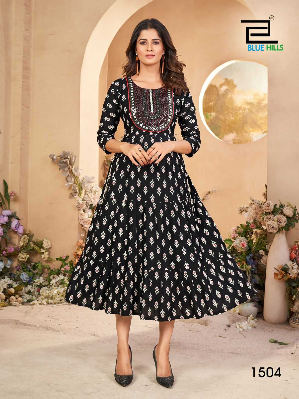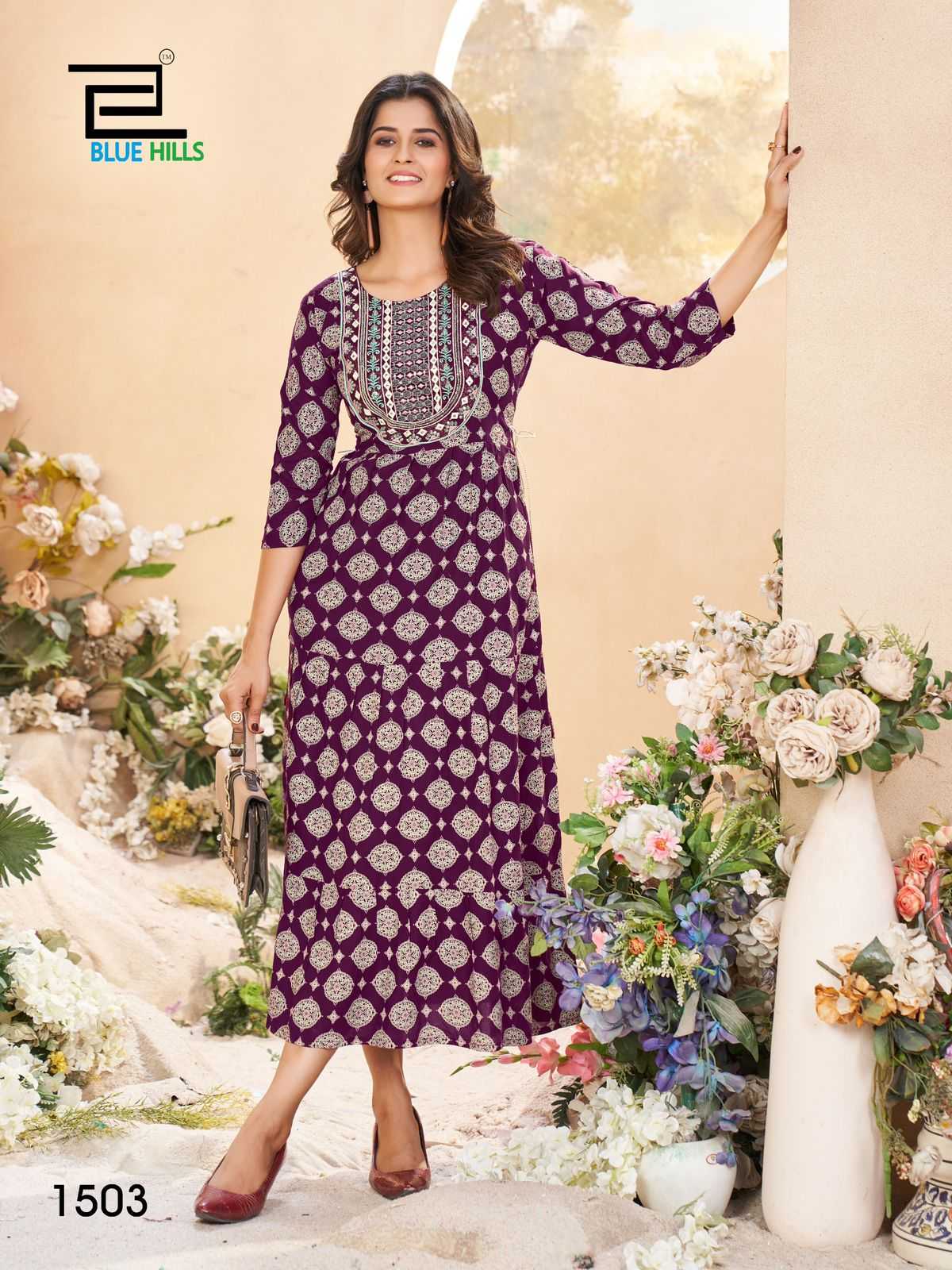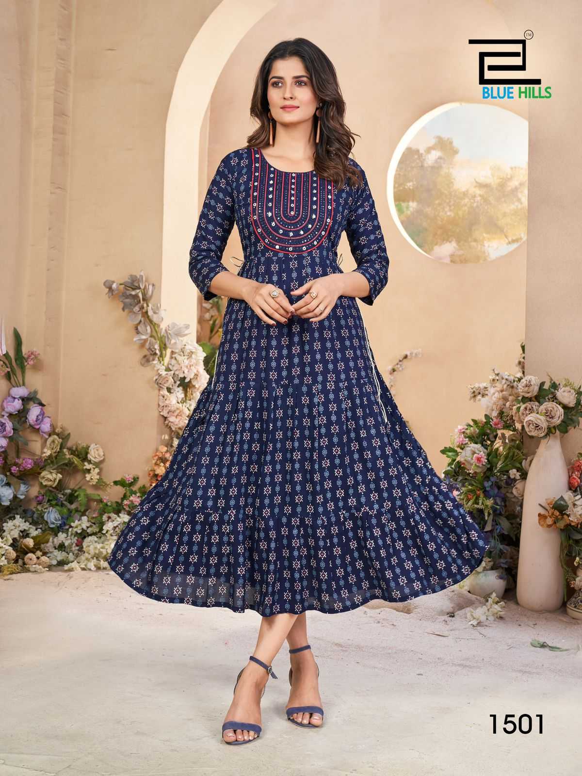 sarfaraz vol 15 by blue hills rayon print neck embroidery full stitch big size gown style kurti