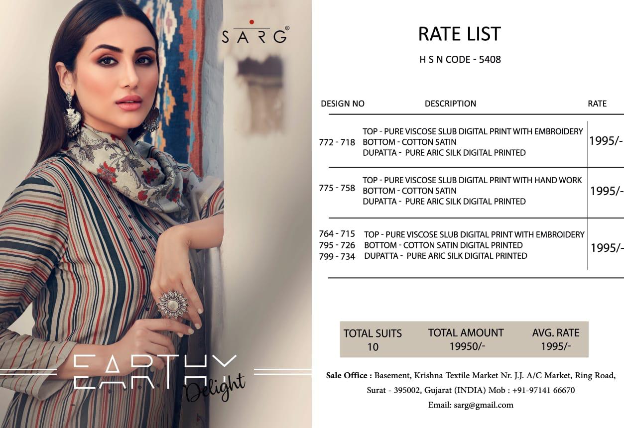 SARG Presents - EARTHY DELIGHT TOP-PURE VISCOSE SLUB DIGITAL PRINT WITH WORK BOTTOM-COTTON SATIN DUPATTA-PURE ARIC DIGITAL PRINT RATE-1995₹ DELIVERY 5 DAYS SET TO SET |