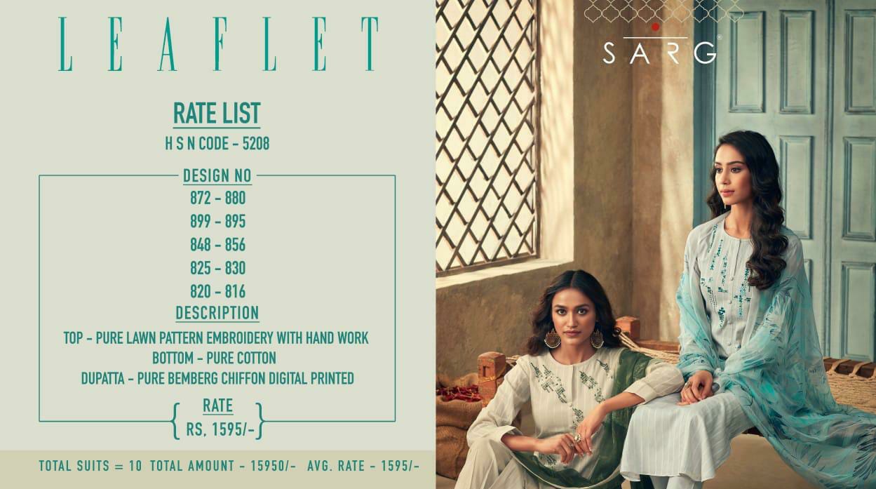 SARG Presents - LEAFLET TOP- PURE LAWN PATTERN EMBROIDERY WITH HAND WORK BOTTOM- PURE COTTON DUPATTA- PURE BEMBERG CHIFFON DIGITAL PRINT RATE- 1595₹ |