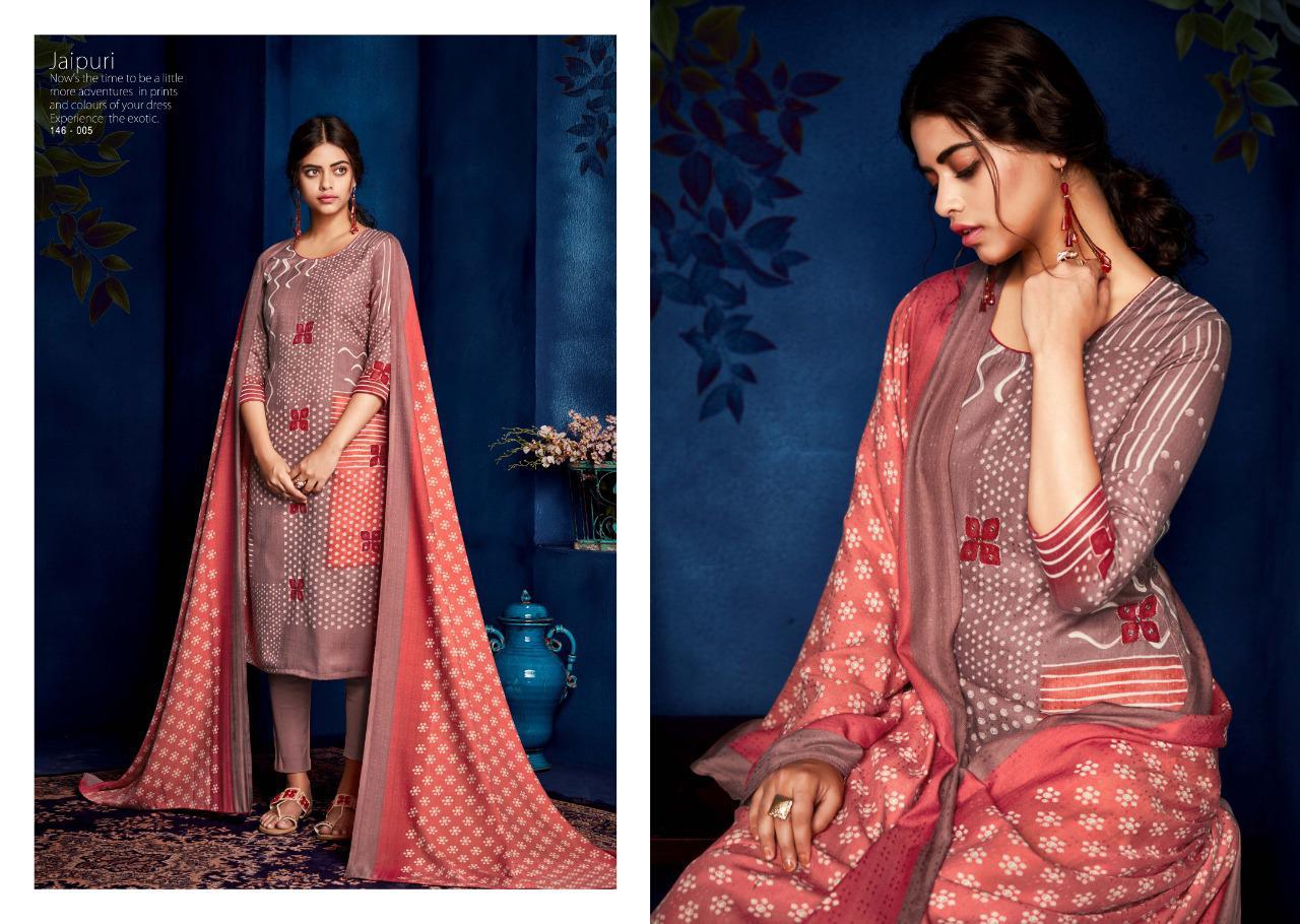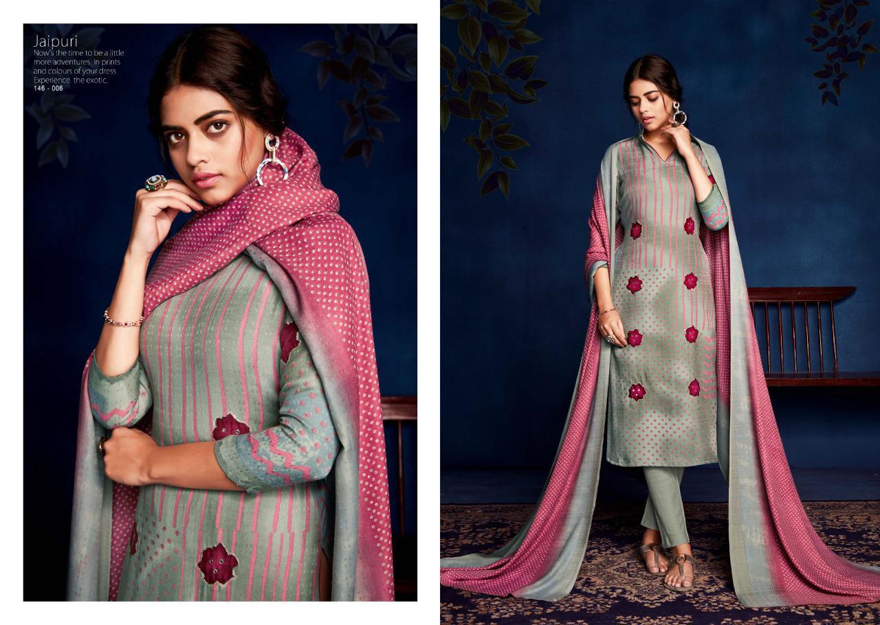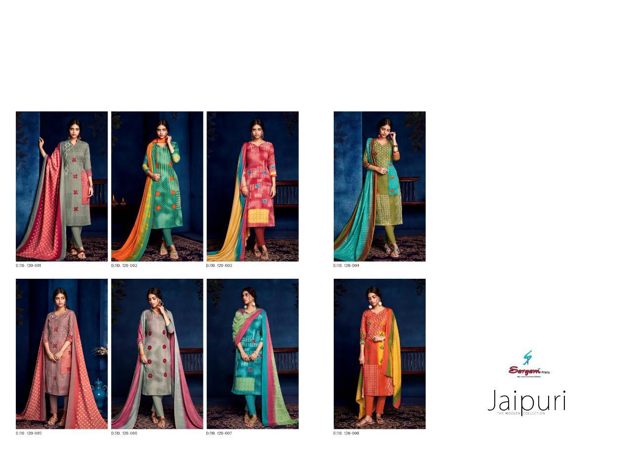 SARGAM PRINTS Presents **JAIPURI** Fabric Details Top: PURE PASHMINA PRINT WITH KHATLI HAND WORK Bottom :PURE PASHMINA Dupatta: PURE PASHMINA PRINTED SHAWL Designs: 8 PCS Rate: ₹625 HSN CODE: 5407 |
