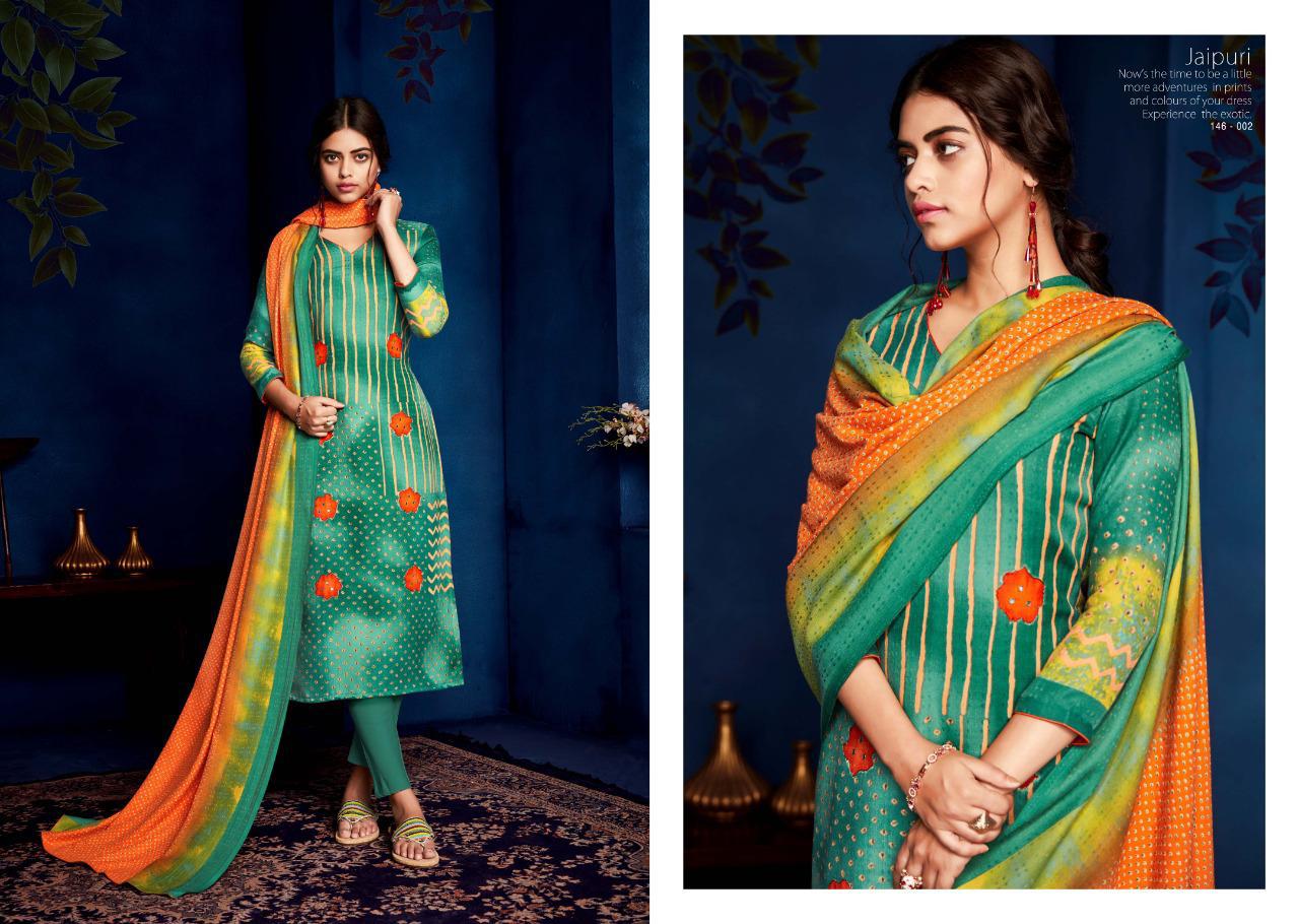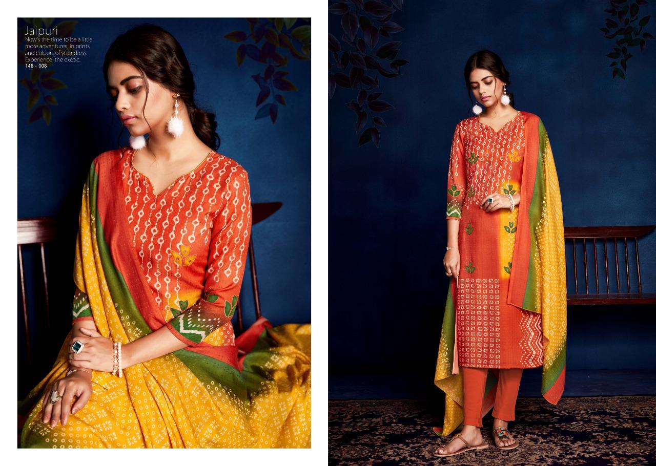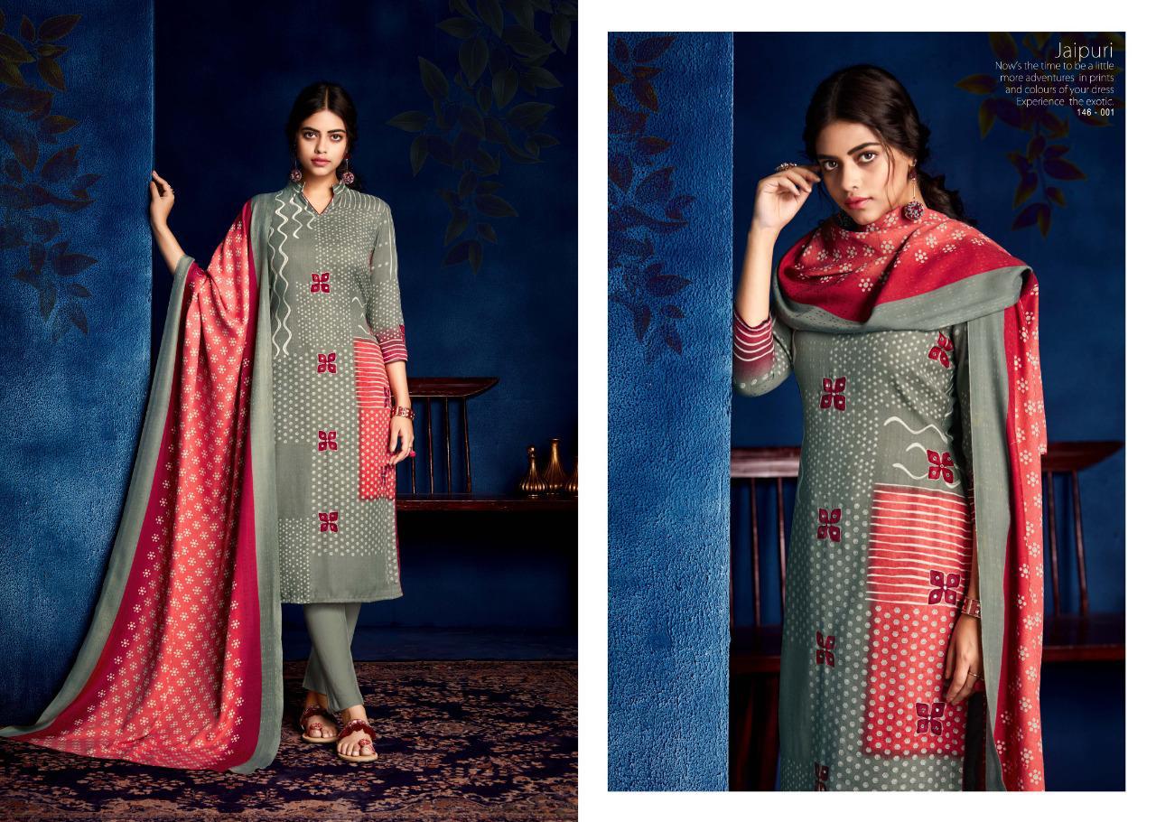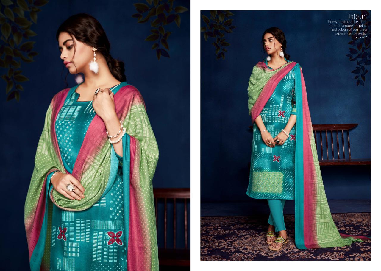 SARGAM PRINTS Presents **JAIPURI** Fabric Details Top: PURE PASHMINA PRINT WITH KHATLI HAND WORK Bottom :PURE PASHMINA Dupatta: PURE PASHMINA PRINTED SHAWL Designs: 8 PCS Rate: ₹625 HSN CODE: 5407 |