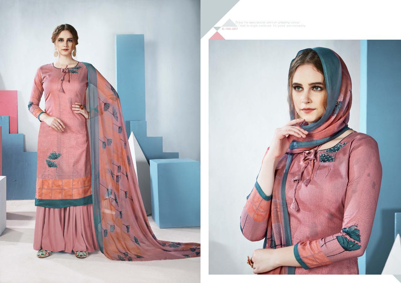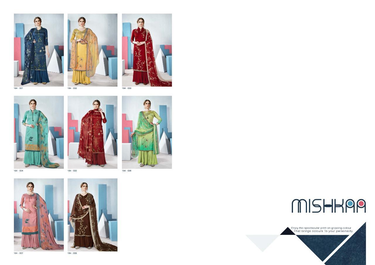 SARGAM PRINTS Presents **MISHKAA** Fabric Details Top: PURE PASHMINA PRINT WITH SHISHA KHATLI WORK Bottom :* PASHMINA DYED Dupatta: PURE PASHMINA SHAWL PRINTED Designs: 8 PCS Rate: 650₹ HSN CODE: 5407 |