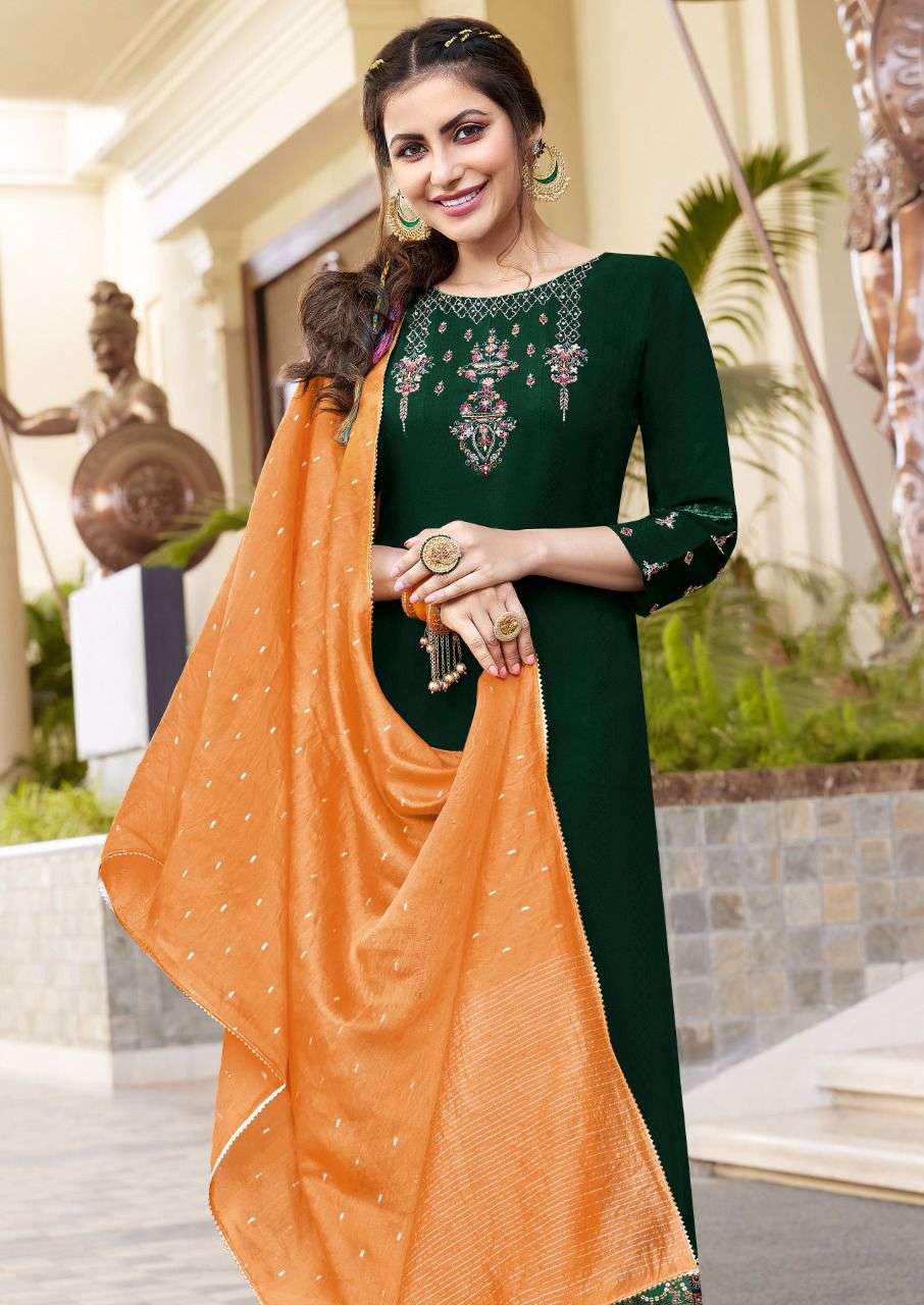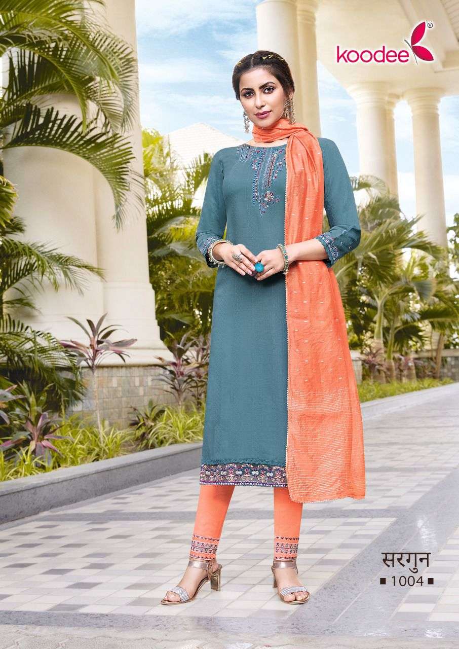 KOODEE Launching Kurti Pant With Dupatta Sets Brand Name : KOODEE Catalog : Sargun -1 Designs : 6 Fabric:- Bottom :- Lining Cotton Slub Lycra With Embroidery Work Duppata :- Chanderi with jacquard butti Work: Embroidery + Khatli Work Size : S(36),M(38), L(40), XL(42), 2XL(44), 3XL(46) Dispatching :- 3 to 4 days |