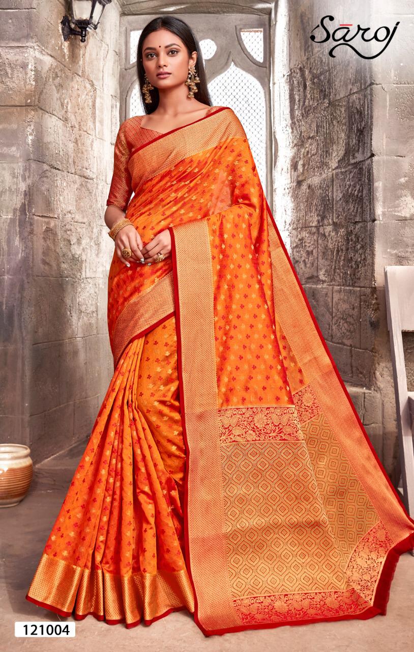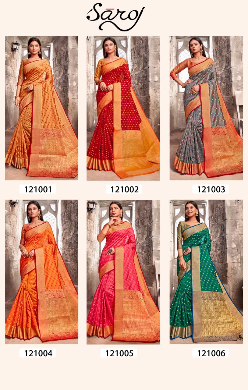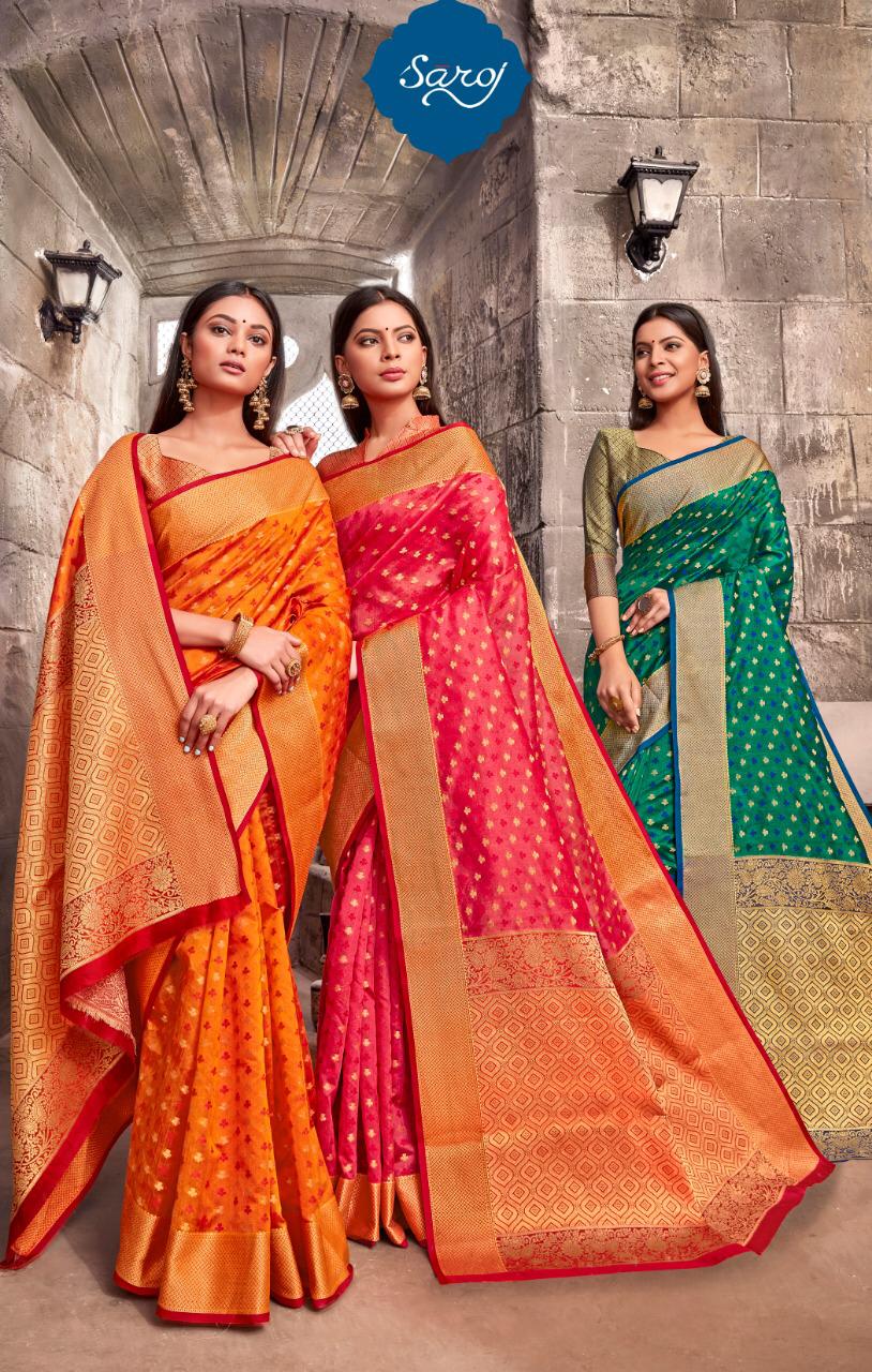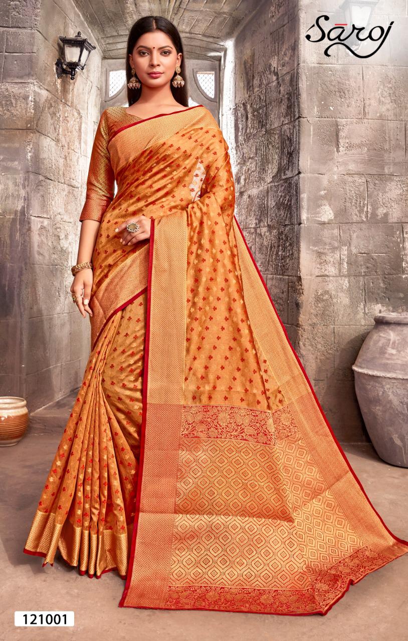 SAROJ Kesar Silk (Rs.1155) Fabric: Repair Jacquard (Banarsi Silk). Blouse: Repair Jaq. 6 Designs |