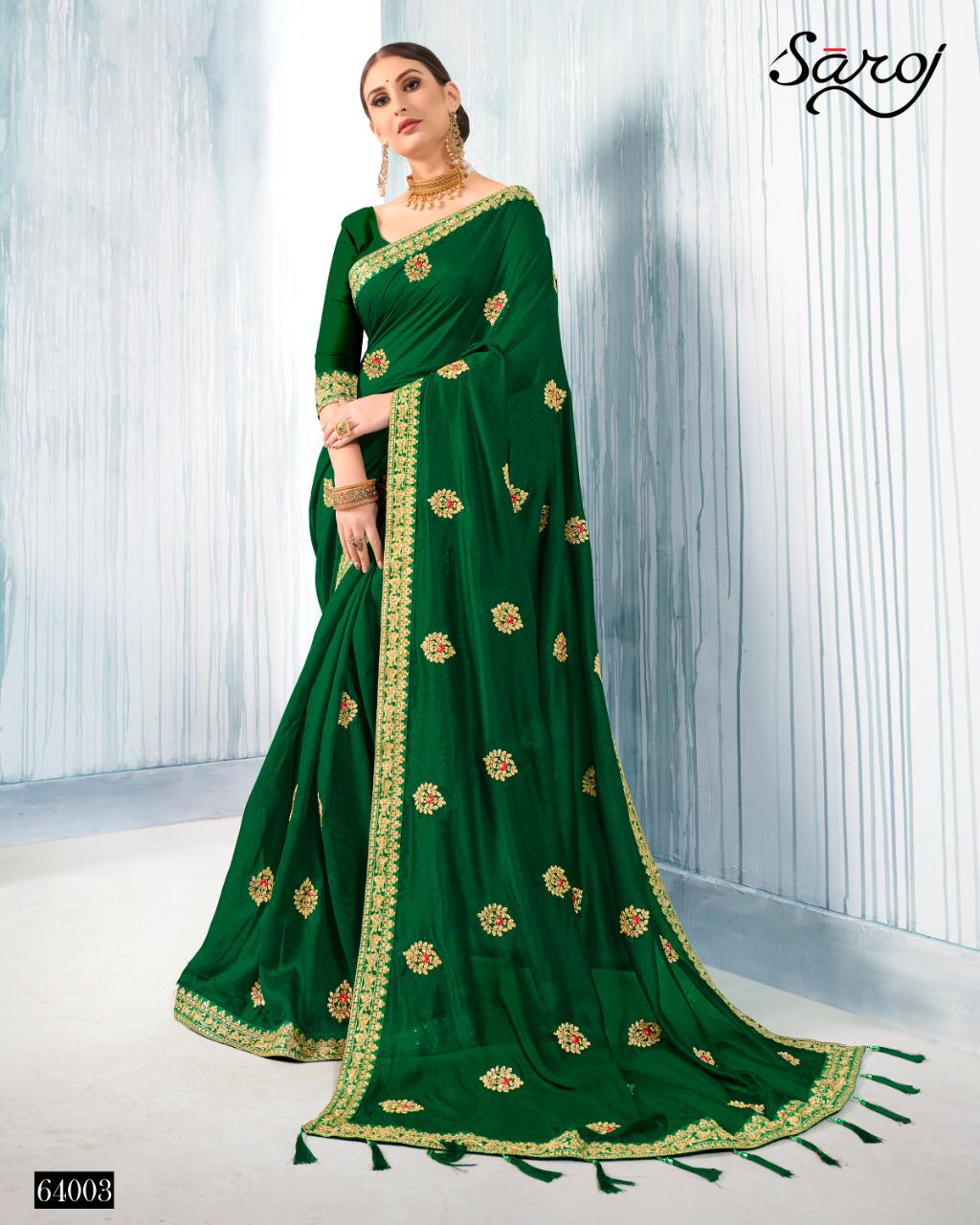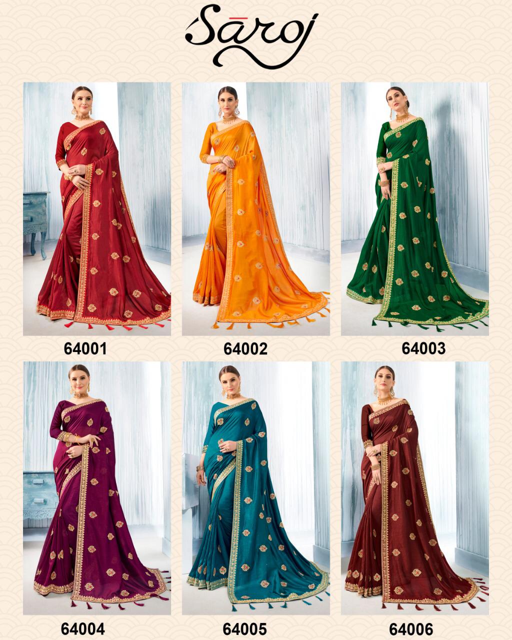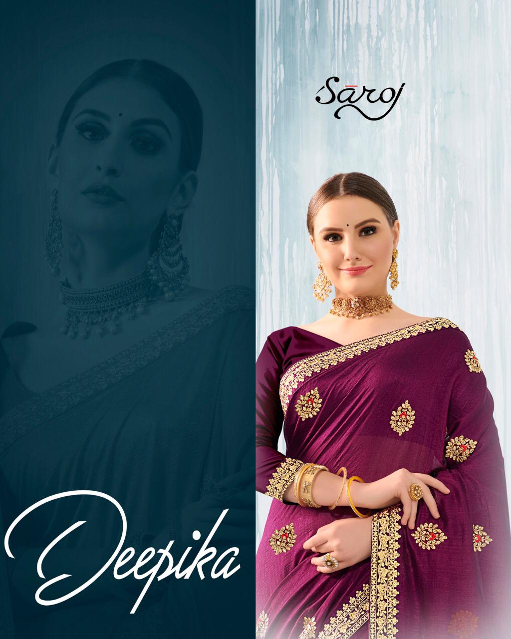 SAROJ PRESENT Deepika (Rs.1095) Fabric: PxC Vichitra Silk with simple border. Blouse: PxC Vichitra Silk. 6 Designs |