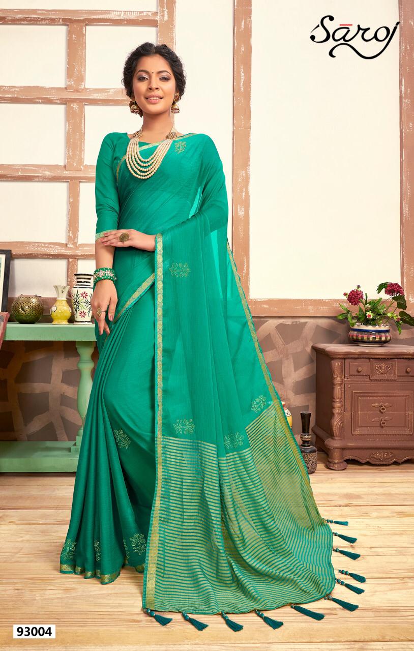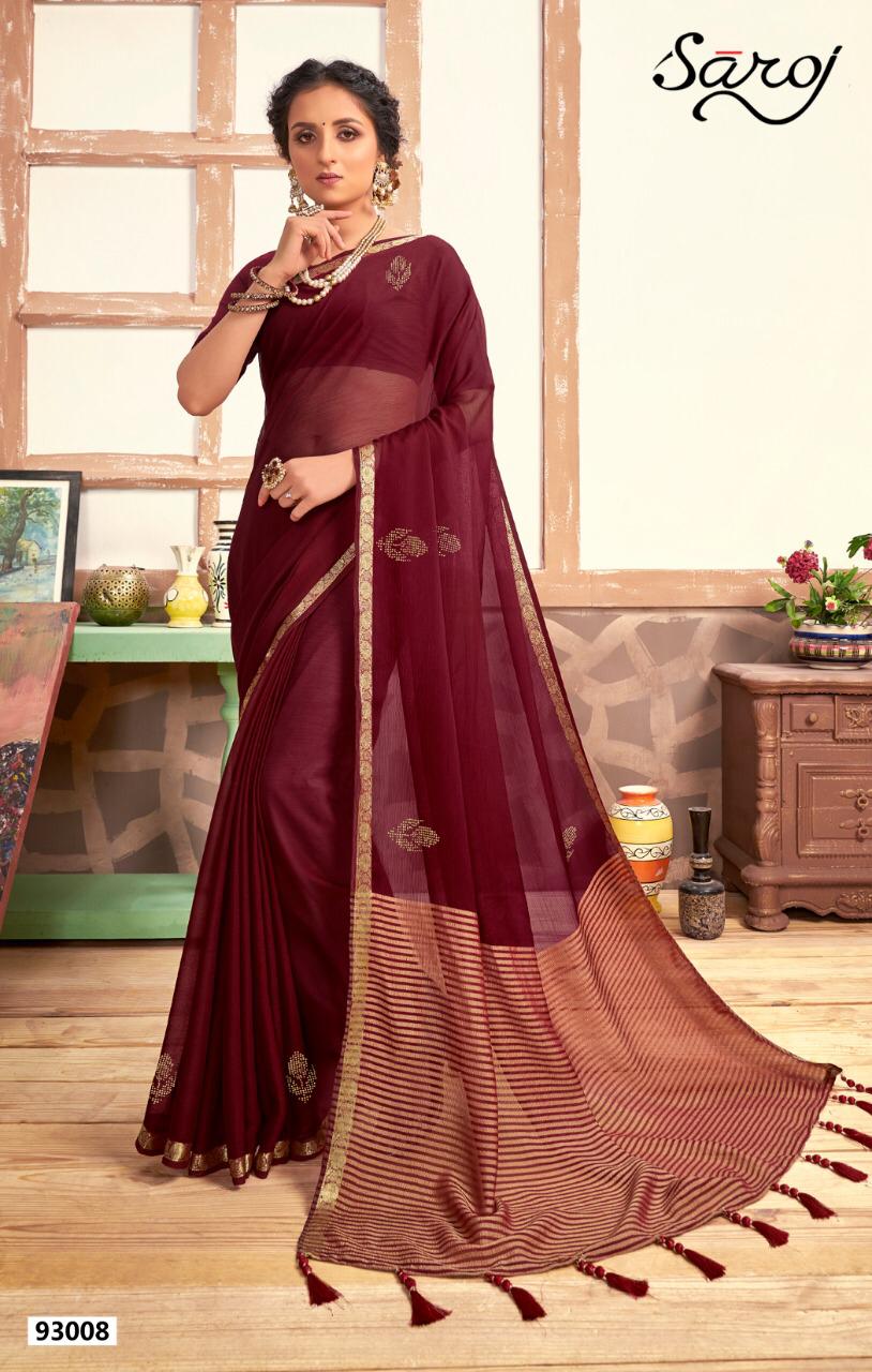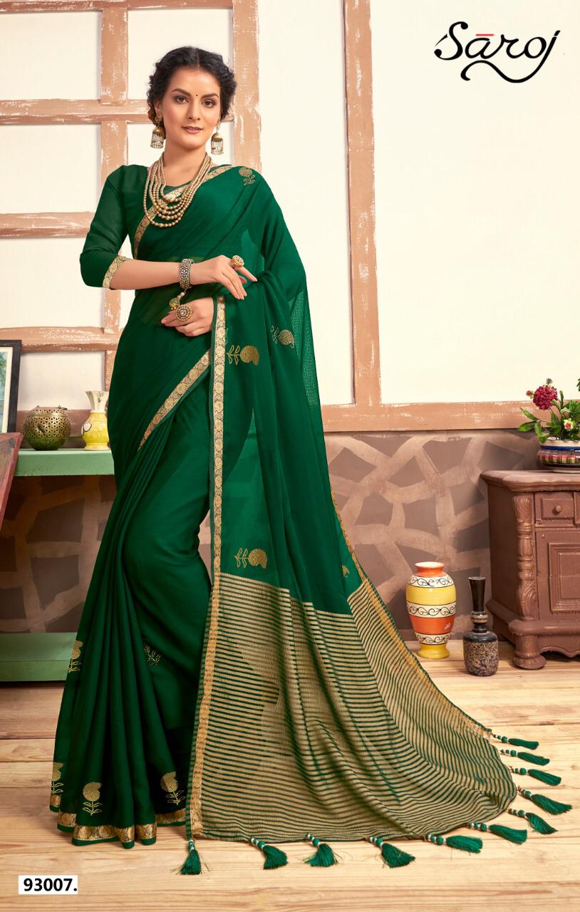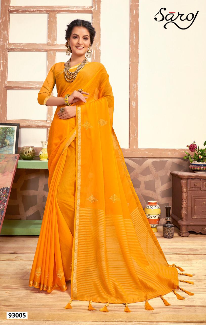 SAROJ Mahi (Rs.1205) Fabric: Chiffon with swarovski butta and silk pallu. Blouse: Chiffon. 8 Designs |