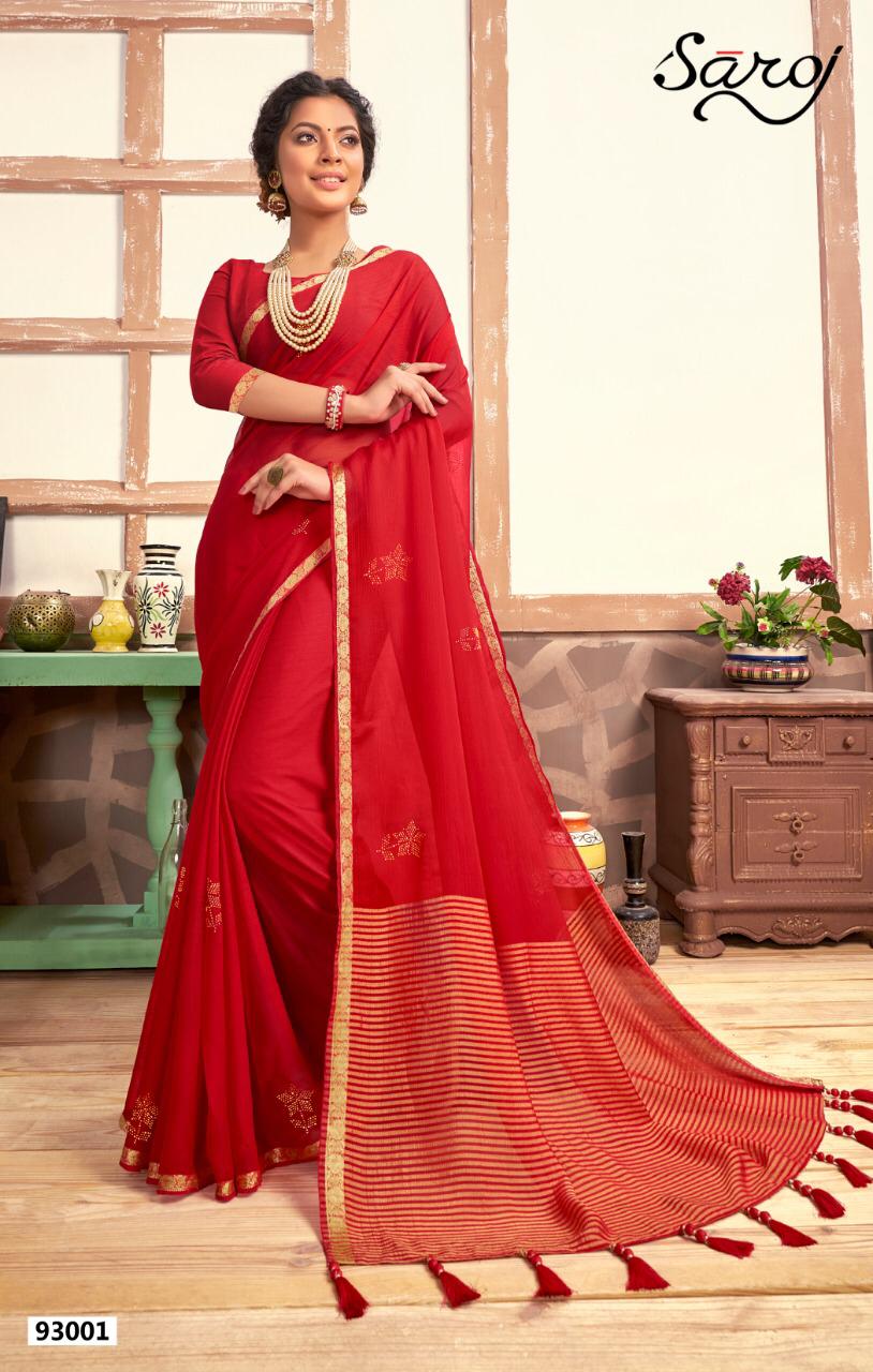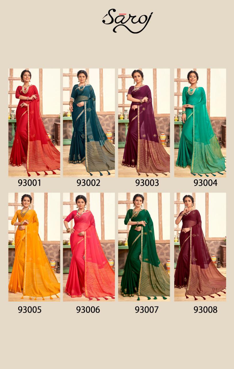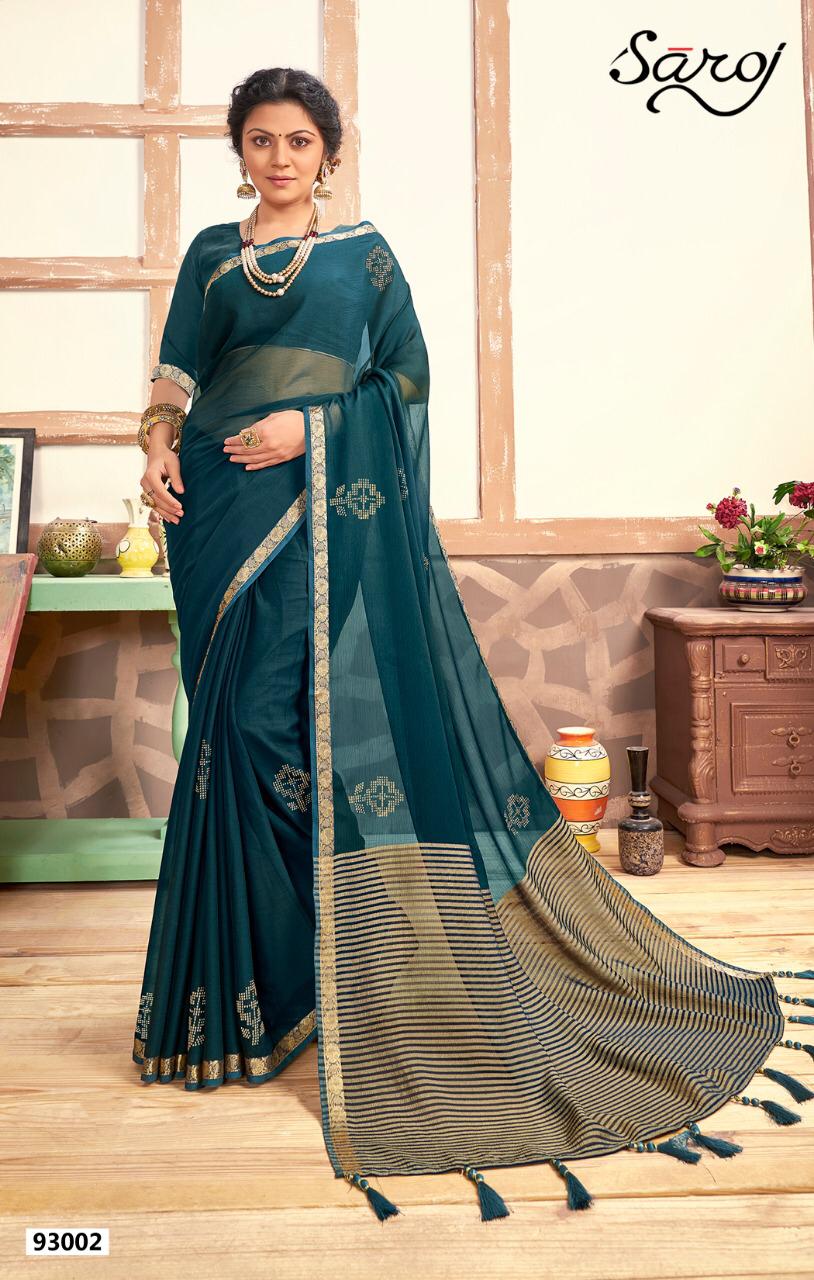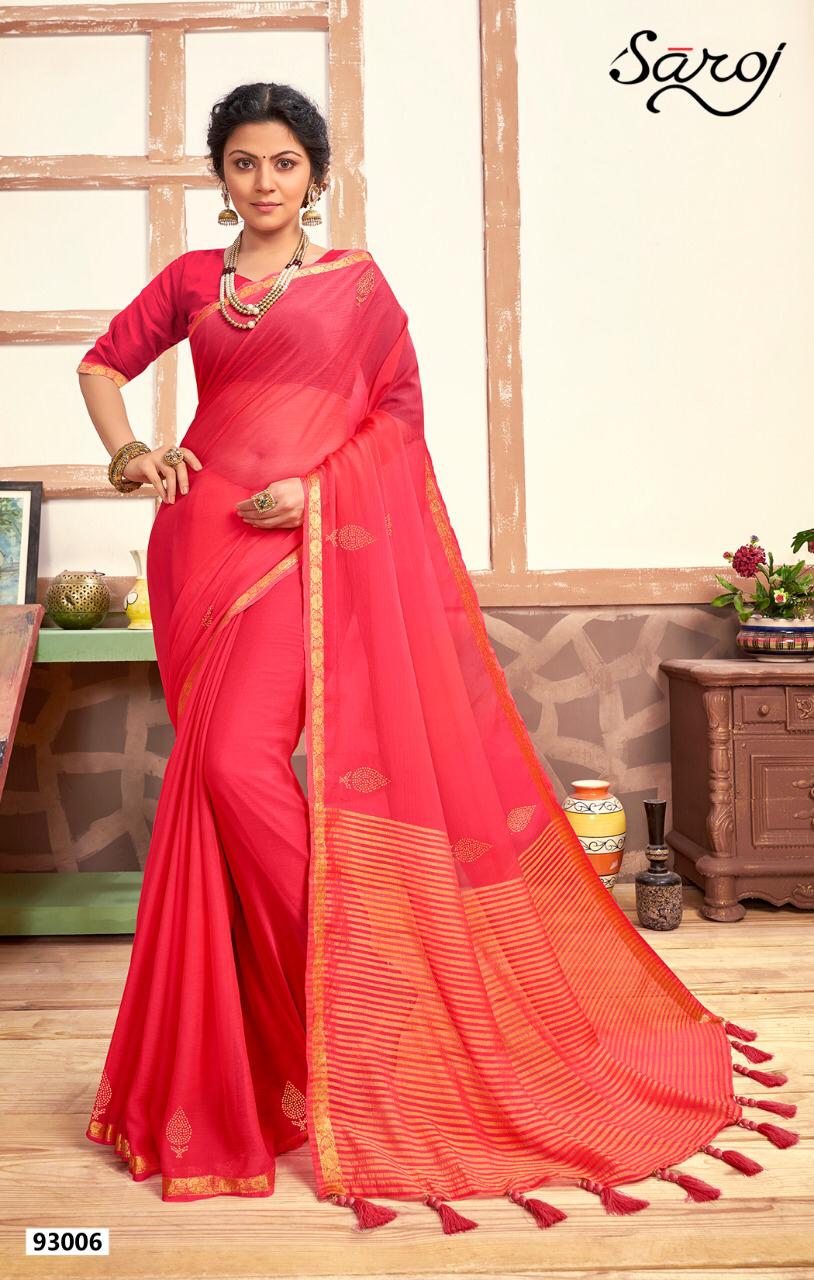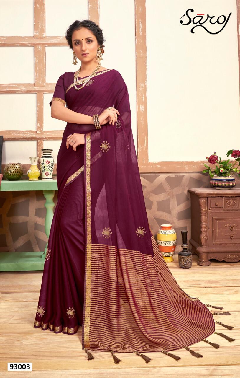 SAROJ Mahi (Rs.1205) Fabric: Chiffon with swarovski butta and silk pallu. Blouse: Chiffon. 8 Designs |