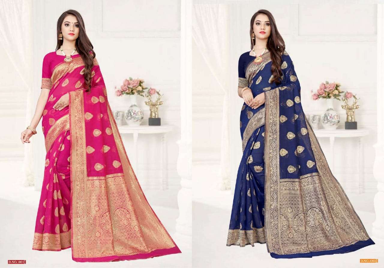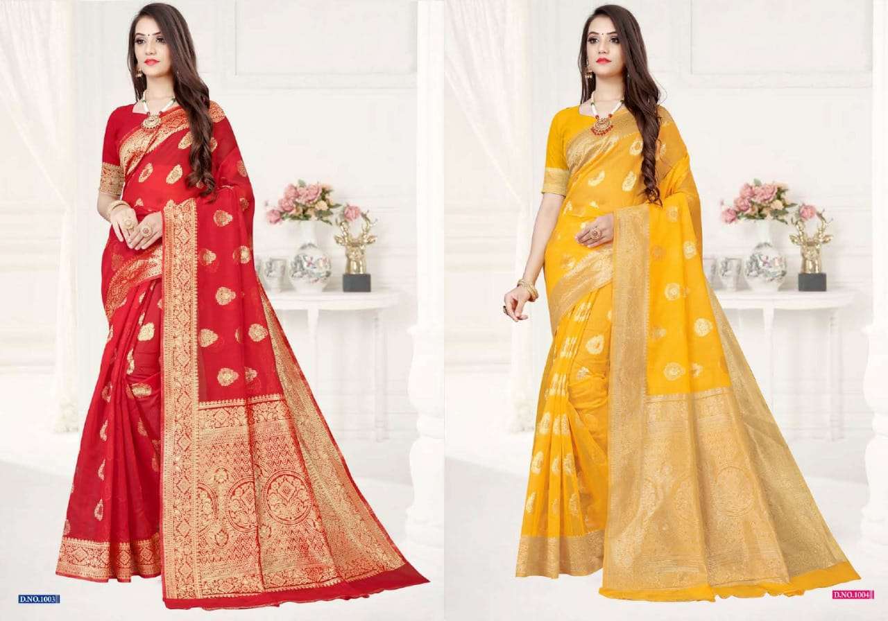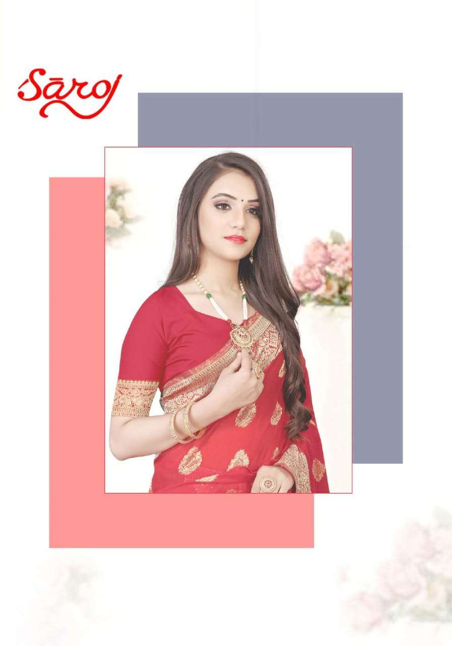 Brand- saroj Mandira Vol-2 (Rs.630 per pcs ) Set to aet .. Fabric: Soft Cotton Silk with Viscose Jari Butta and Border with Heavy Pallu. Blouse: Soft Cotton with Viscose Border. 4 Design in set. Set to set. Delivery from today |