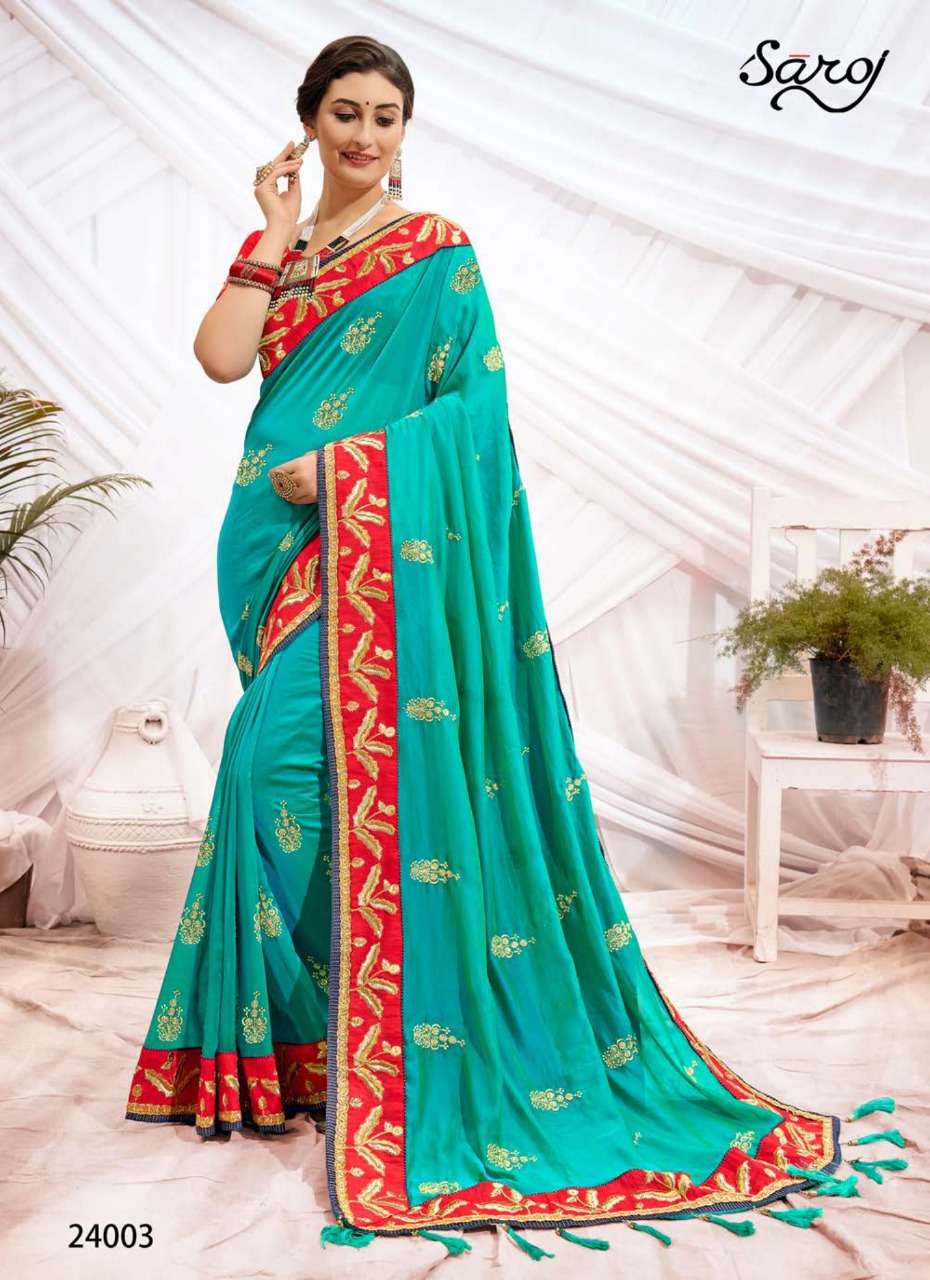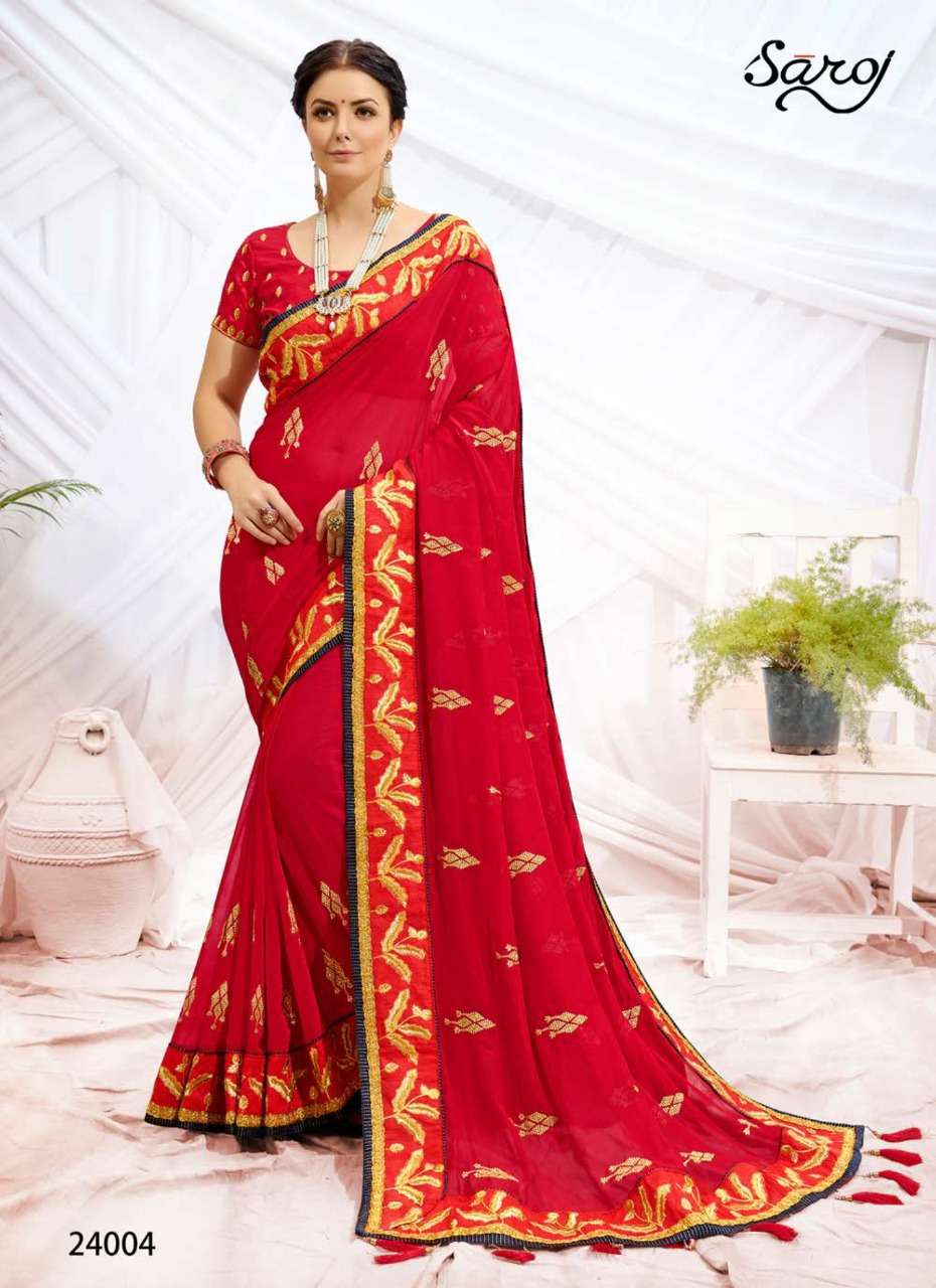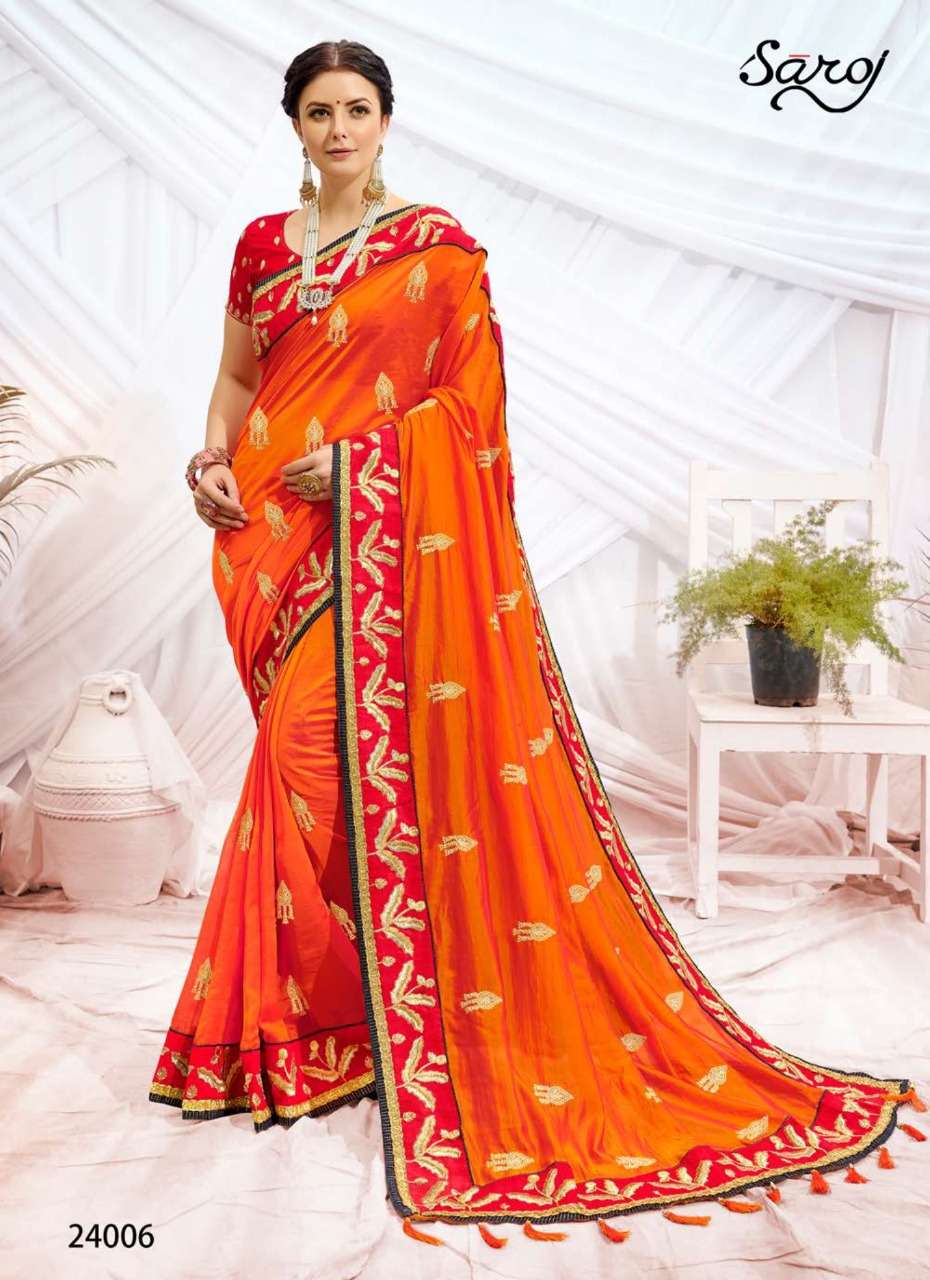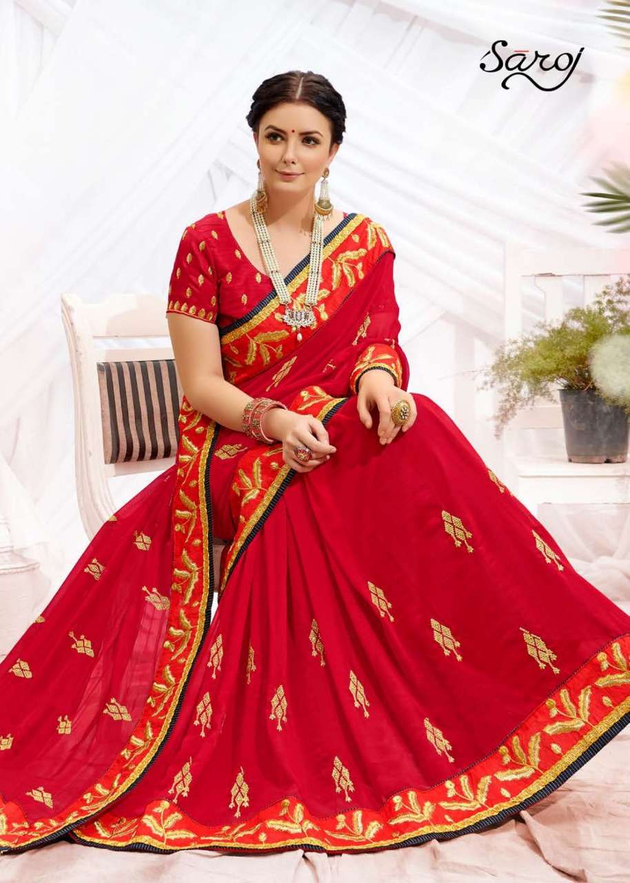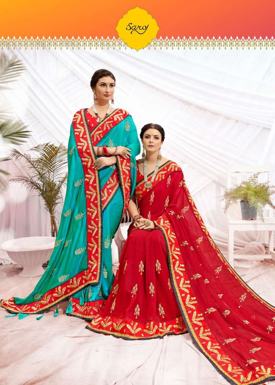 SAROJ Rudraksh (Rs.1315) Fabric: Heavy Dupion with embroidery butta and beautiful work border lace. Blouse: Silk work butti saree. 6 Design |