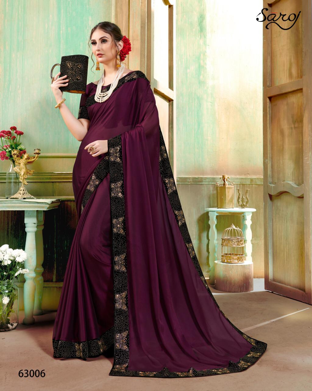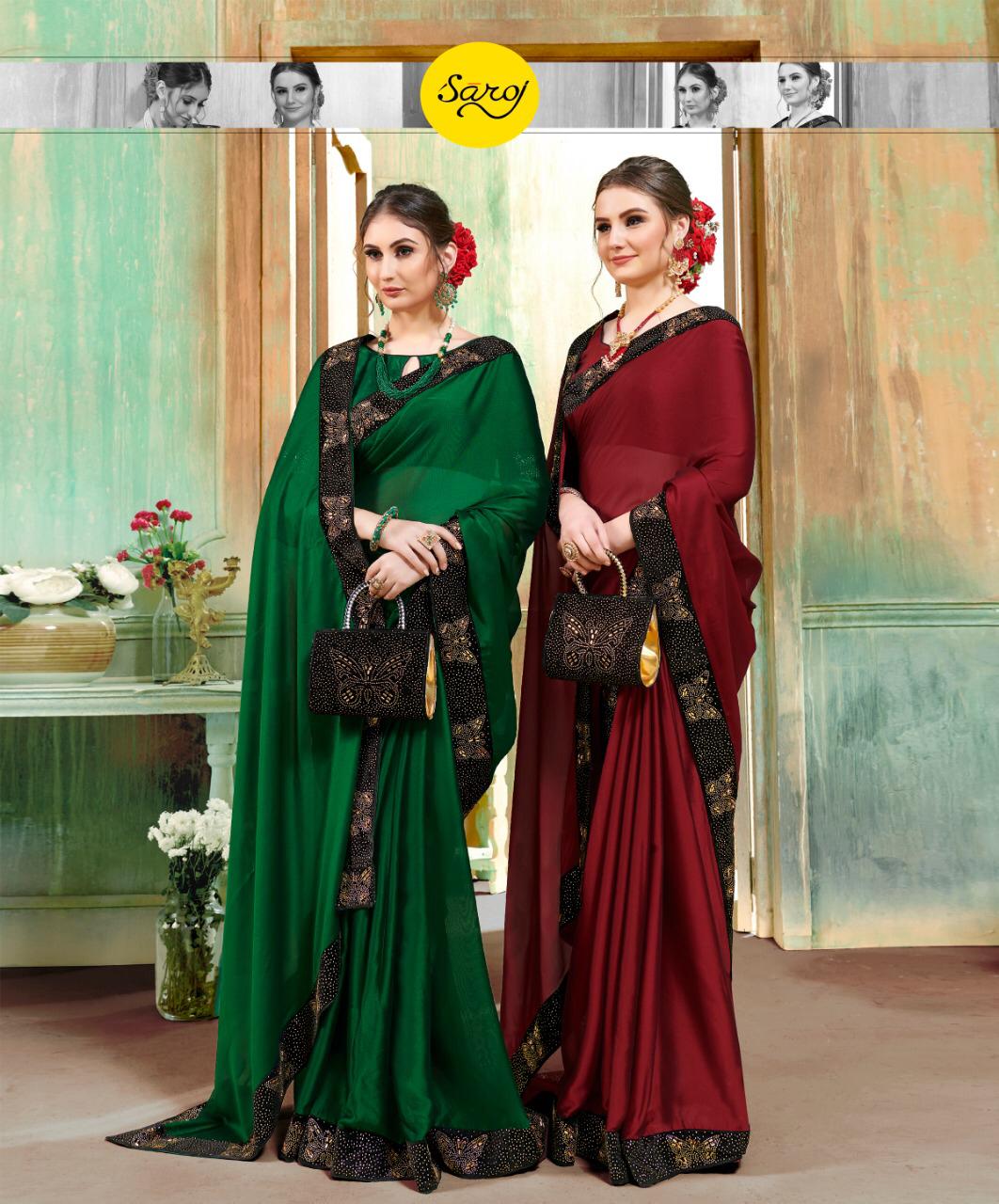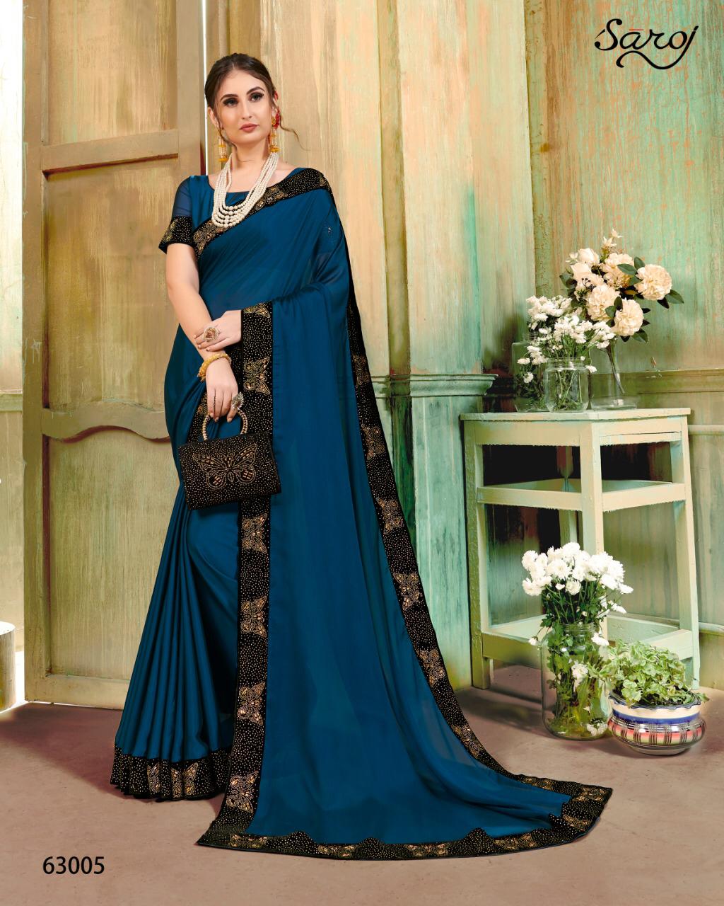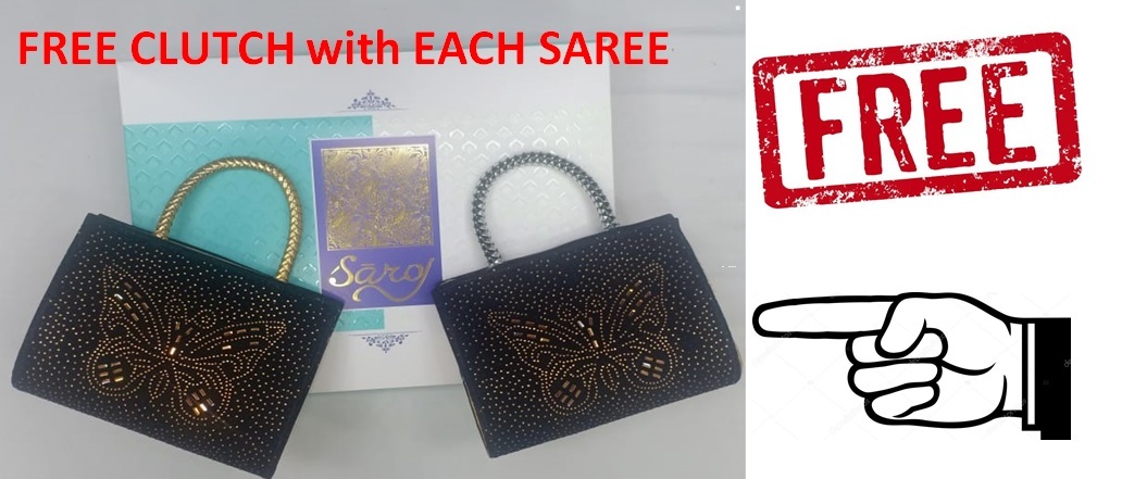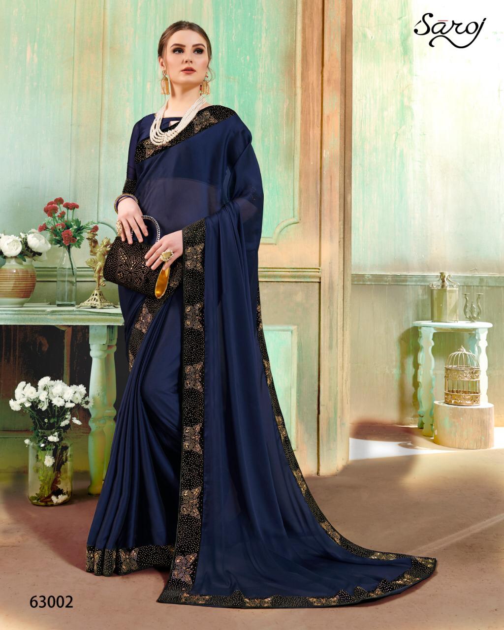 SAROJ PRESENT Sapphire (Rs.1315) FREE FREE Fancy CLUTCH Each Saree Fabric: Black Rangoli with swarovski border Blouse: Black Rangoli with swarovski border 6 Designs |