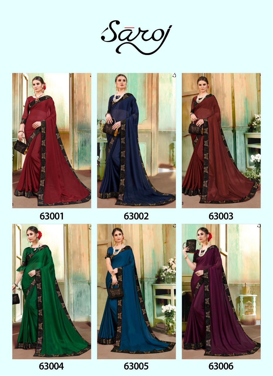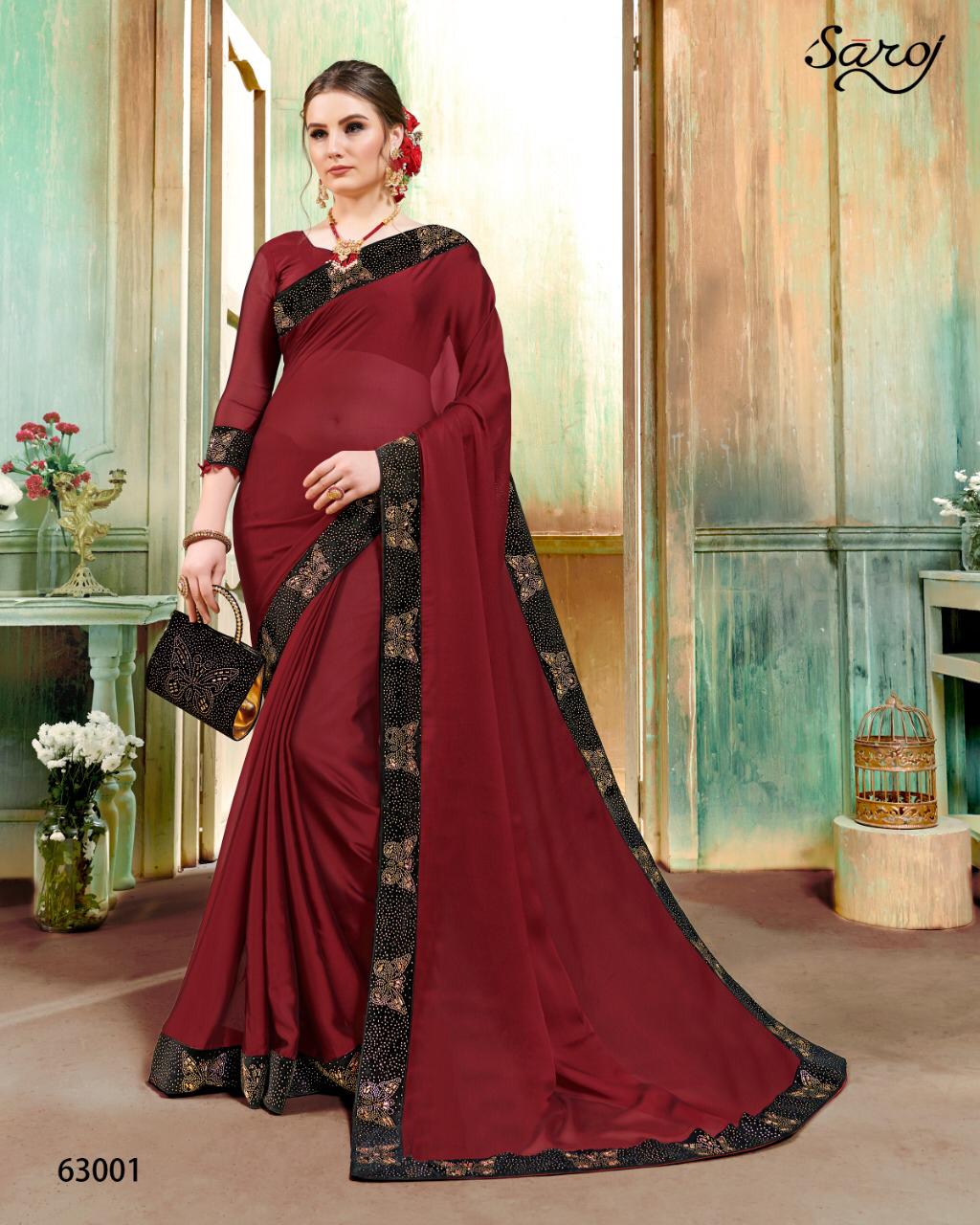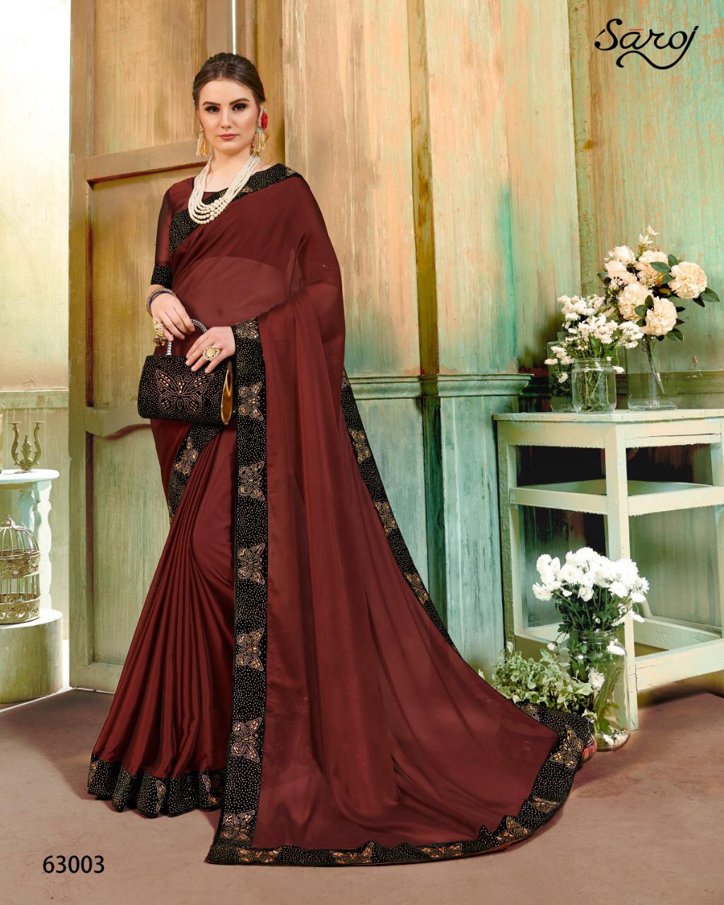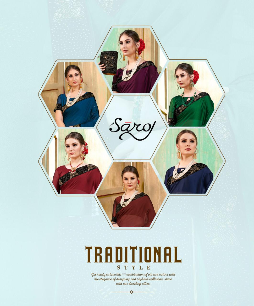 SAROJ PRESENT Sapphire (Rs.1315) FREE FREE Fancy CLUTCH Each Saree Fabric: Black Rangoli with swarovski border Blouse: Black Rangoli with swarovski border 6 Designs |