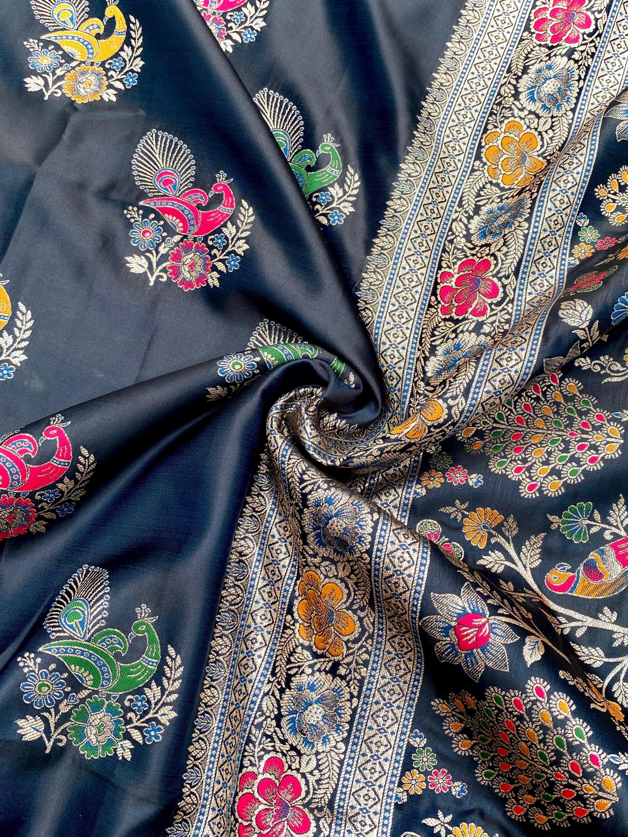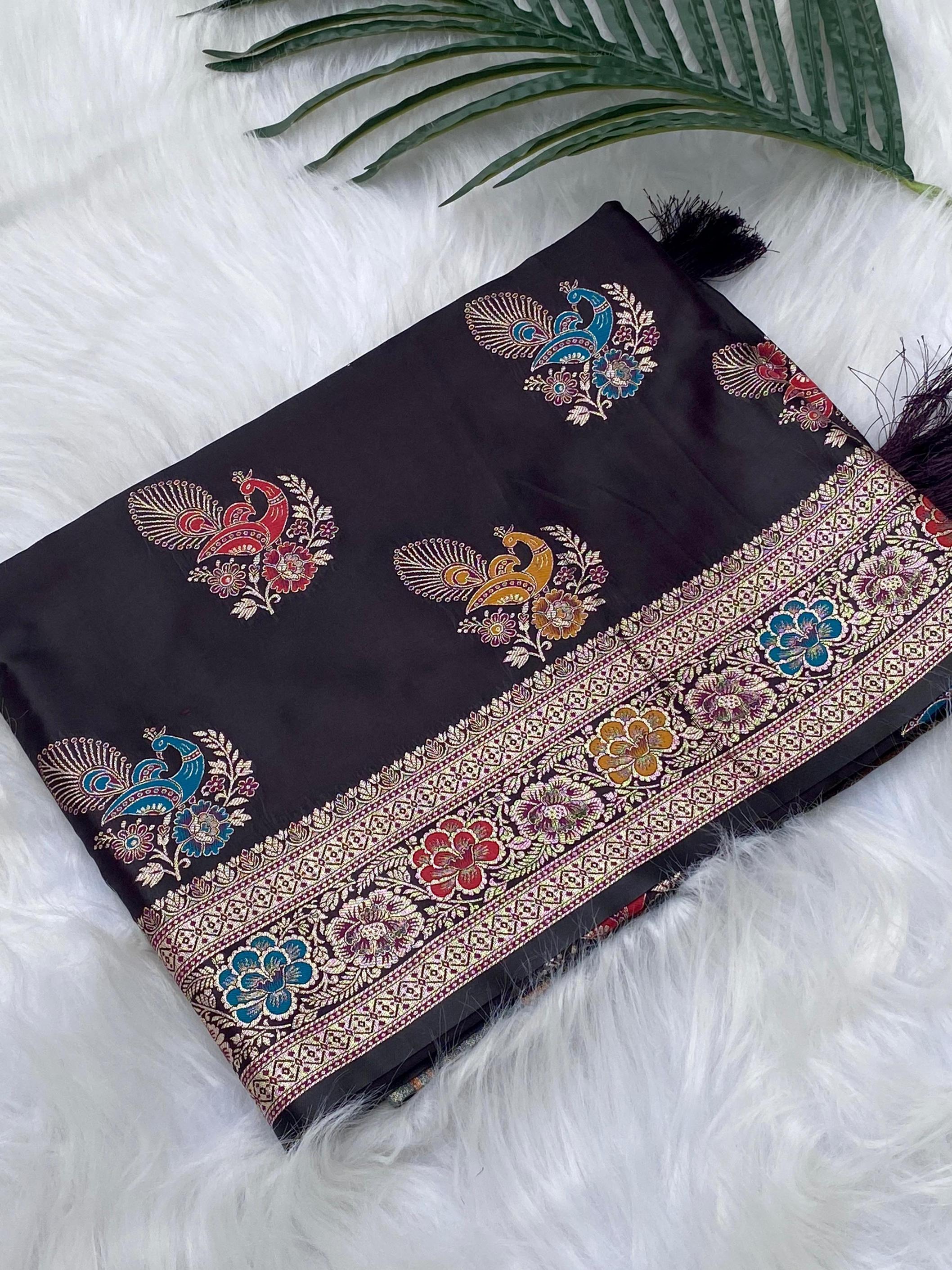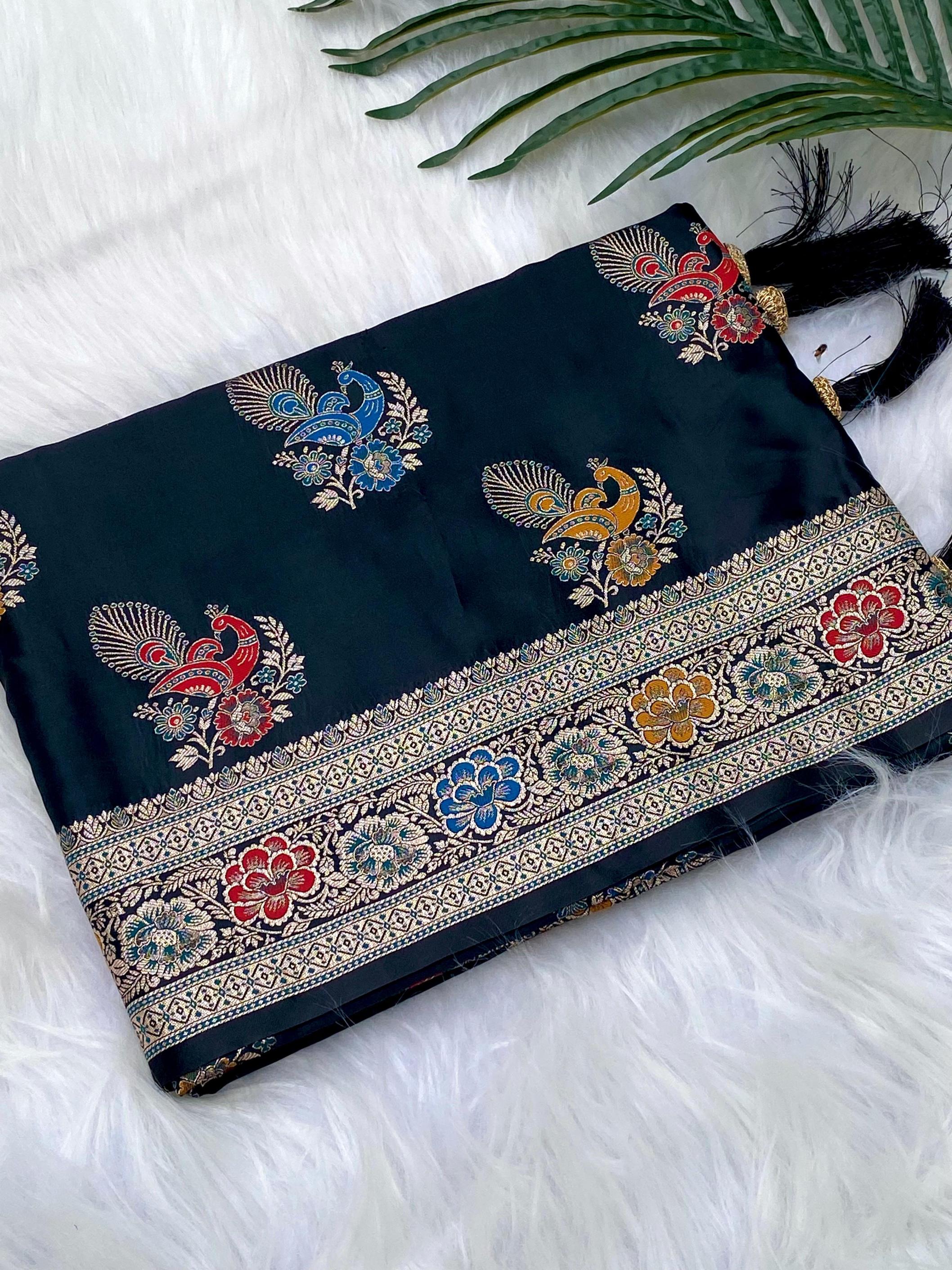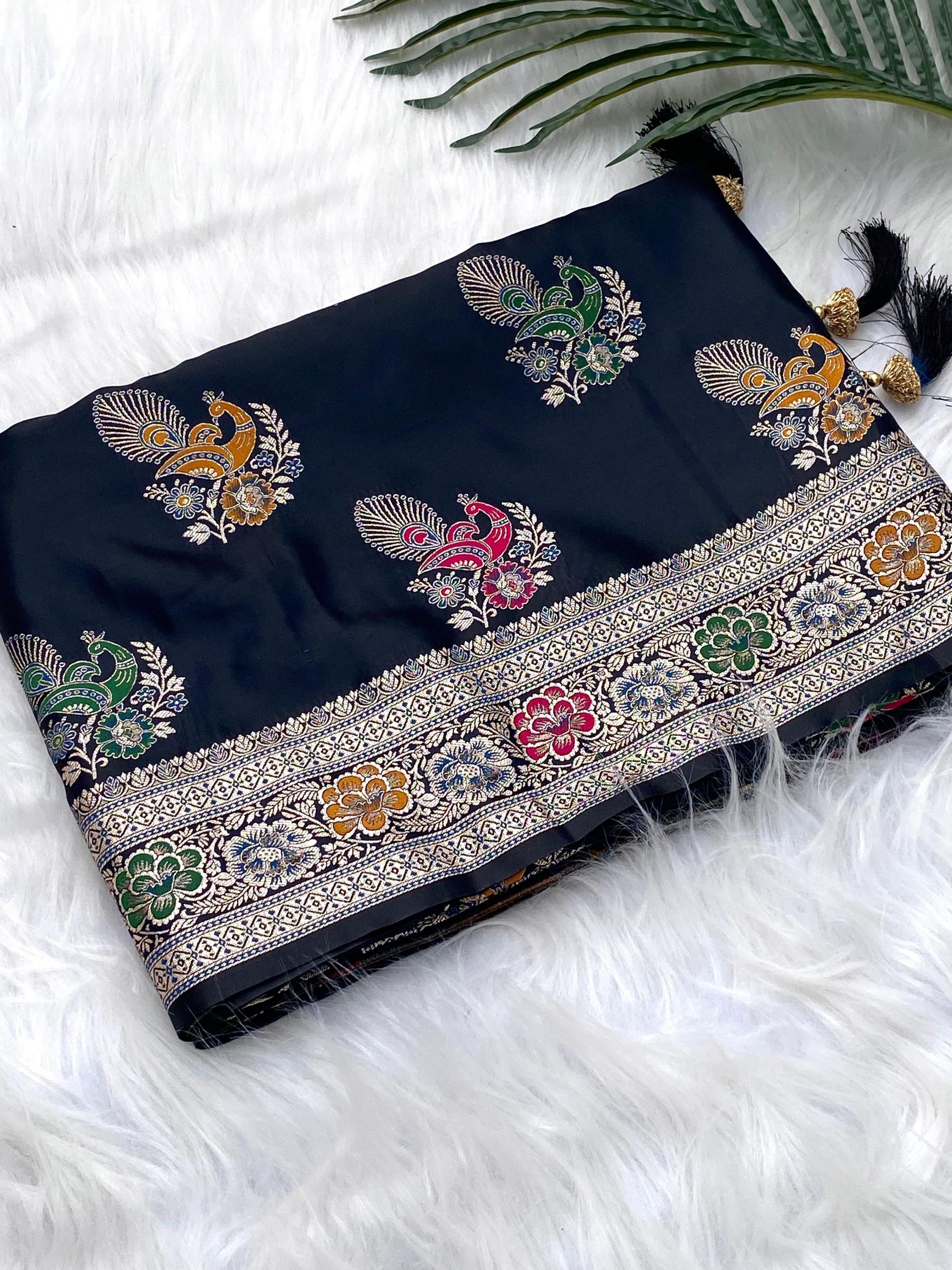 Premium collection. Catalogue: Satin Mor Description : Mushro satin sarees with beautiful Peacock Motif weaving design all over saree with Rich Pallu and Brocade Blouse along with Beautiful tassels. Color Options : 4 beautiful. Teamed with beautiful blouse Price :- 1499/- Limited stock, grab soon. 100% Genuine Quality. |