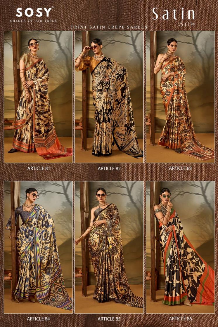 Brand : Sosy Catalog : Satin Silk Series : Article-81 TO Article-86 Saree : Printed Satin Crape Fabric Blouse : Satin Crape Price : 675/- +5%GST Occasion : Uniform Wear ,Casual Wear, Carnival Wear |