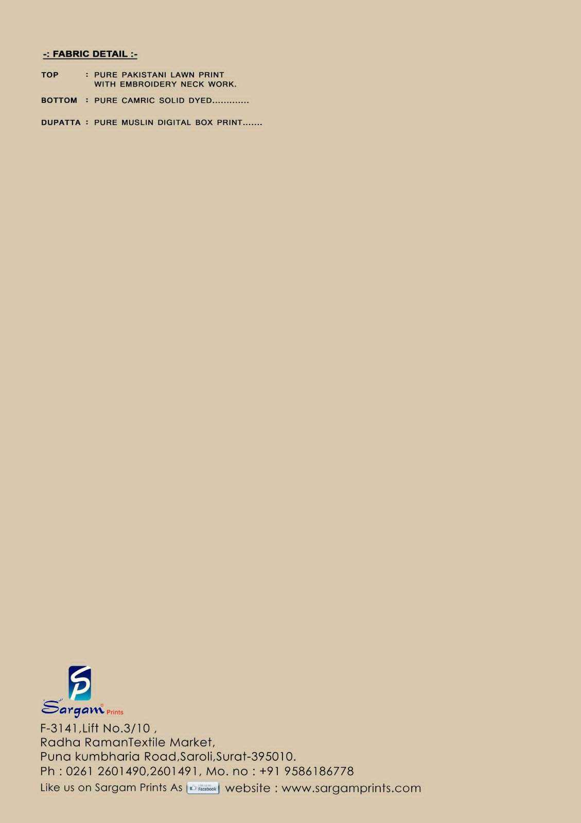 Brand - Sargam 🥇 Fabrics details🥇 👗*Top:- PURE PAKISTANI LAWN PRINTS WITH EMBROIDERY NECK WORK.