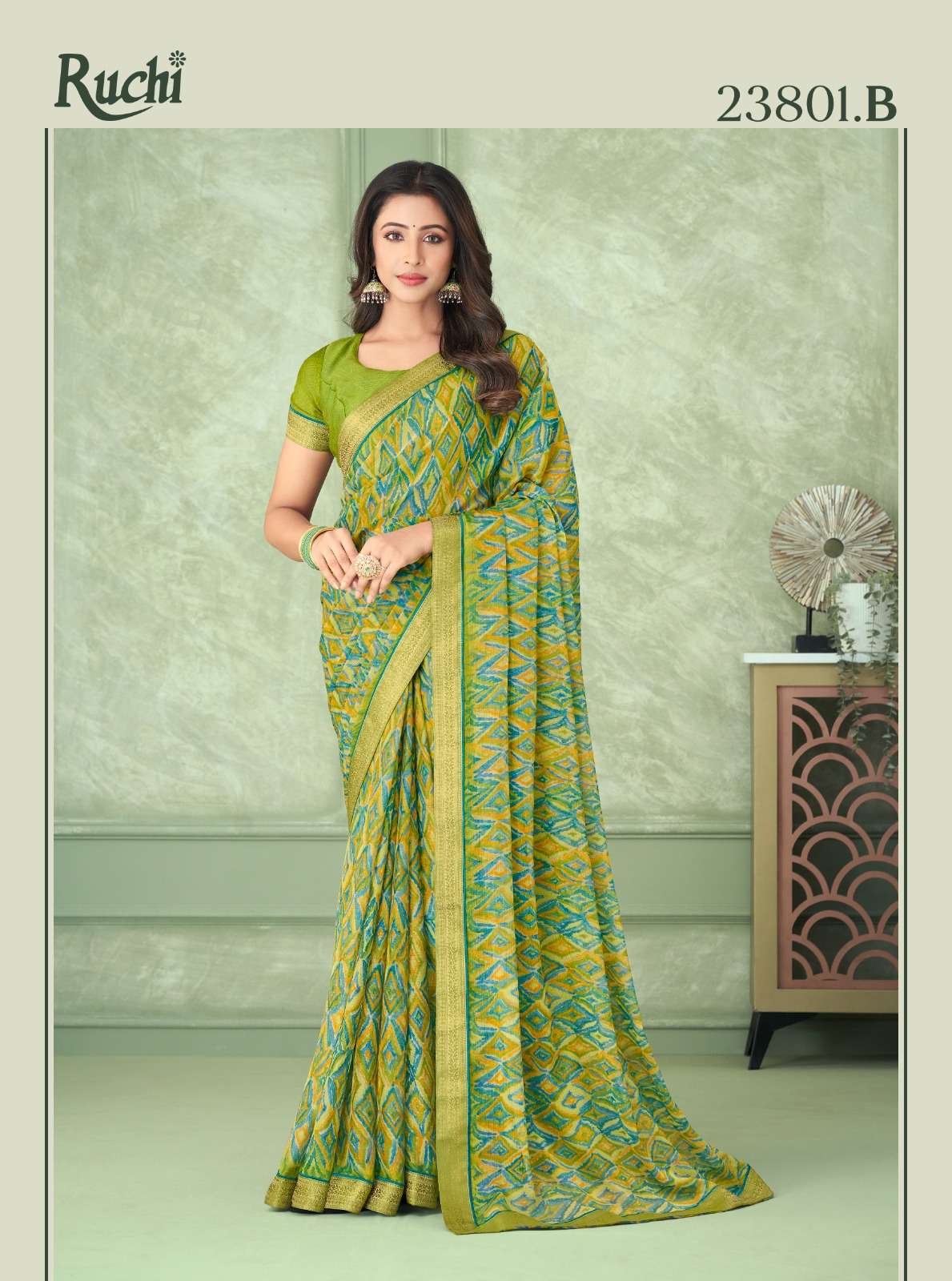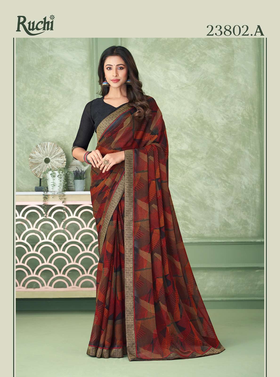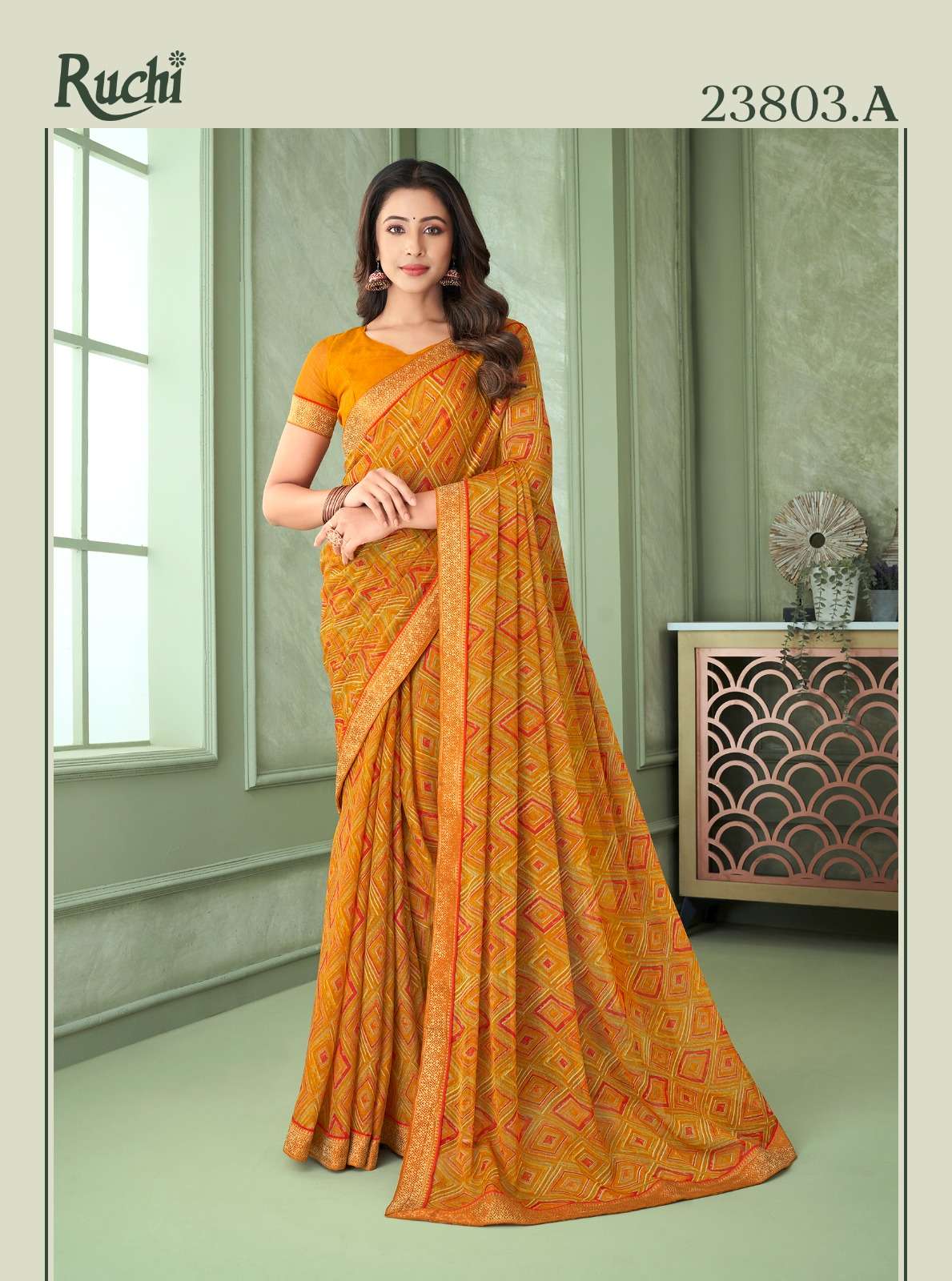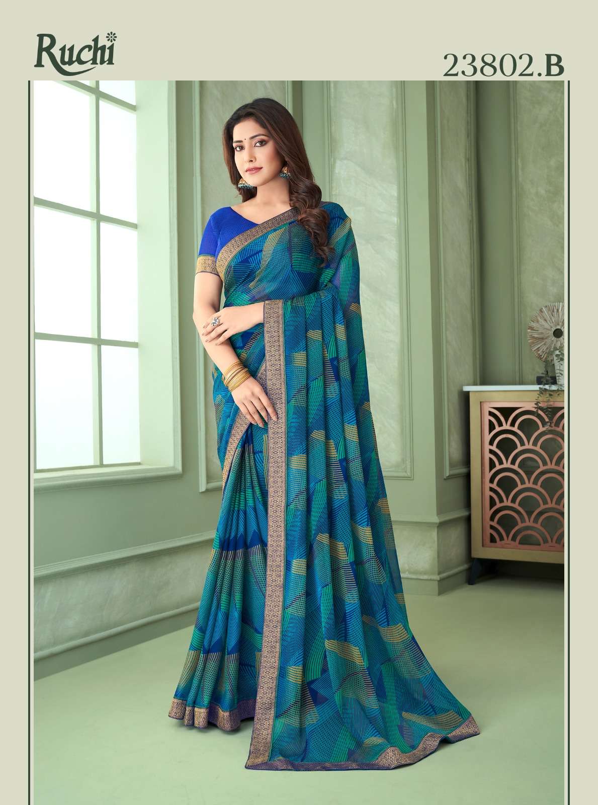 RUCHI SAREES CATALOG - SAVERA -6. FABRIC - CHIFFON SAREE WITH ATTACHED BANARSI BORDER. WEIGHT - 450 GRAMS APPROX. |