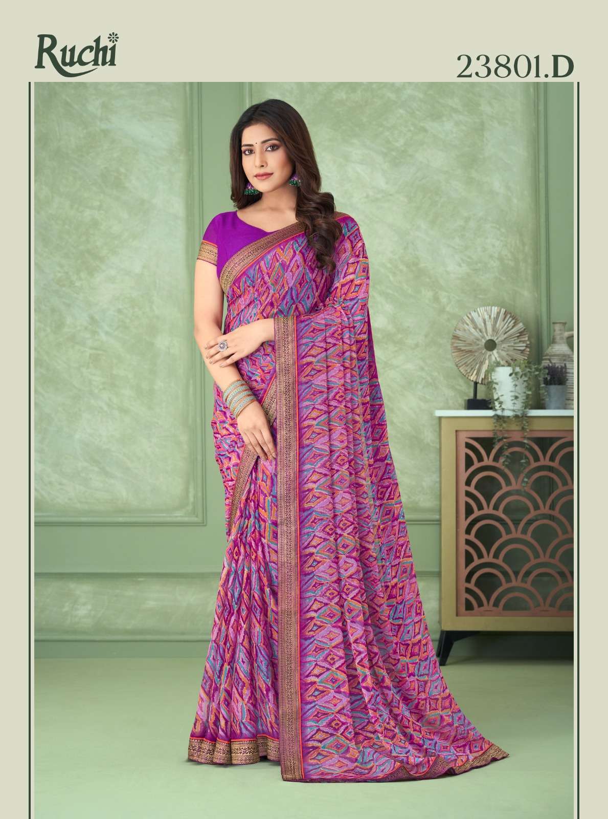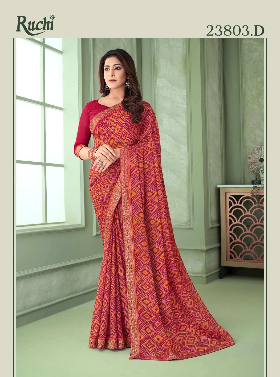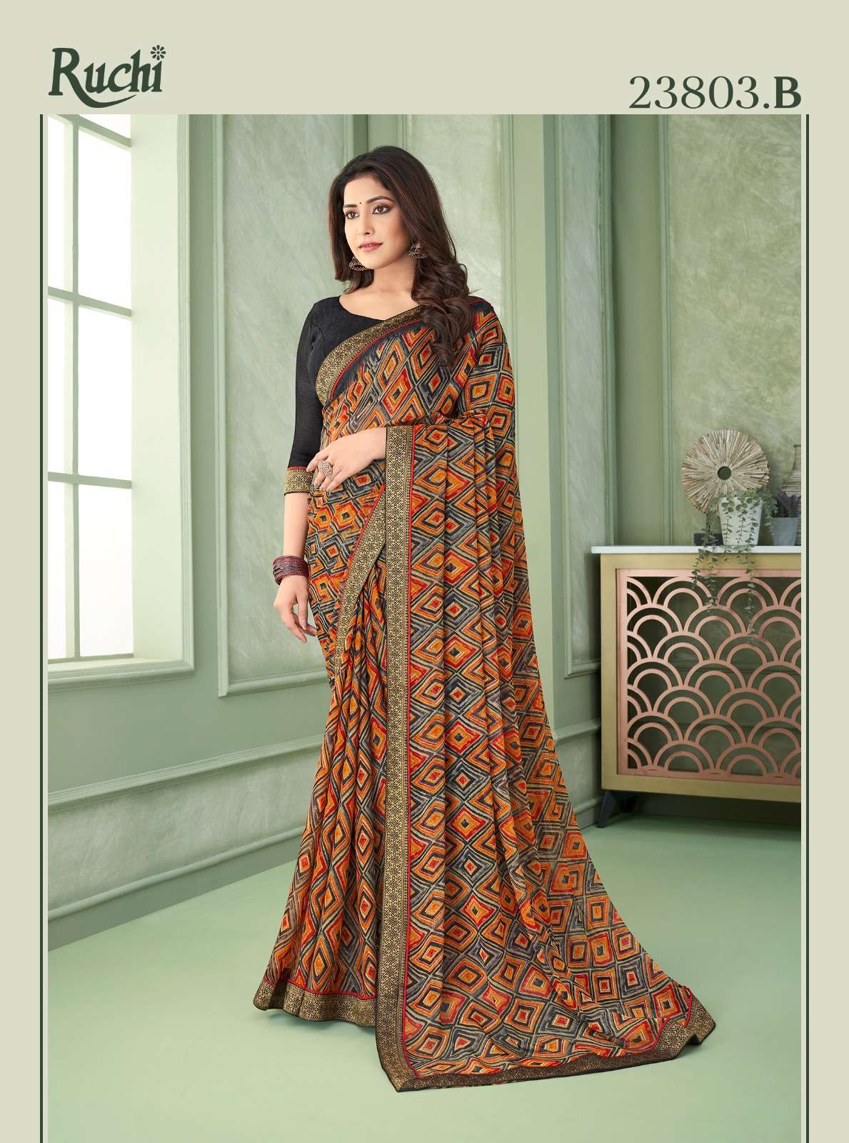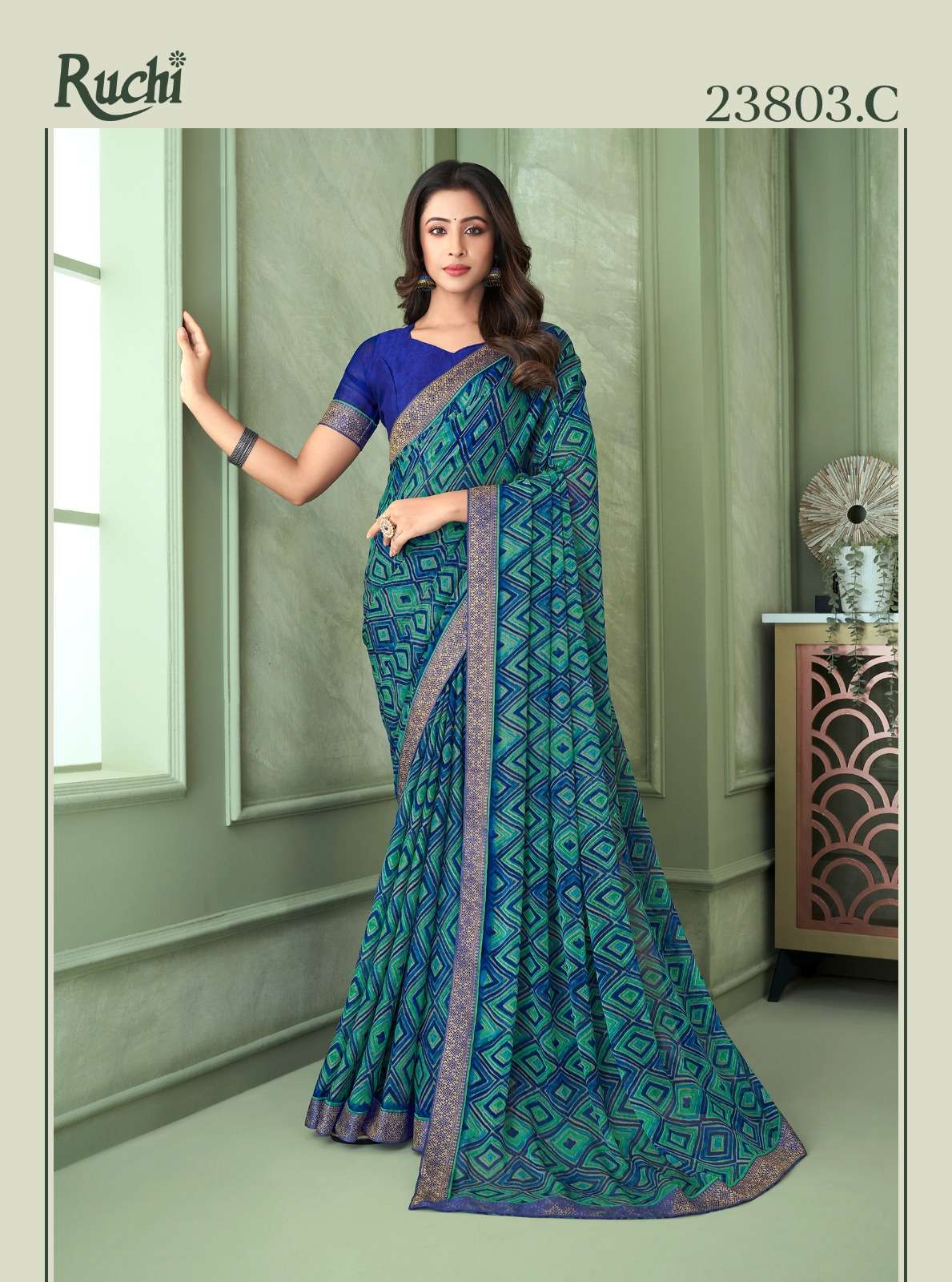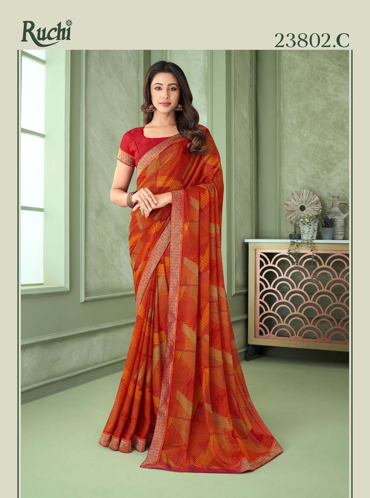 RUCHI SAREES CATALOG - SAVERA -6. FABRIC - CHIFFON SAREE WITH ATTACHED BANARSI BORDER. WEIGHT - 450 GRAMS APPROX. |