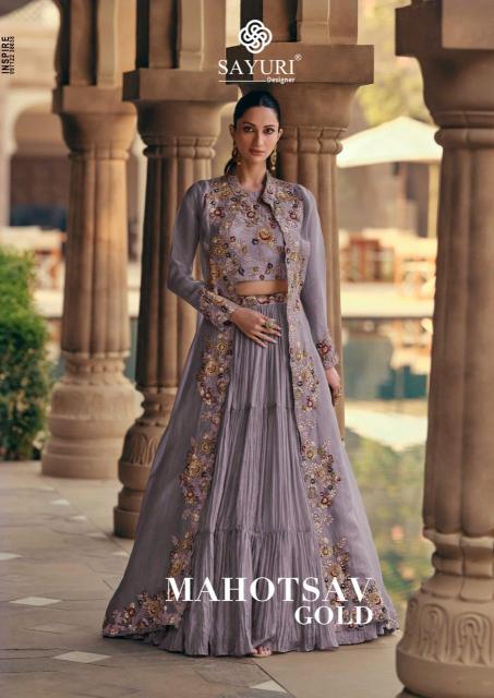 sayuri designer mahotsav gold full stitch chinon silk with shrug indo western dress