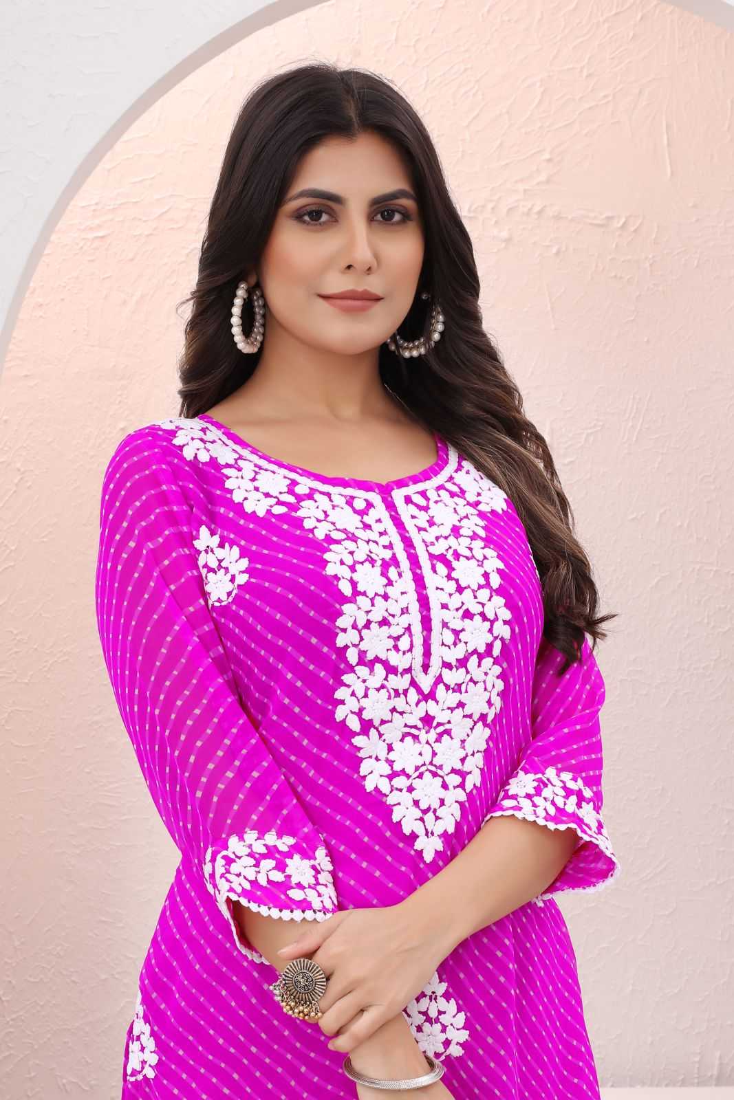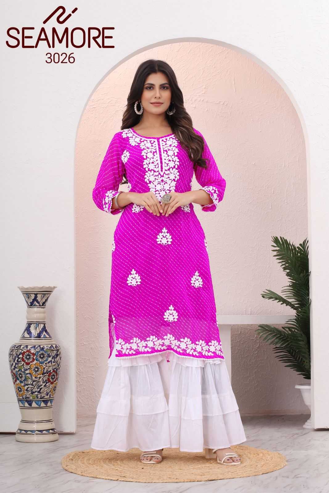 Brand - SEAMORE Design Nam - Lakhnavi Product typ - Women Only Kurti Design No - 3026 And 3027 Fabric - Digitally printed Chanderi silk Pattern - Hand Print patching Price - 699/- Order Set to Set |
