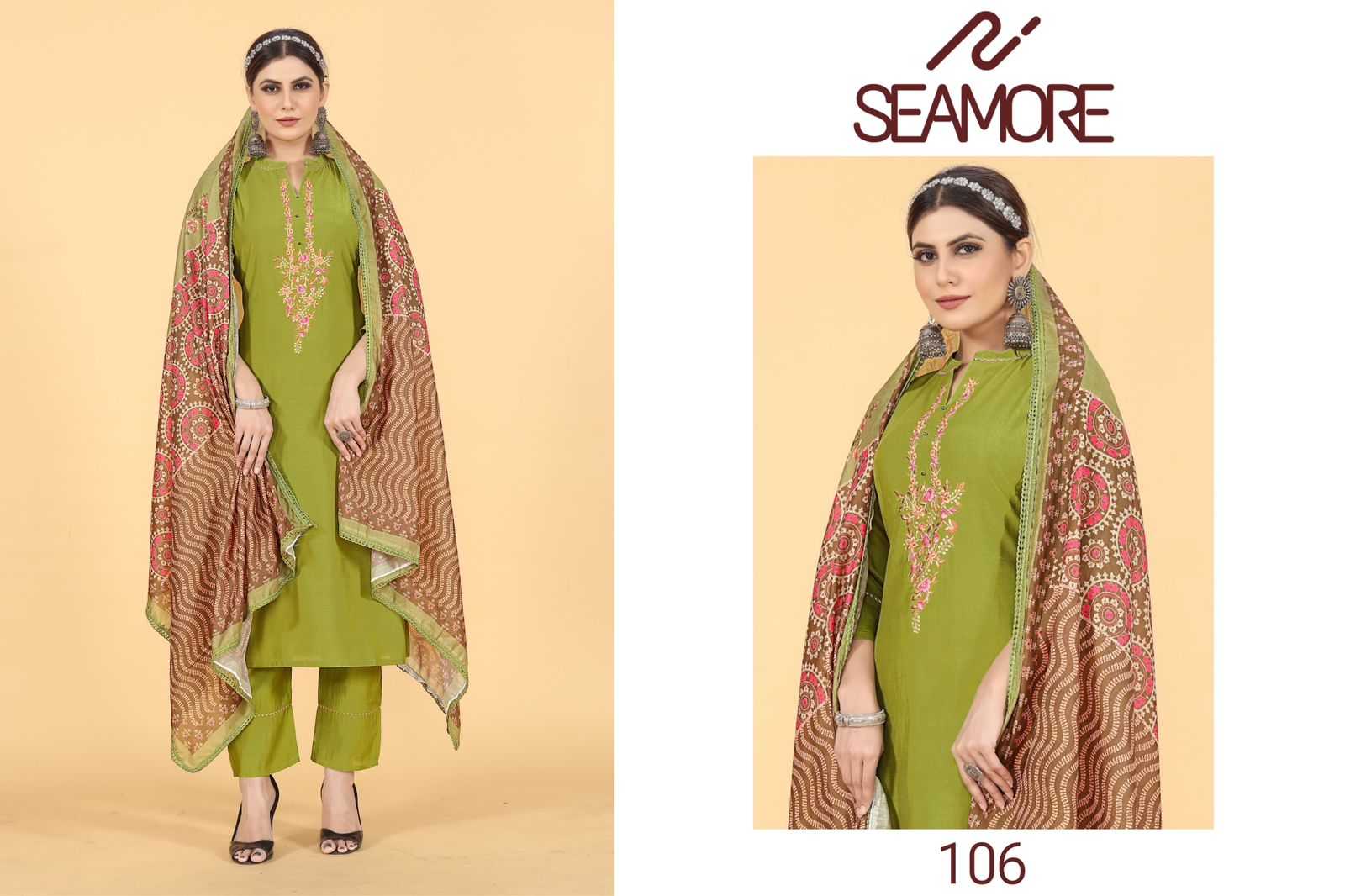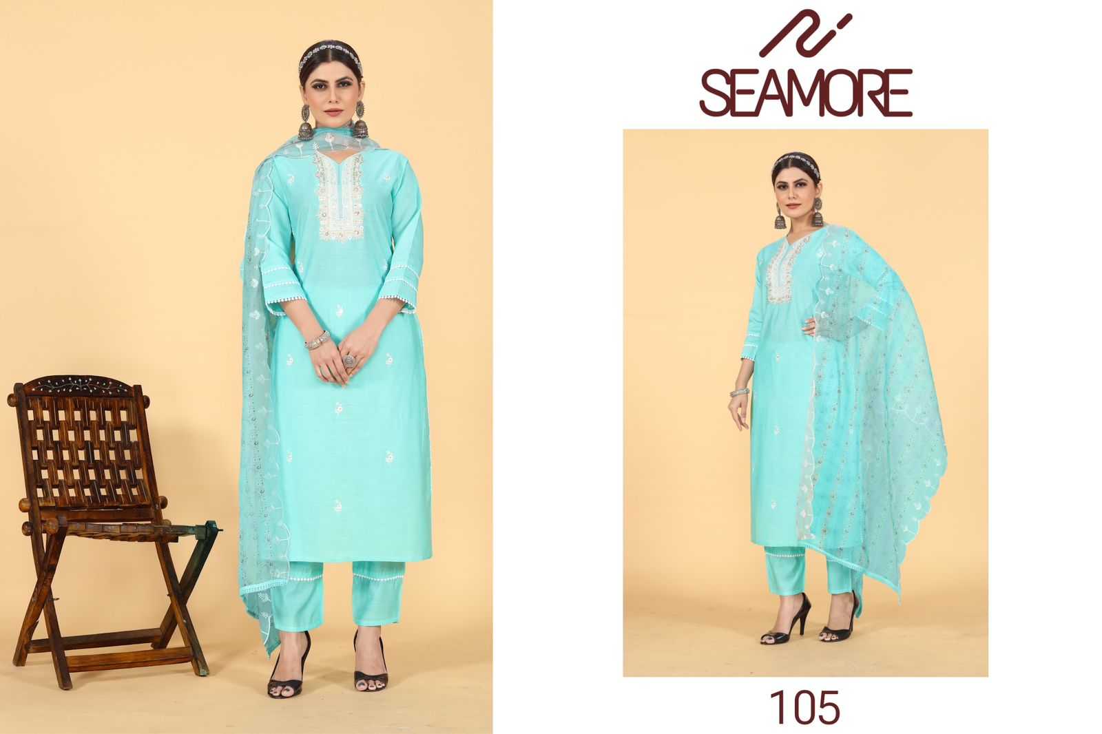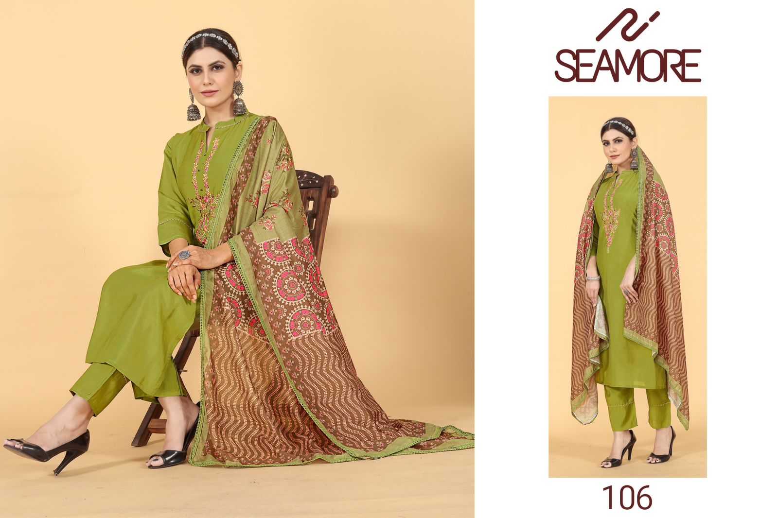 Brand - SEAMORE Catalog - LAXMIPATI ONE Product typ - Women Kurta Pant With Bottom Design Number 101 Fabric - Muslin Work - Embroidered 102 Fabric - Viscose Chanderi Work - Embroidered Price - 999/- 103 Fabric - Viscose Chanderi Work - Embroidered Price - 999/- 104 Fabric - Chanderi Work - Embroidered 105 Fabric - Chanderi 106 Price - 899/- 107 Fabric - Chanderi Price - 899/- Size - M To XXL Order Set To Set |