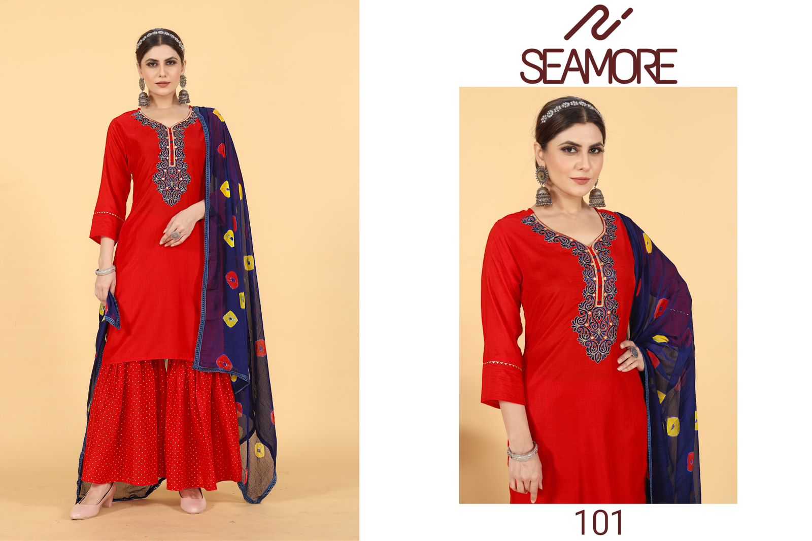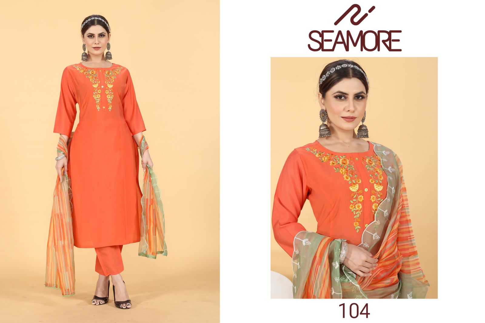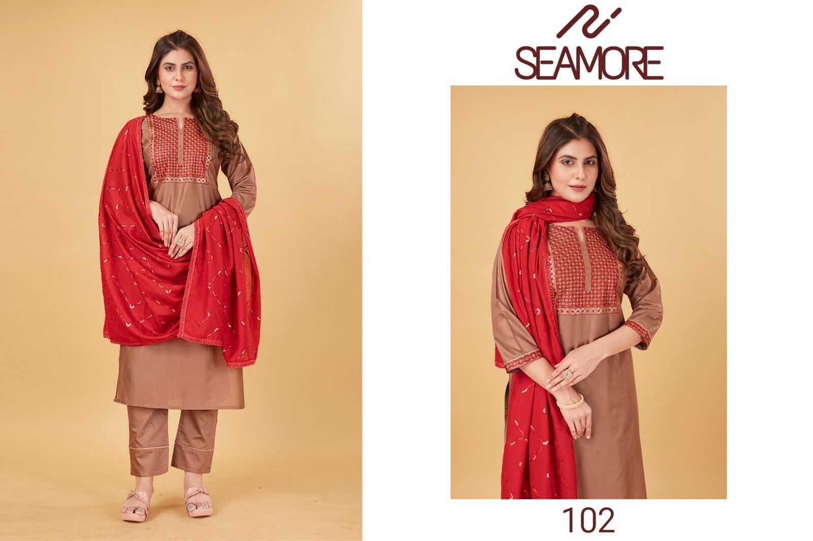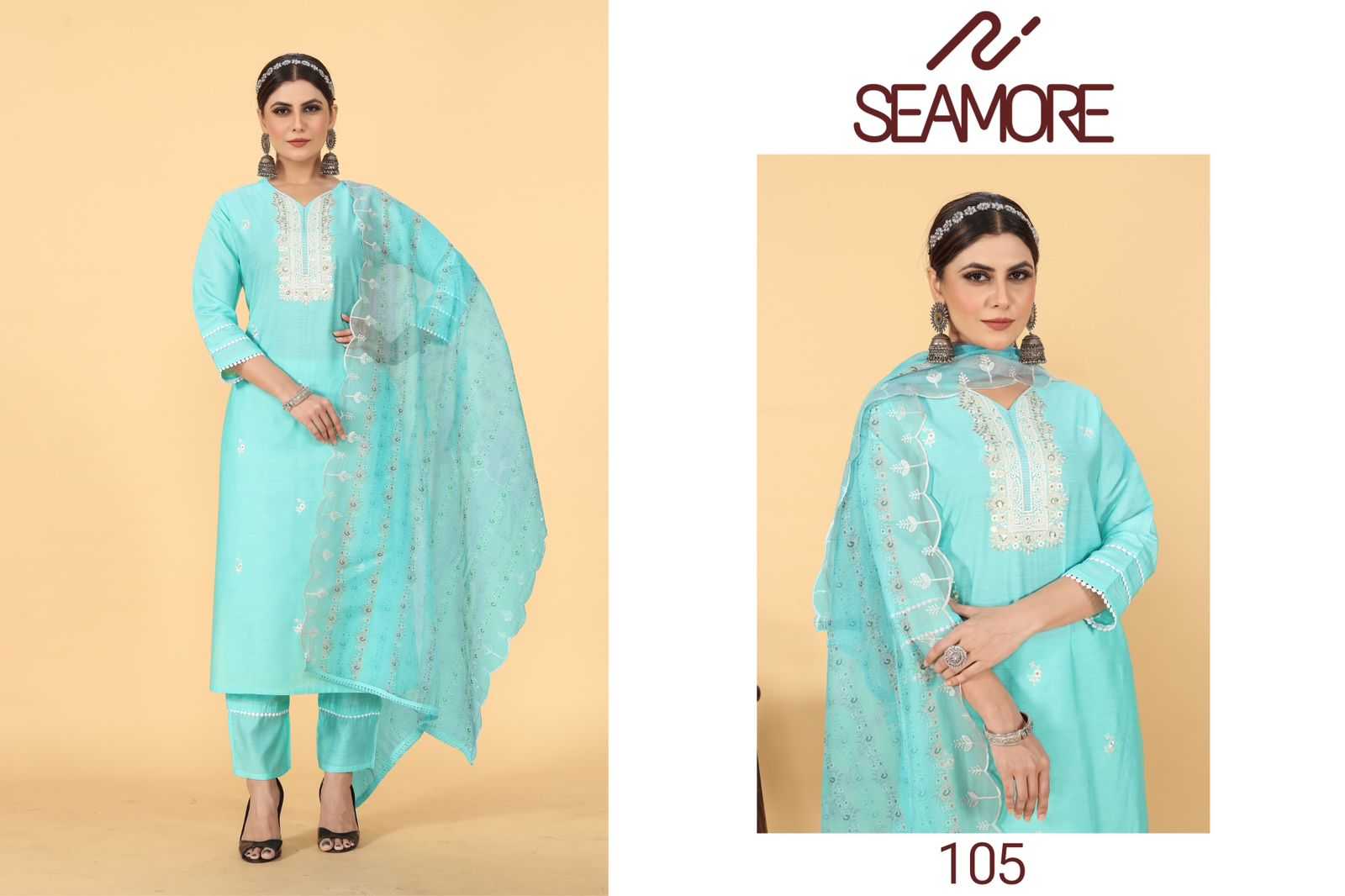 Brand - SEAMORE Catalog - LAXMIPATI ONE Product typ - Women Kurta Pant With Bottom Design Number 101 Fabric - Muslin Work - Embroidered 102 Fabric - Viscose Chanderi Work - Embroidered Price - 999/- 103 Fabric - Viscose Chanderi Work - Embroidered Price - 999/- 104 Fabric - Chanderi Work - Embroidered 105 Fabric - Chanderi 106 Price - 899/- 107 Fabric - Chanderi Price - 899/- Size - M To XXL Order Set To Set |