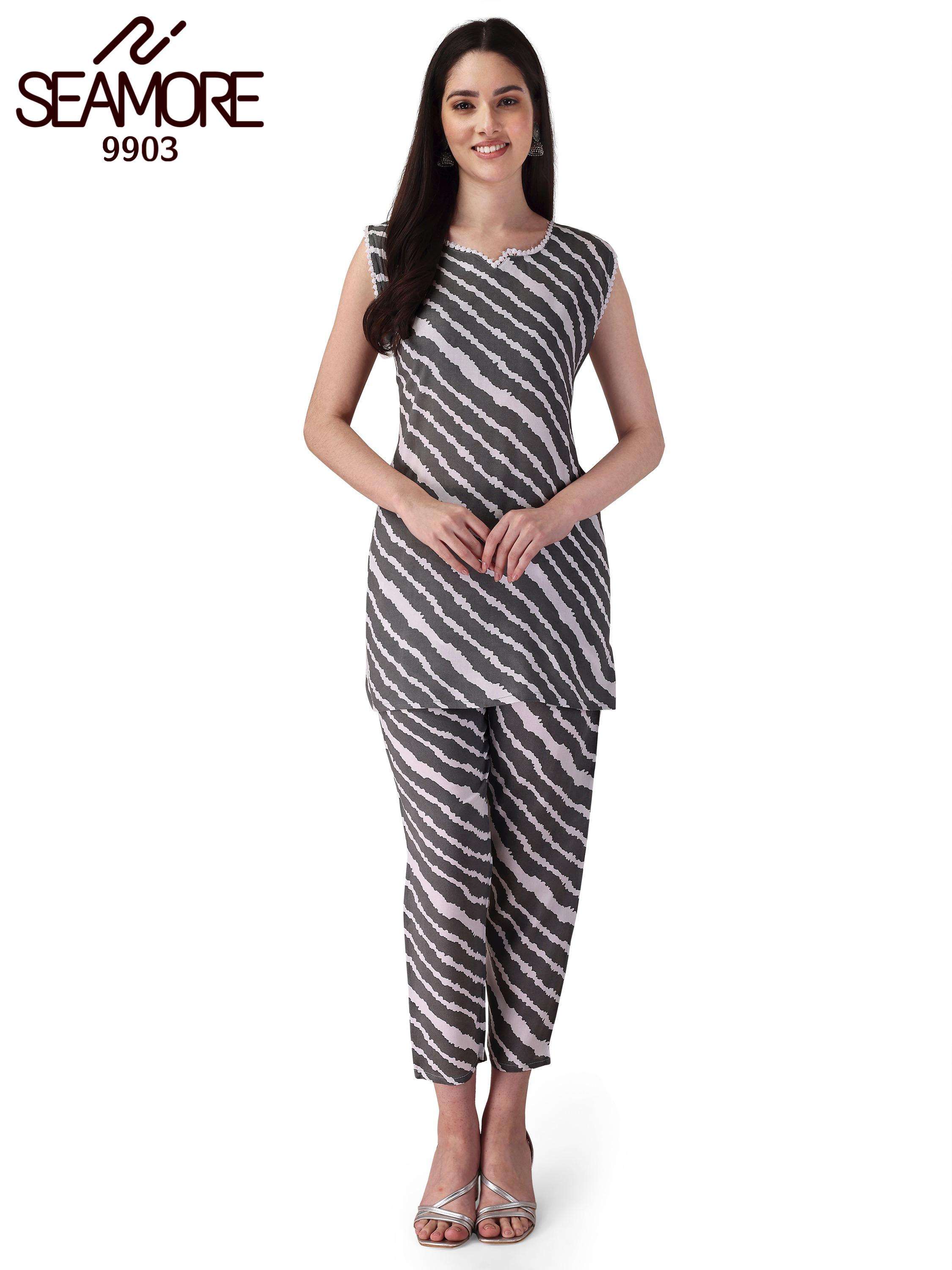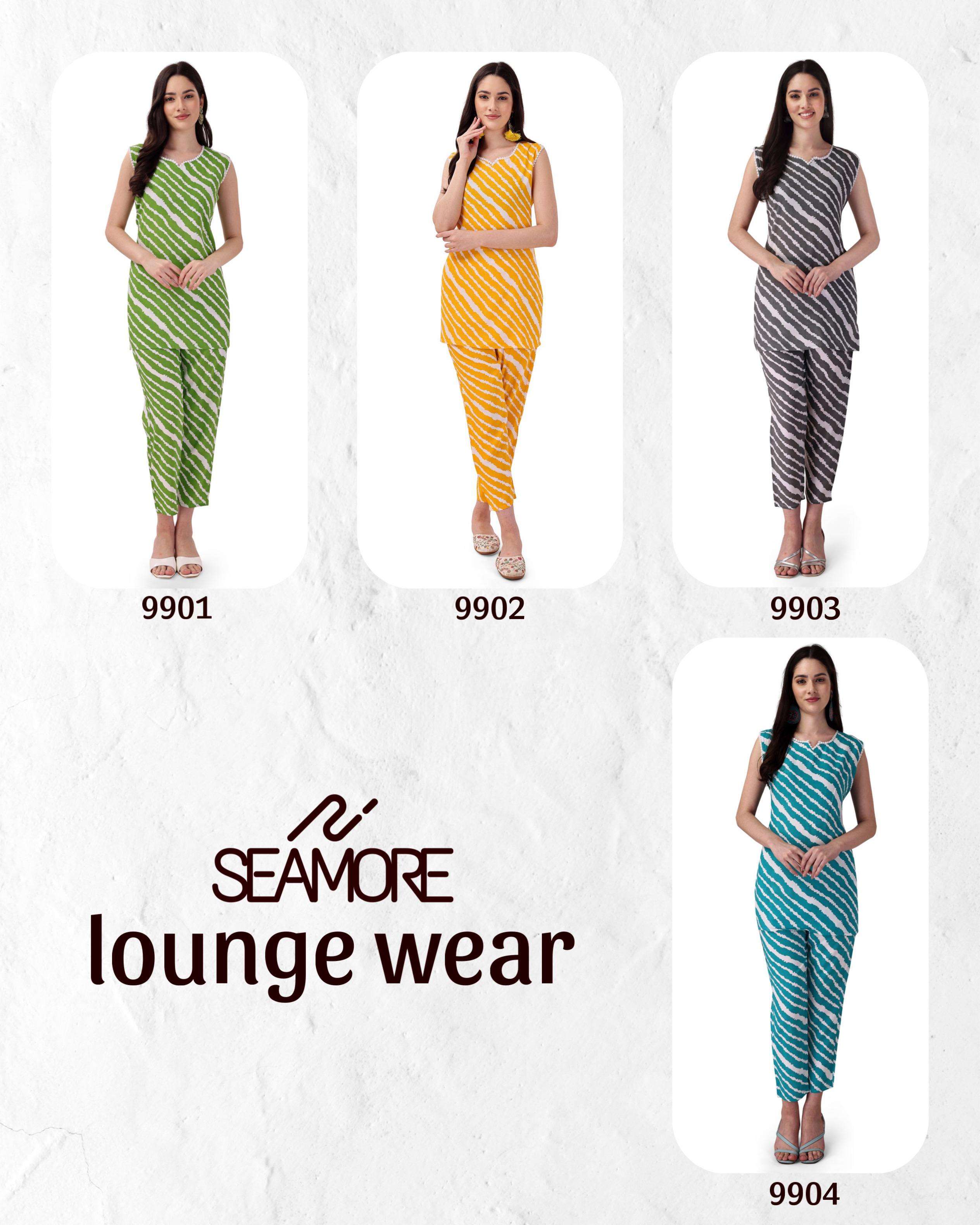 Brand - SEAMORE Design No - 9901 To 9904 Product typ - Women Lounge Wear Size - S To XL Fabric - Rayon Price - 499/- Order Set to Set |
