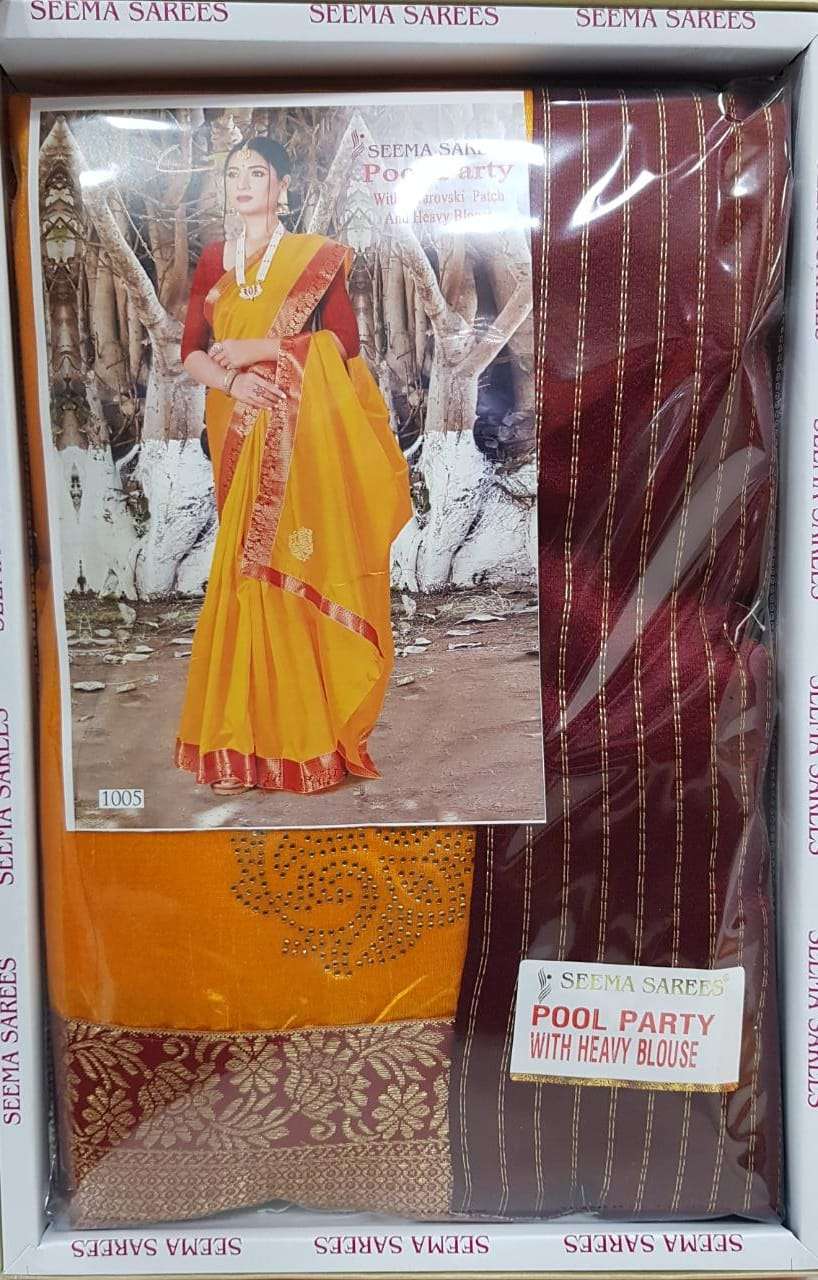 SEEMA SAREES POOL PARTY FABRIC: Z+ VICHITRA RATE: 310/- per pcs Set to set. GST 5 Percent Extra With COMBO LACE & SIROSKI WORK With HEAVY BROCKET BLOUSE Set to set |