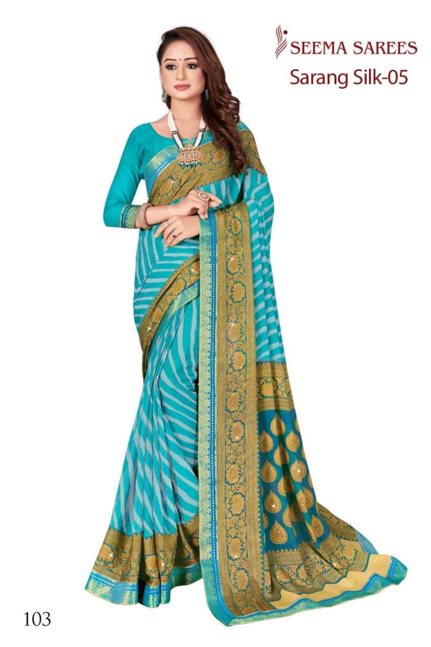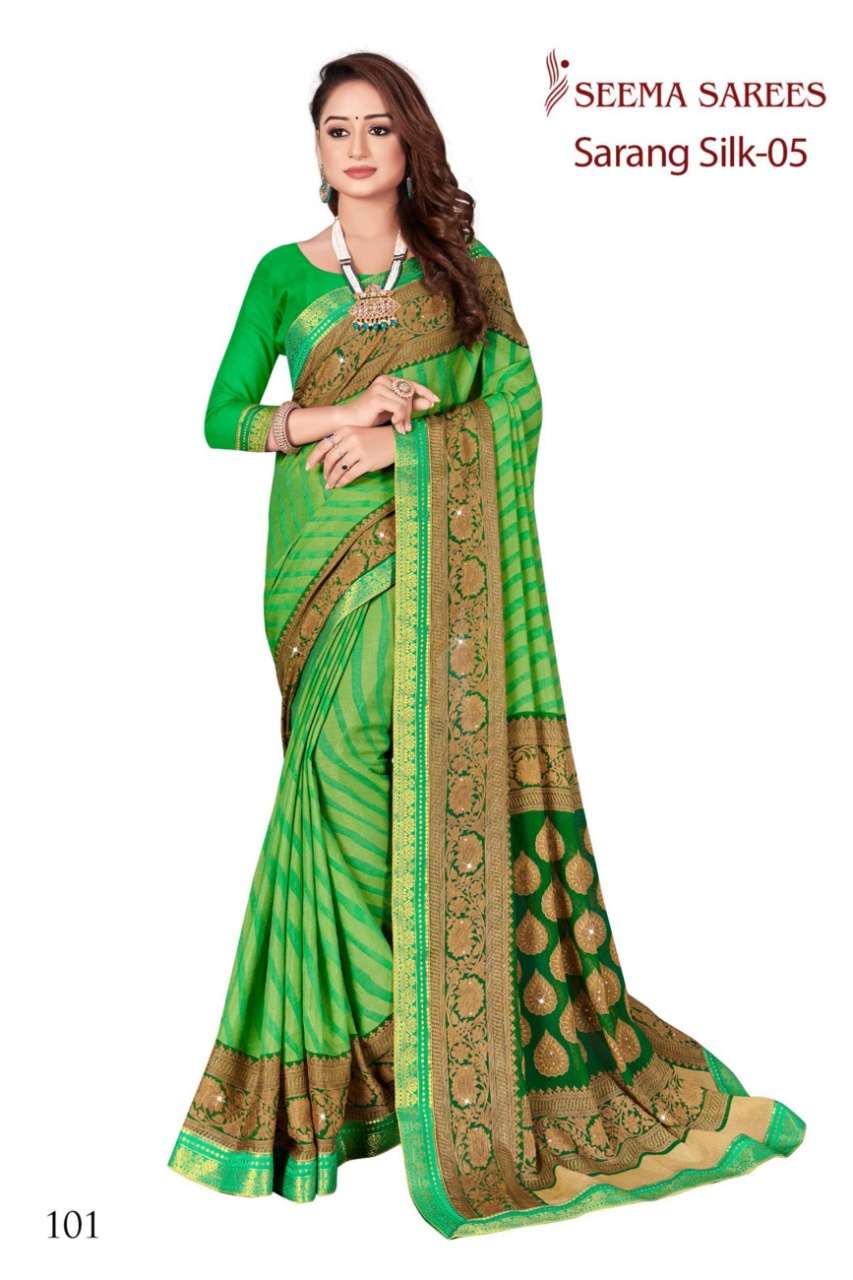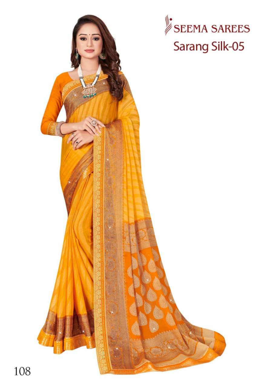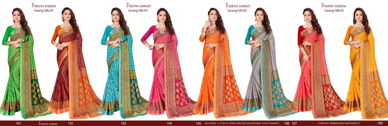 BRAND :-SEEMA SAREES CATALOG NAME :-SARANG SILK VOL 5 RATE : *675/- * per pcs. Set to set FABRIC : CHIFFON BRASSO VALUE ADDITION : STONE Set to set |