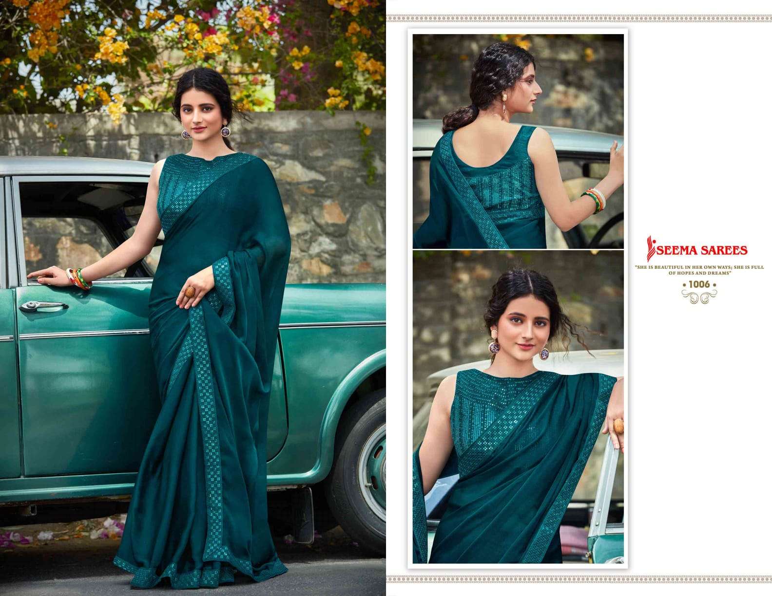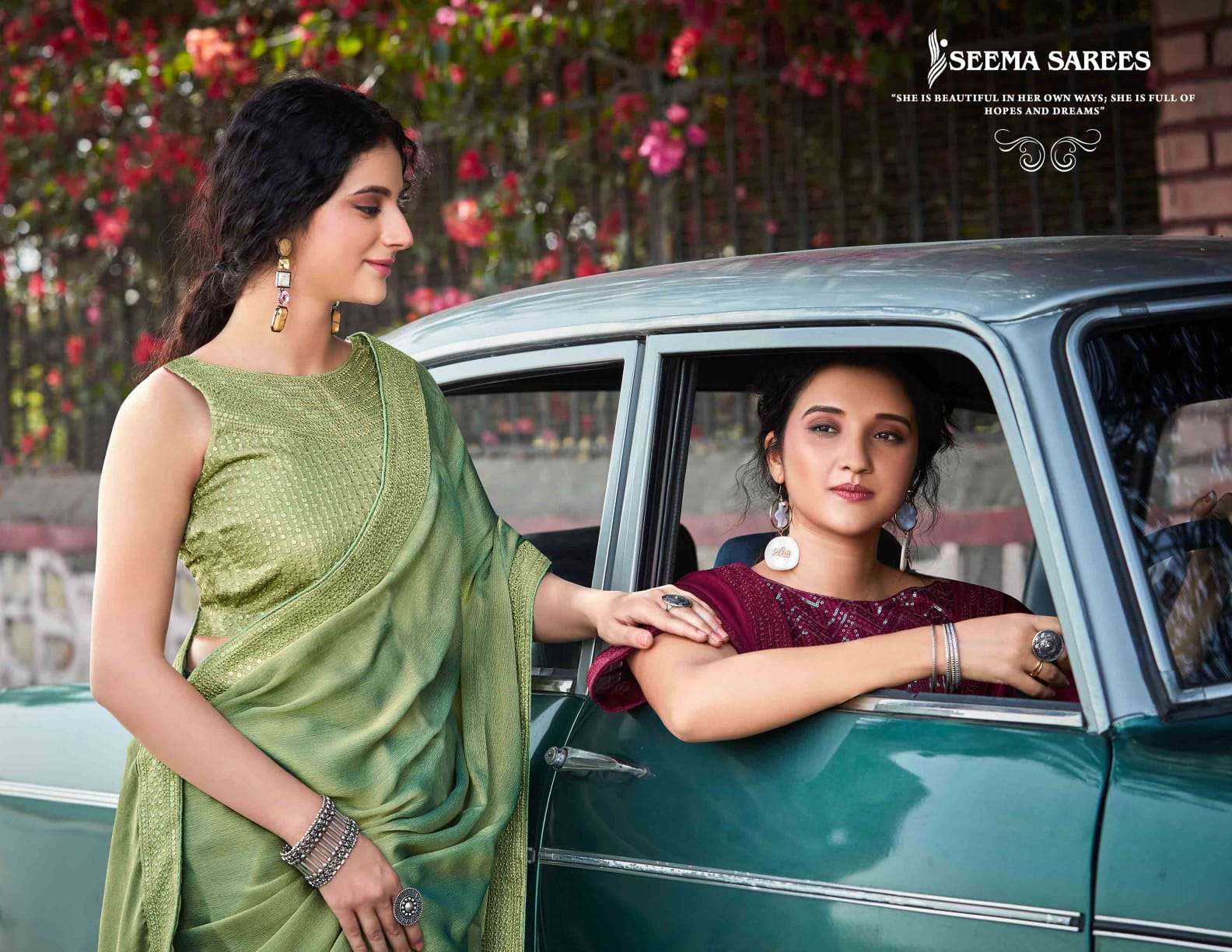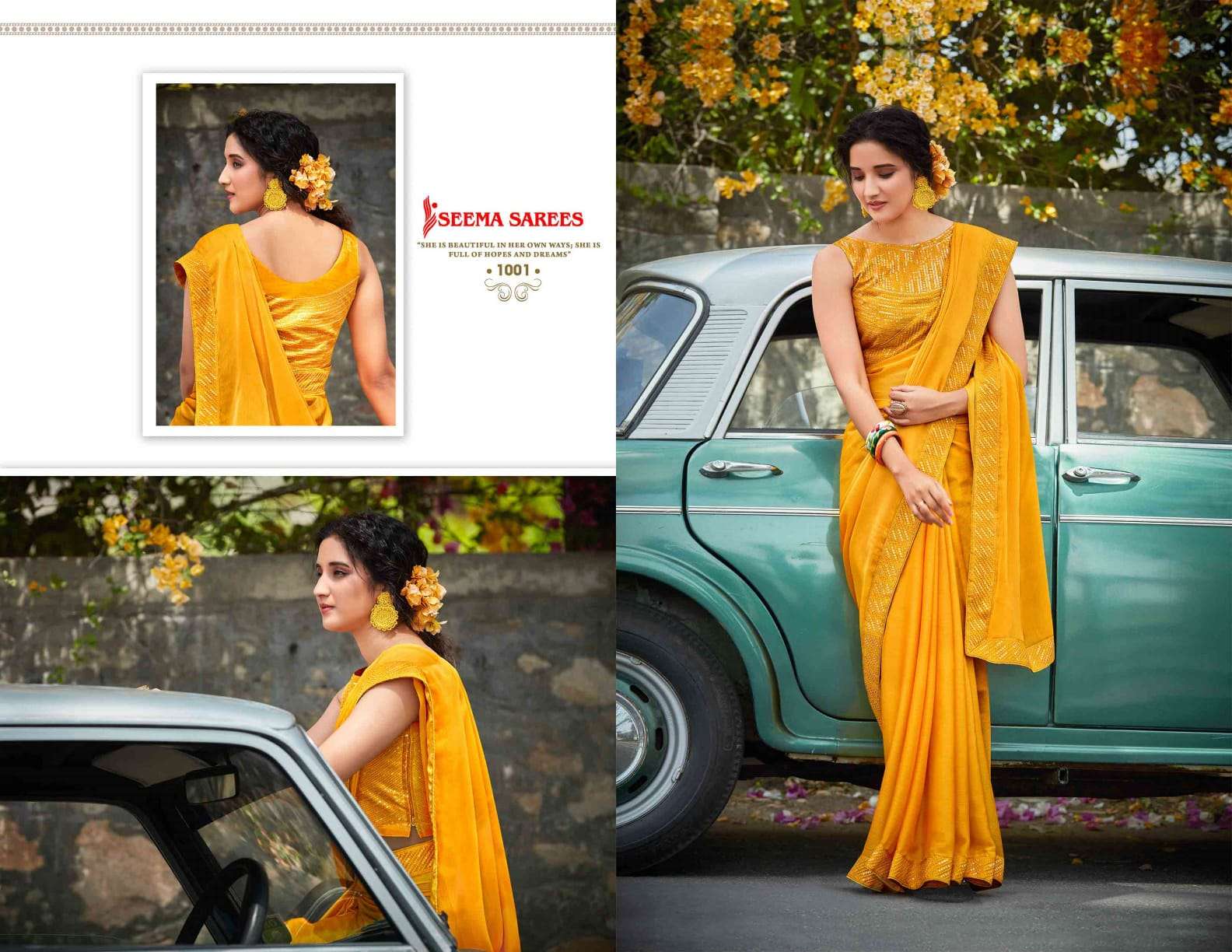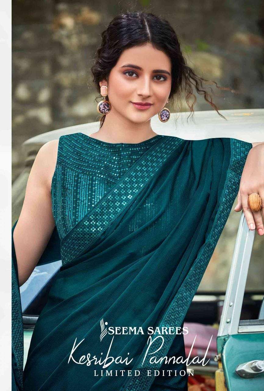 SEEMA SAREES KESRIBAI PANNALAL RATE : 970/- per pcs FABRIC : CXP MOSS CHIFFON WORK BORDER BLOUSE FANCY SEQUENCE WORK CONCEPT |