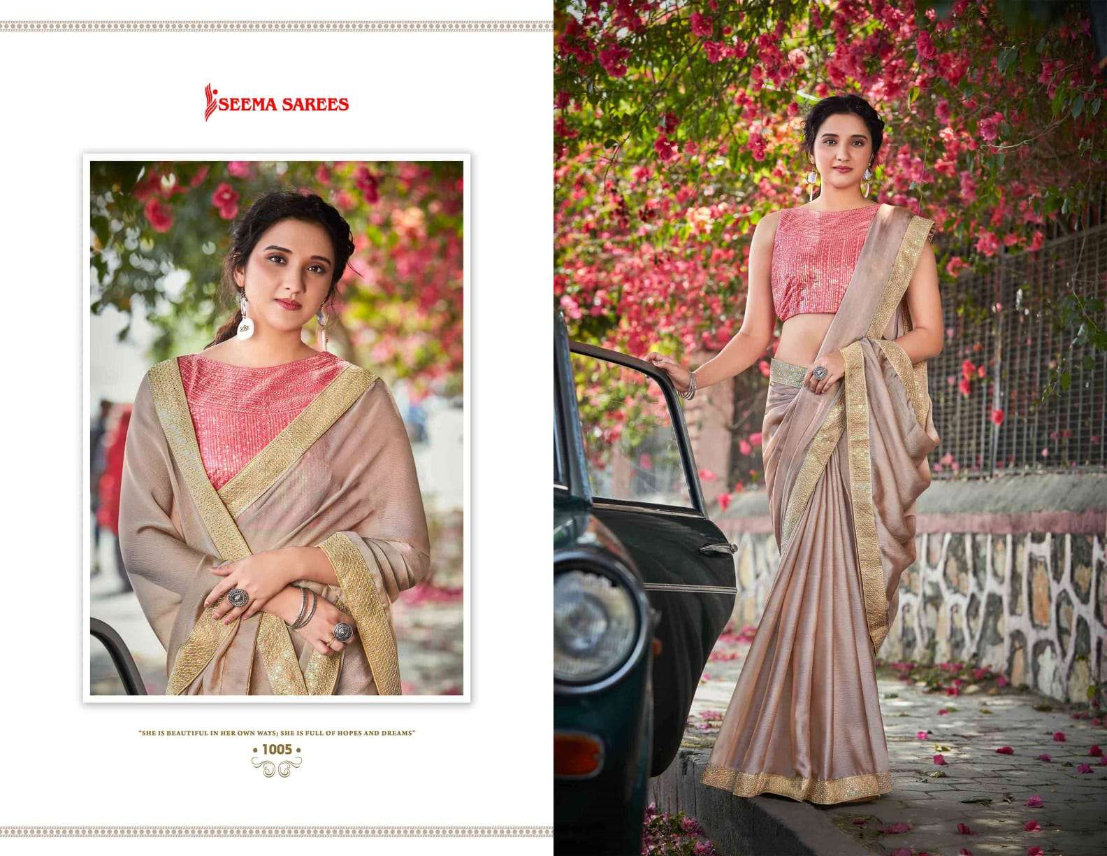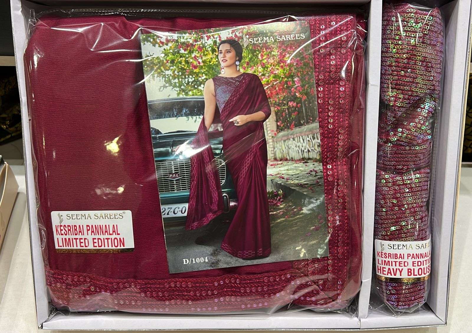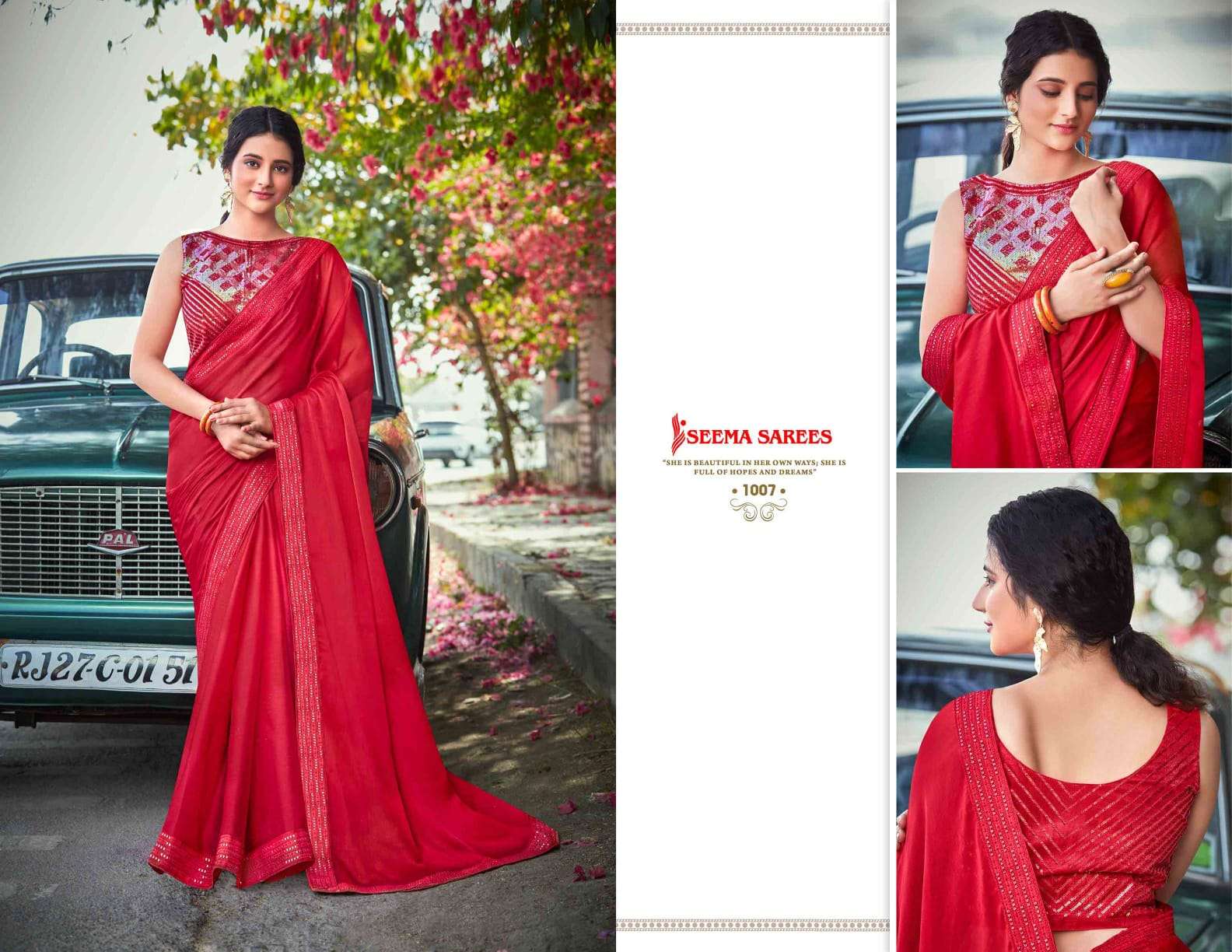 SEEMA SAREES KESRIBAI PANNALAL RATE : 970/- per pcs FABRIC : CXP MOSS CHIFFON WORK BORDER BLOUSE FANCY SEQUENCE WORK CONCEPT |