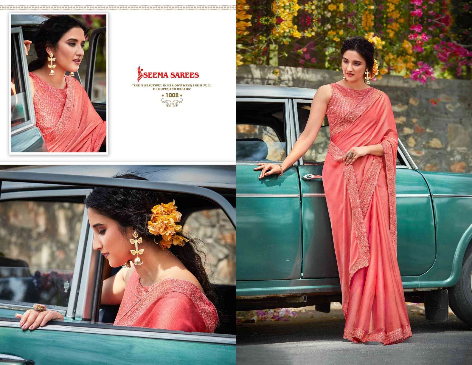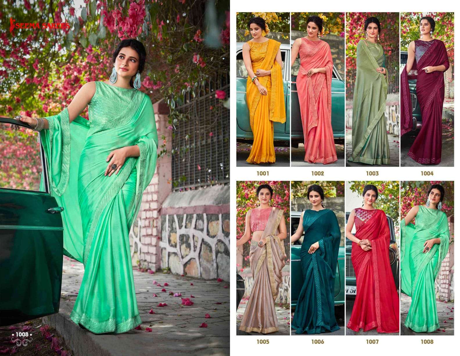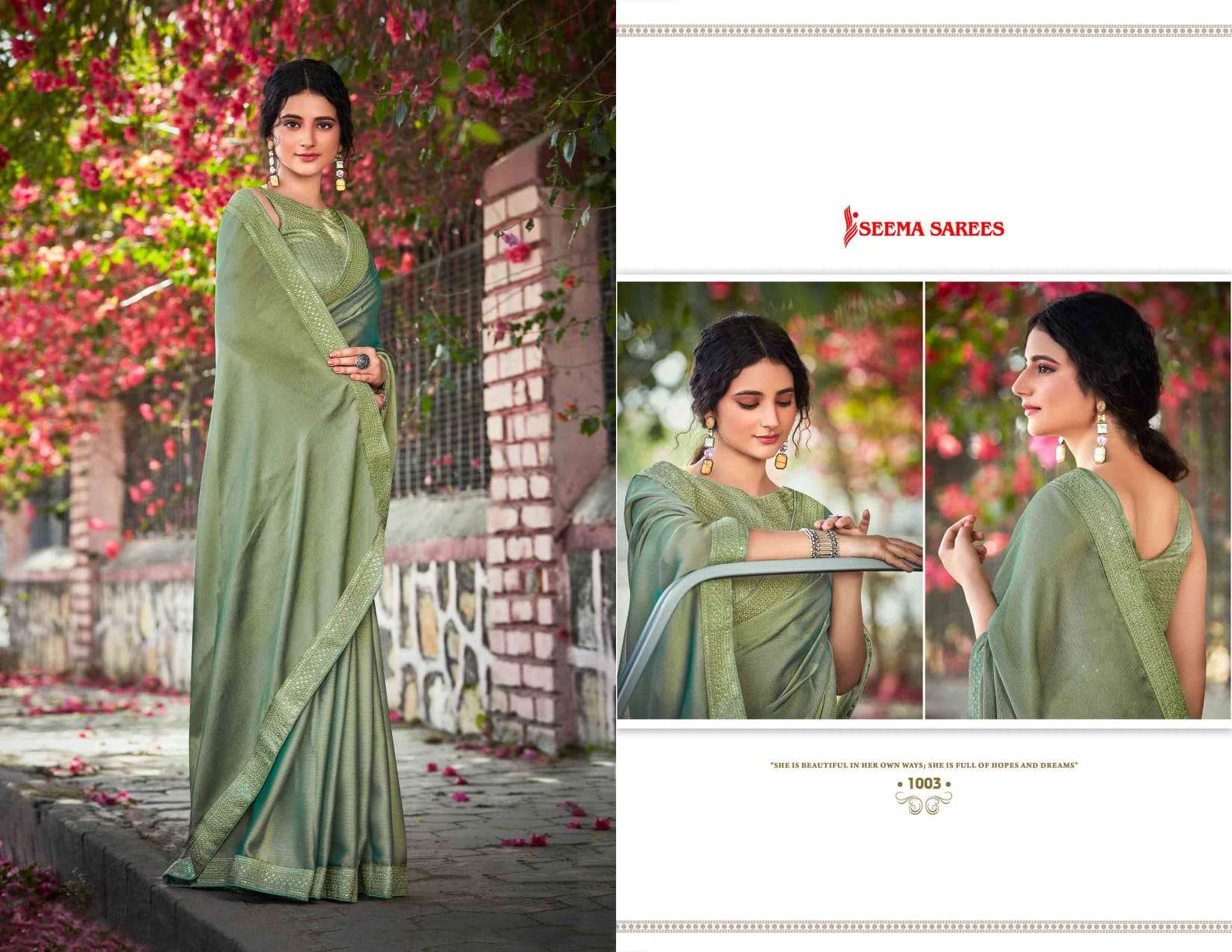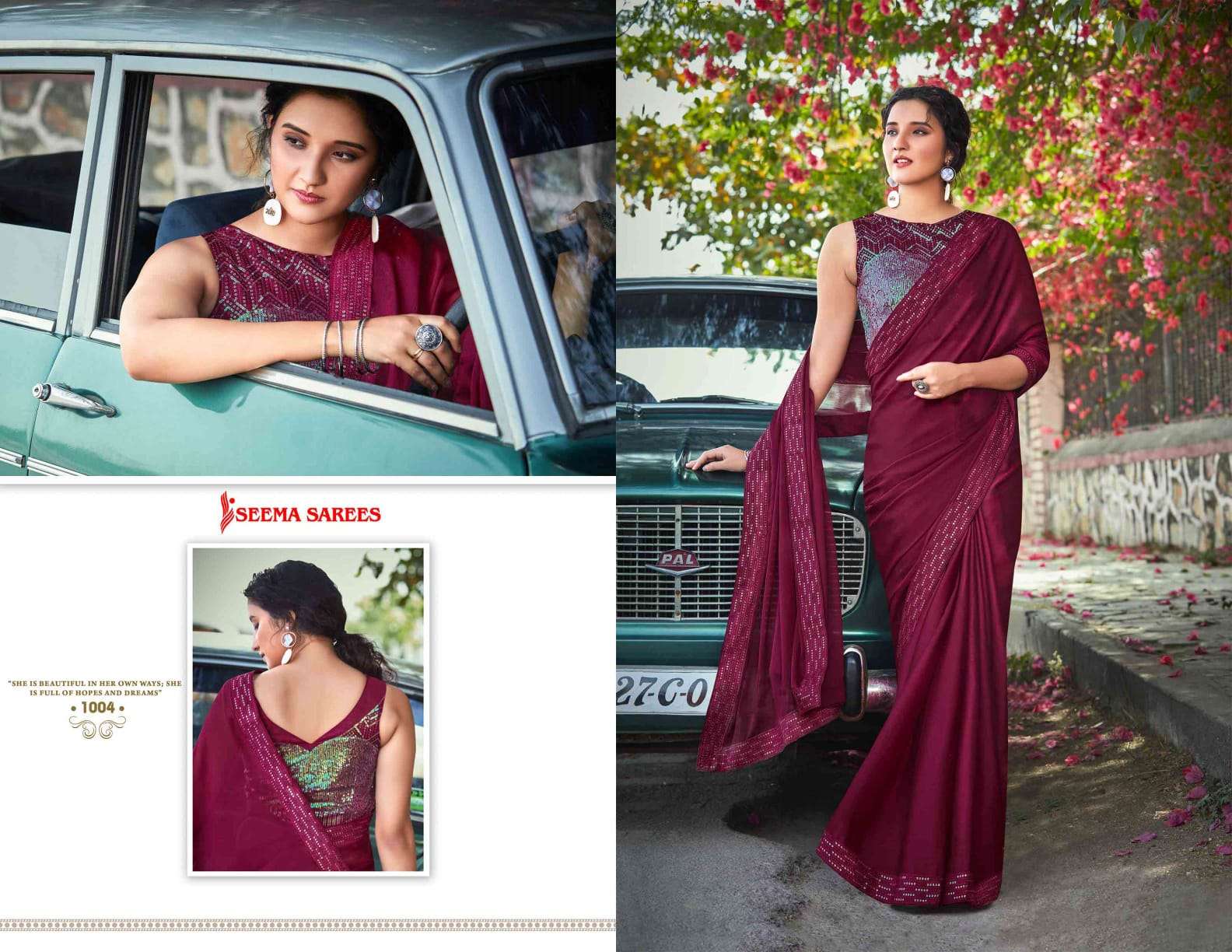 SEEMA SAREES KESRIBAI PANNALAL RATE : 970/- per pcs FABRIC : CXP MOSS CHIFFON WORK BORDER BLOUSE FANCY SEQUENCE WORK CONCEPT |