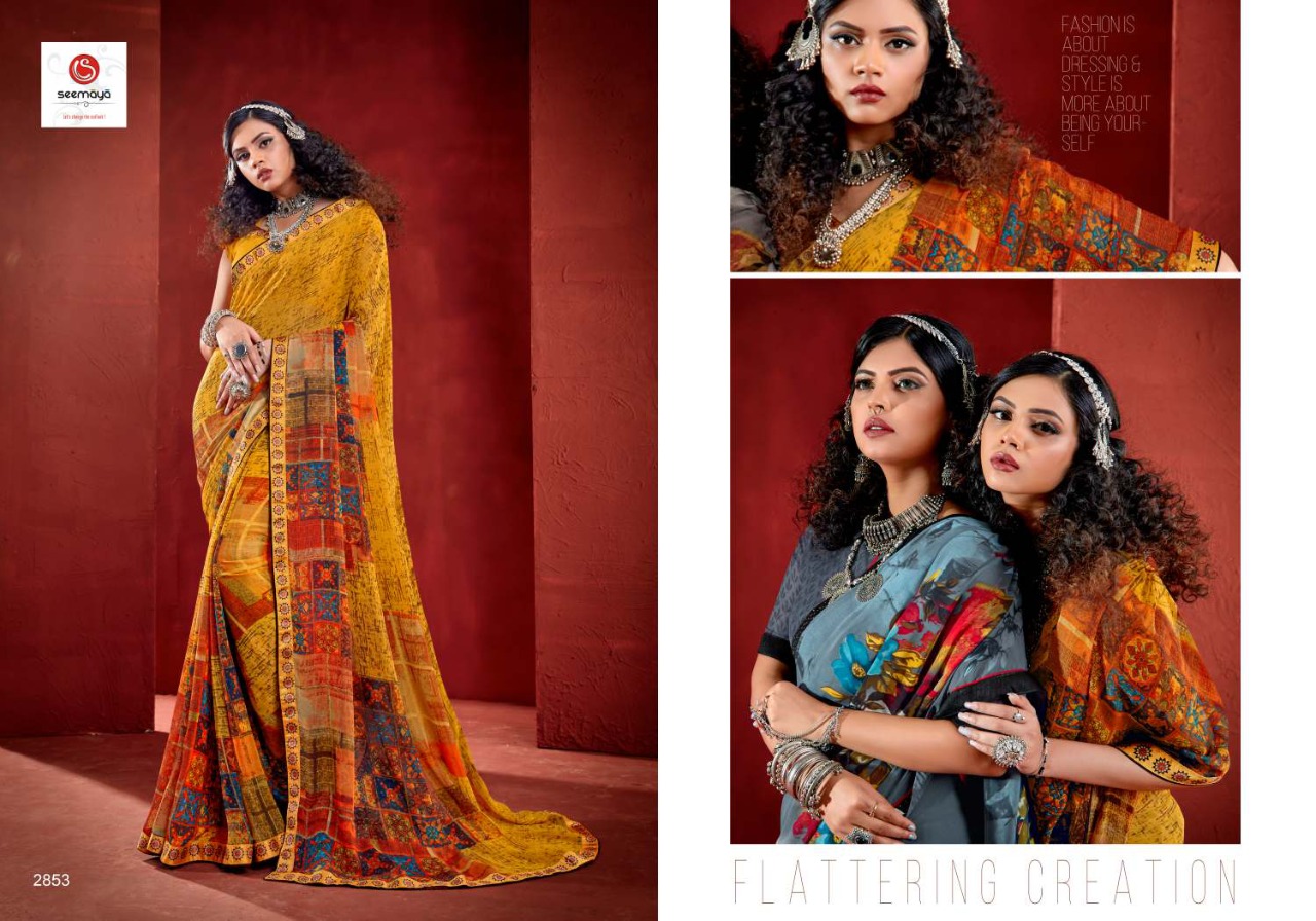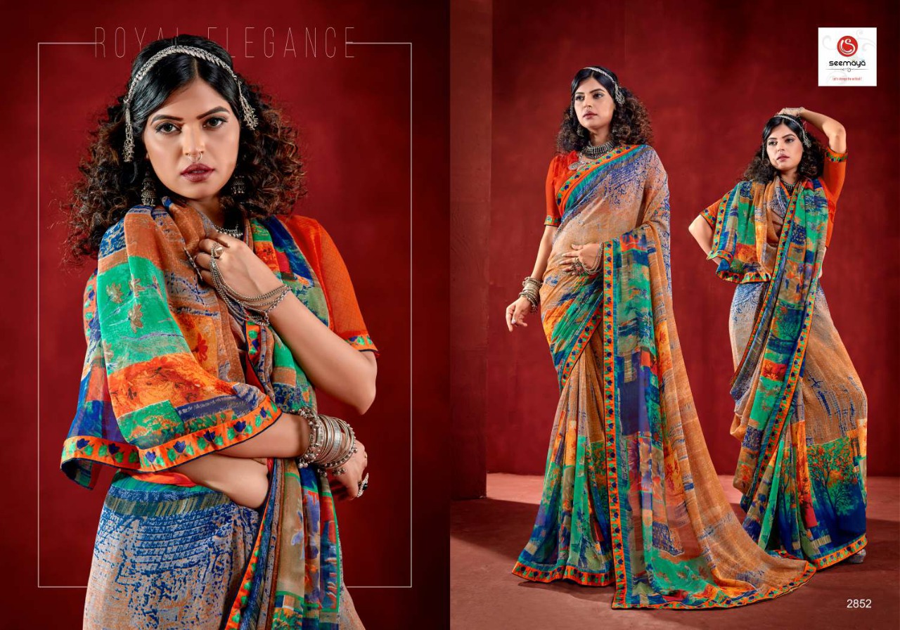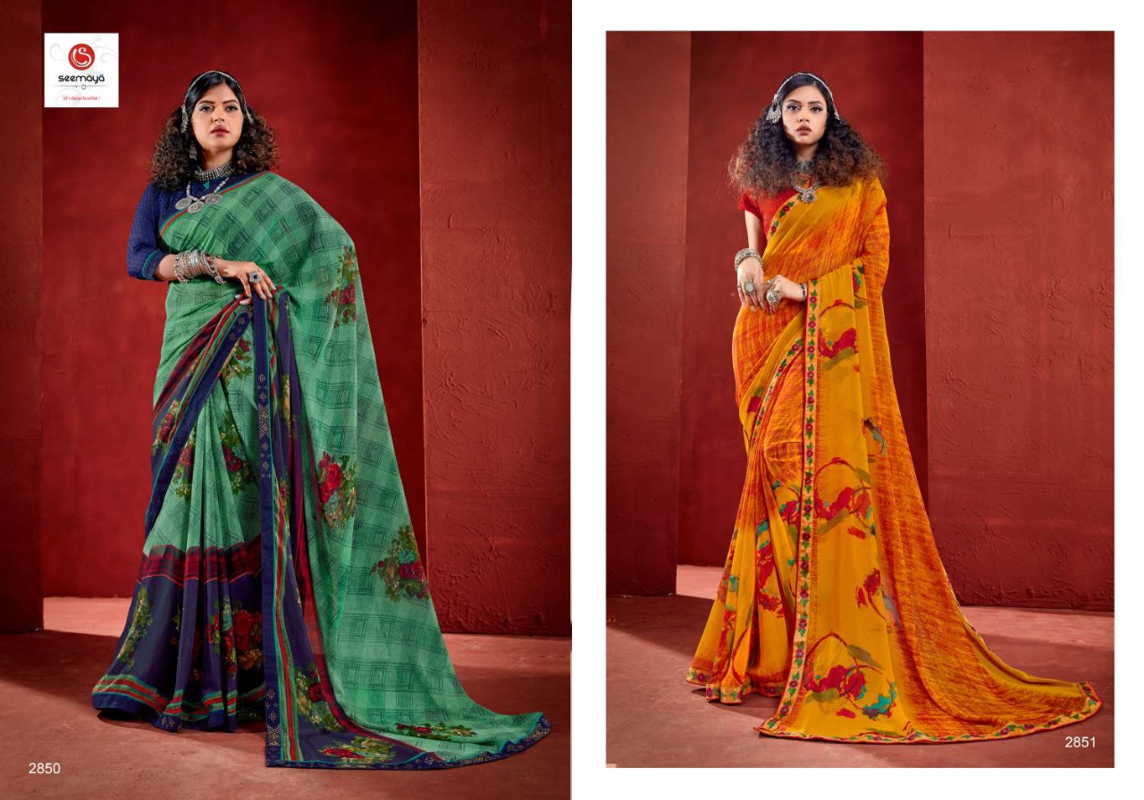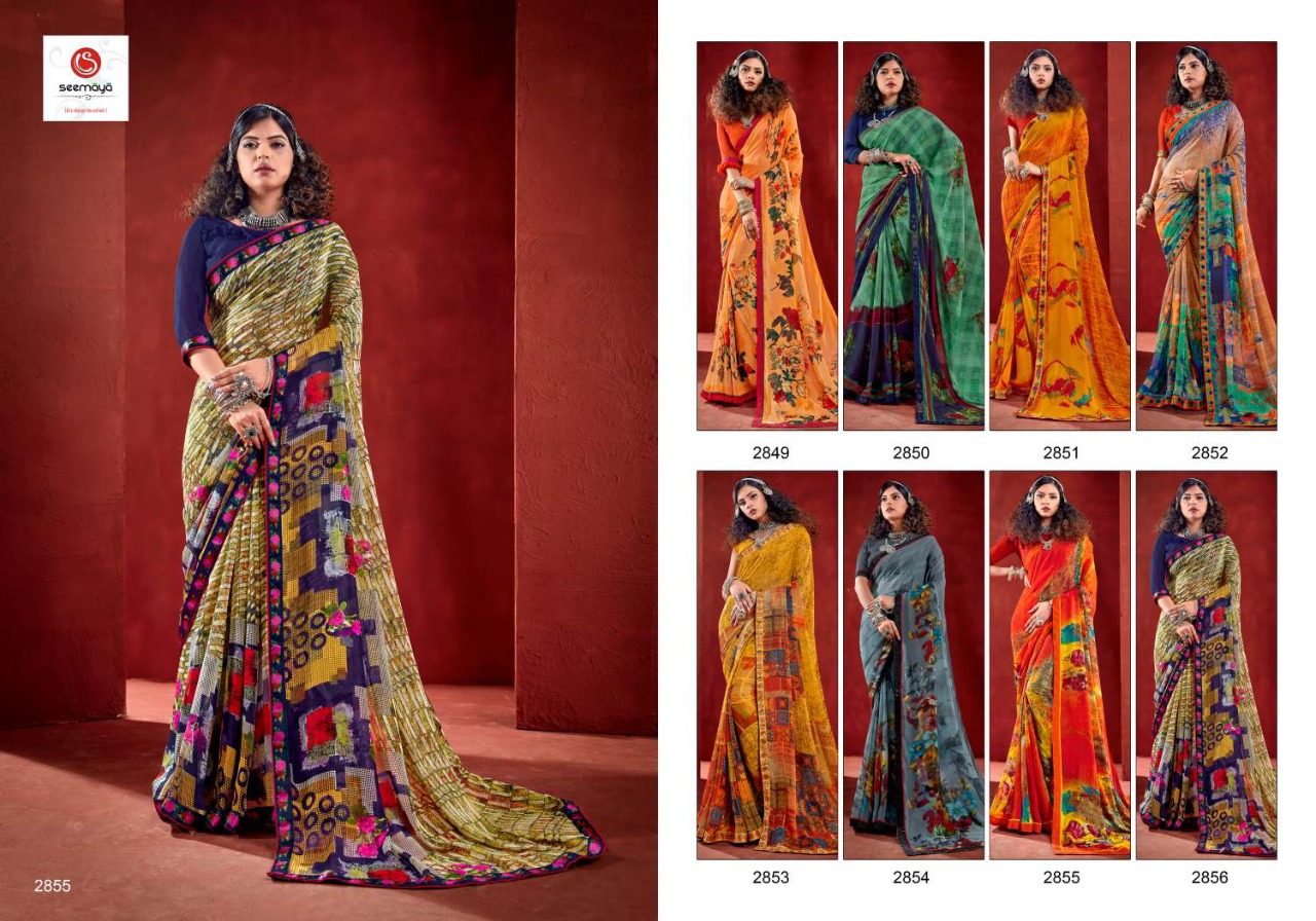 _AKSHARA Brand:- SEEMAYA Rate:- 390-/ Fabric:- FANCY WEIGHTLESS FABRIC FANCY PRINT WITH PRINT BORDER Total Designs:- 08 _Packing pcs :- set to set Matching :- SINGLE COLOR Cut :- 6/30mtr |