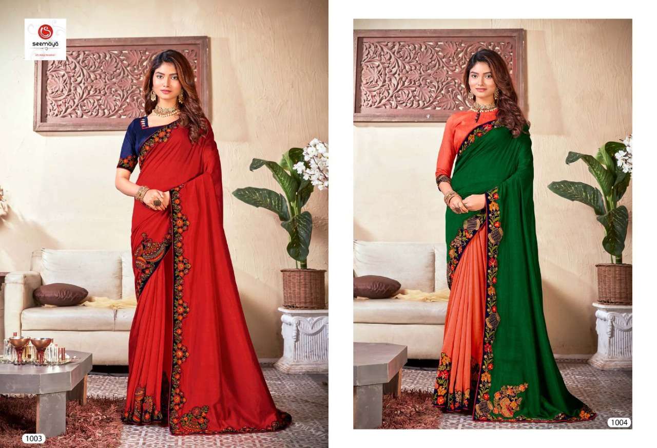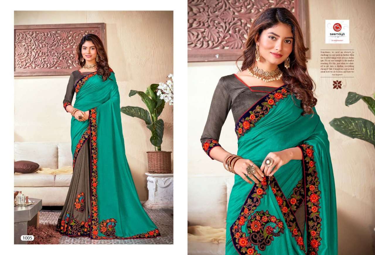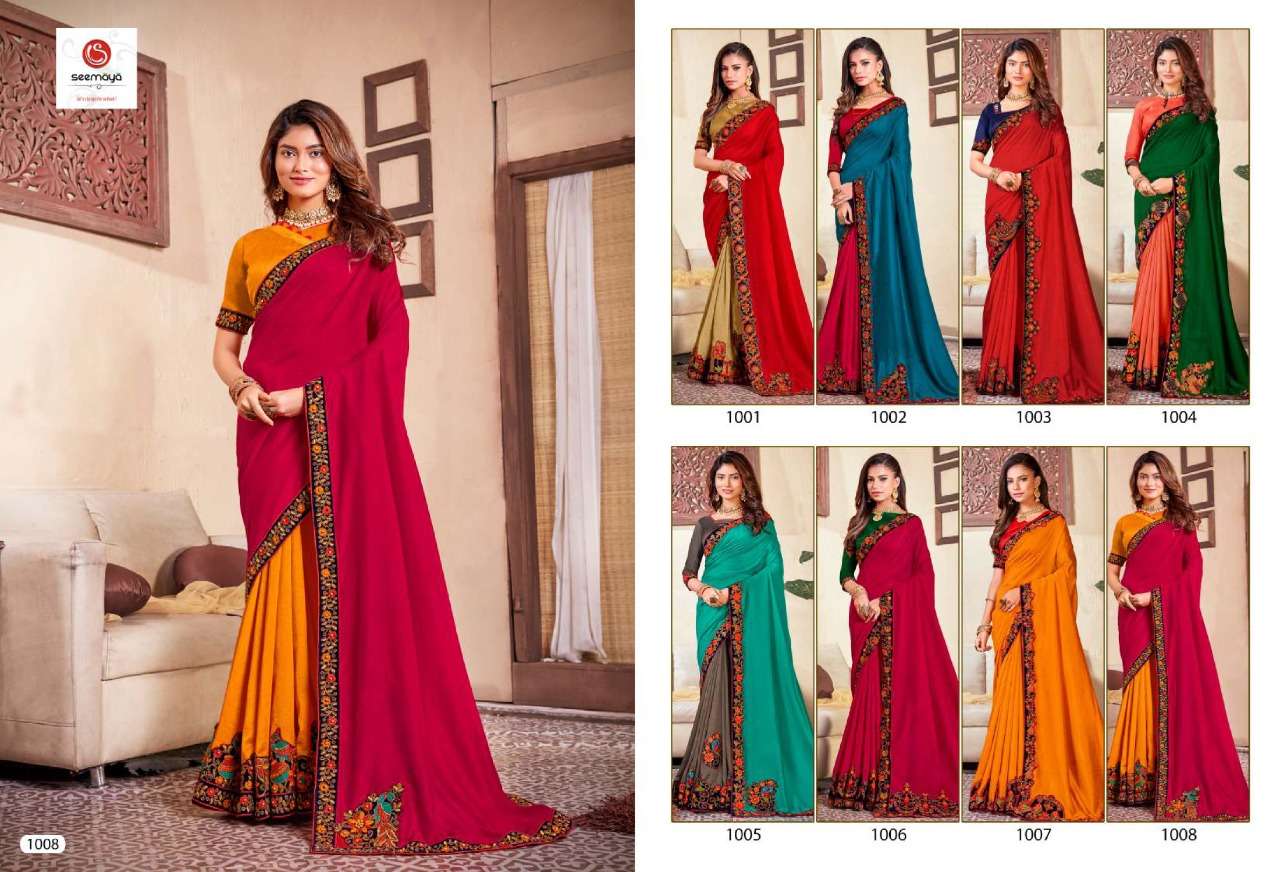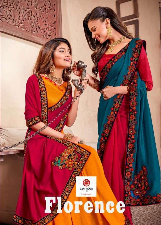 _NEW LAUNCHING _ FLORENCE Brand:- SEEMAYA _Rate:- 1120/- Set to set. GST 5 Percent Extra. Fabric:- VICHITRA SILK BLOOMING FABRIC WITH FANCY WORK FANCY TEST AND FANCY BORDER Total Designs:- 08 _Packing pcs :- set to set Matching :- SINGLE COLOR Cut :- 6/30 mtr |