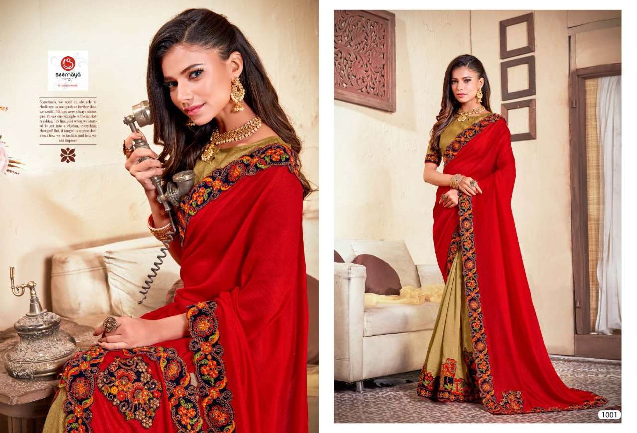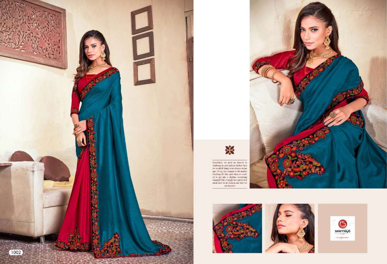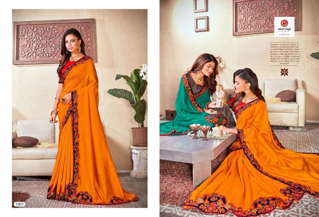 _NEW LAUNCHING _ FLORENCE Brand:- SEEMAYA _Rate:- 1120/- Set to set. GST 5 Percent Extra. Fabric:- VICHITRA SILK BLOOMING FABRIC WITH FANCY WORK FANCY TEST AND FANCY BORDER Total Designs:- 08 _Packing pcs :- set to set Matching :- SINGLE COLOR Cut :- 6/30 mtr |