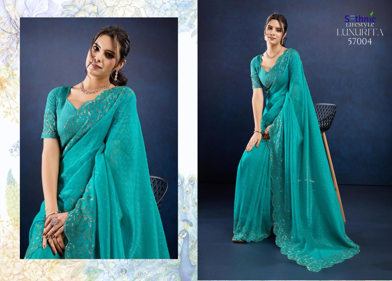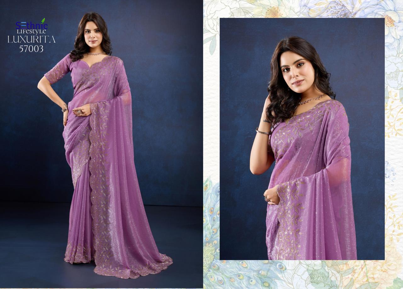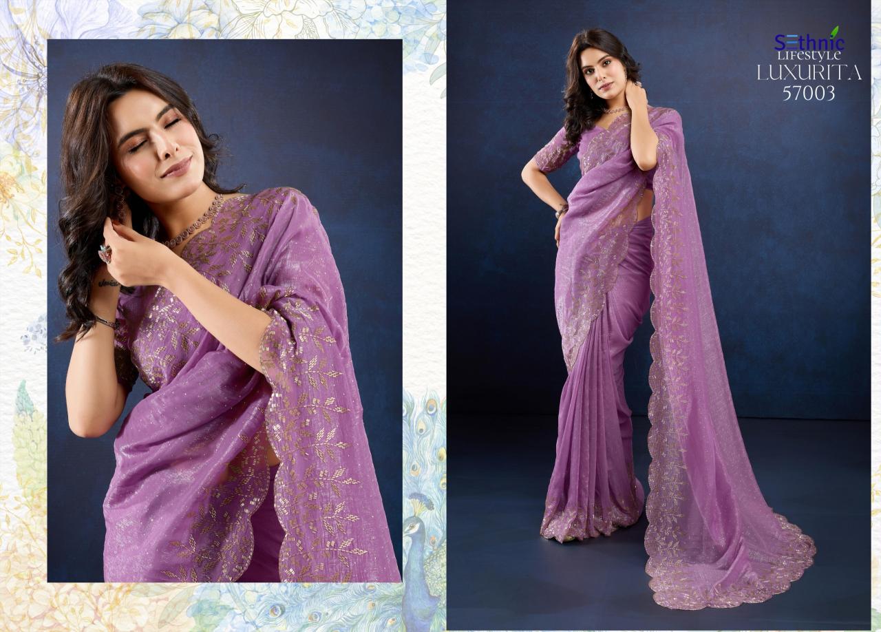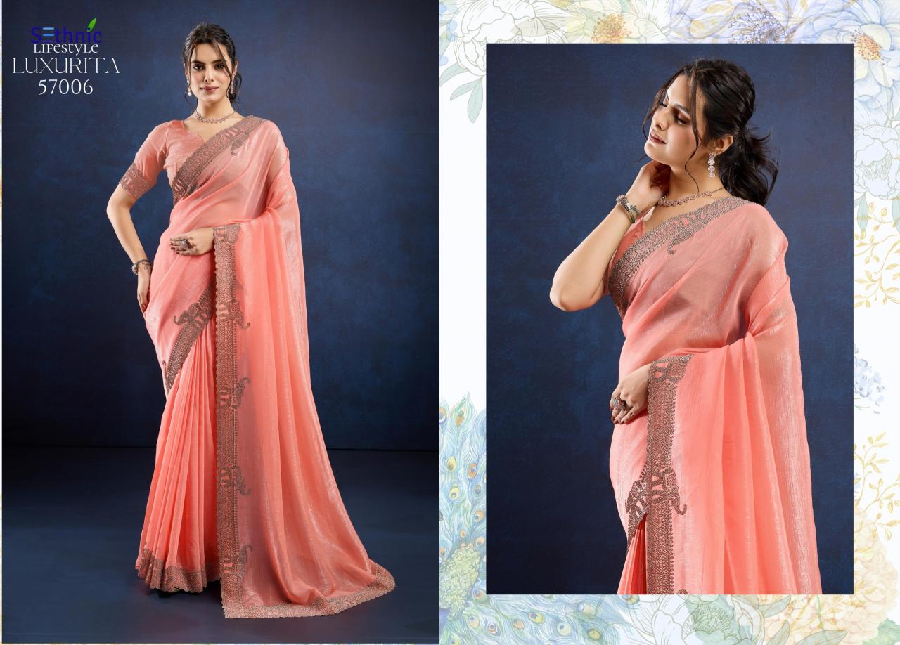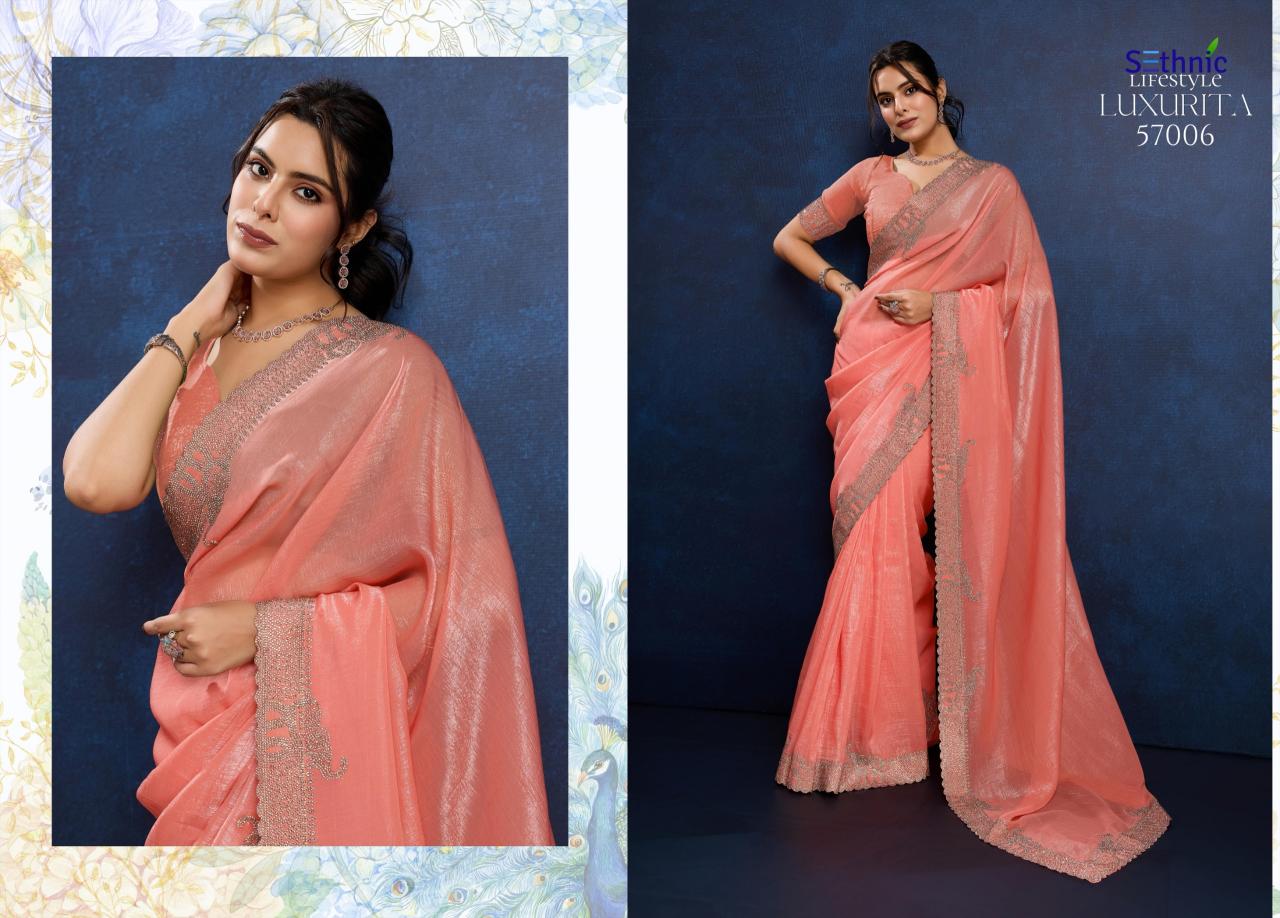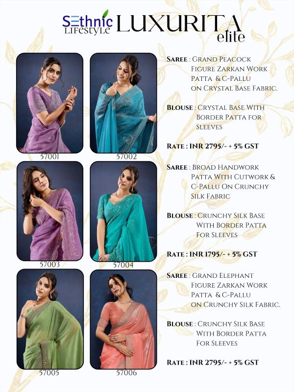 An exquisite wedding saree collection featuring pure handwork and a grand figure patta concept. Adorned with crystal zarkans and golden pipes, radiating timeless beauty and grandeur. Brand : Sethnic Lifestyle Catalog Name : Luxurita Series: 57001 TO 57006 Saree Fabric : Detail Attached Blouse Fabric : Detail Attached Occasion : Festival Wear, Party Wear |