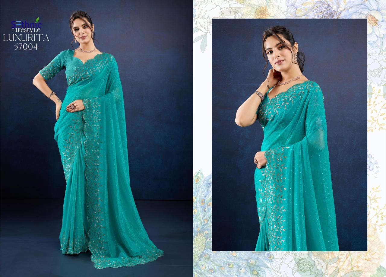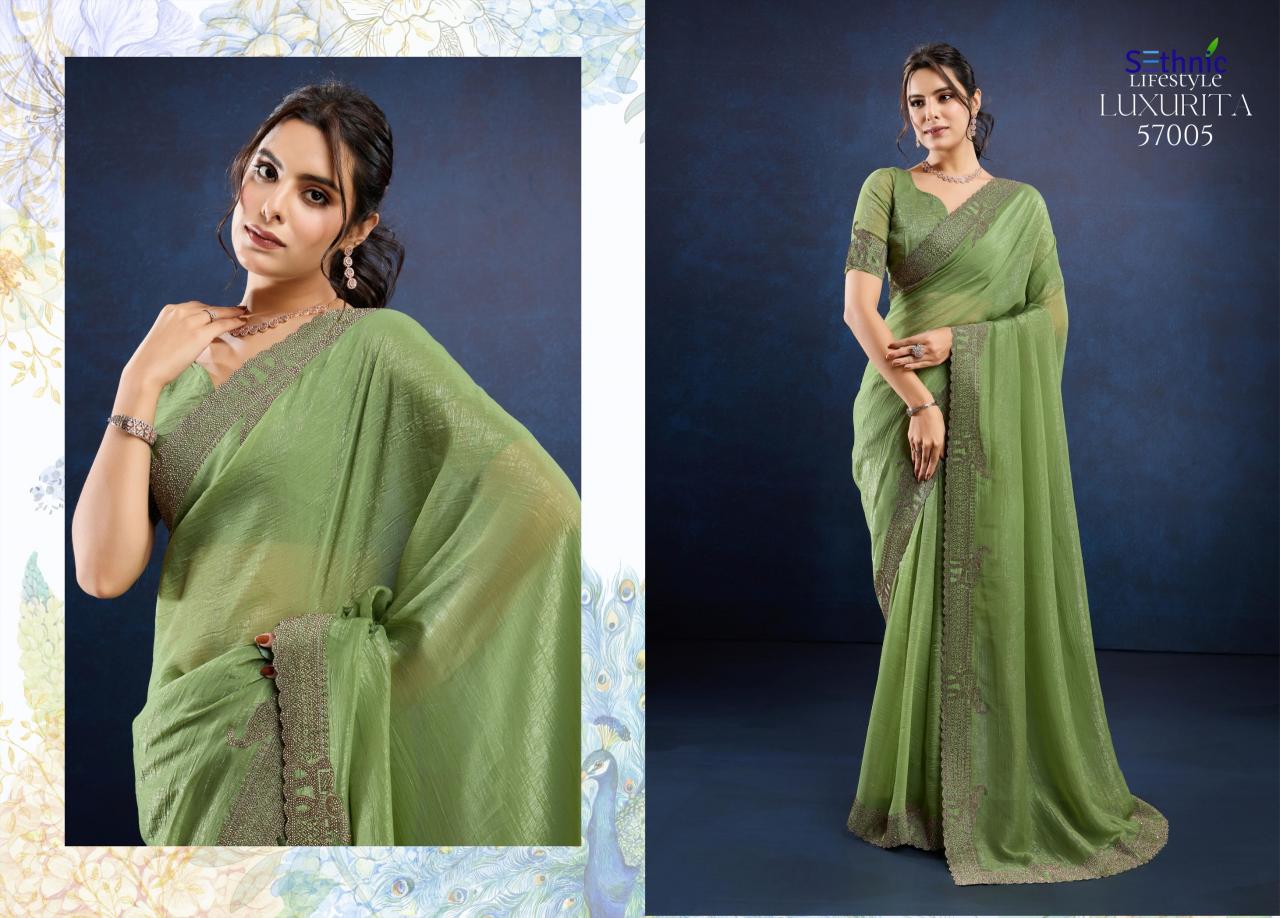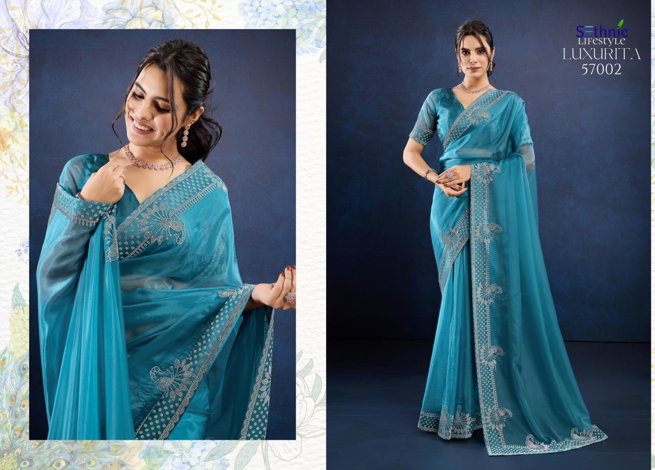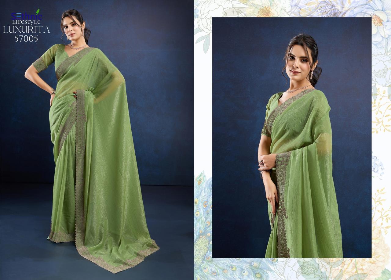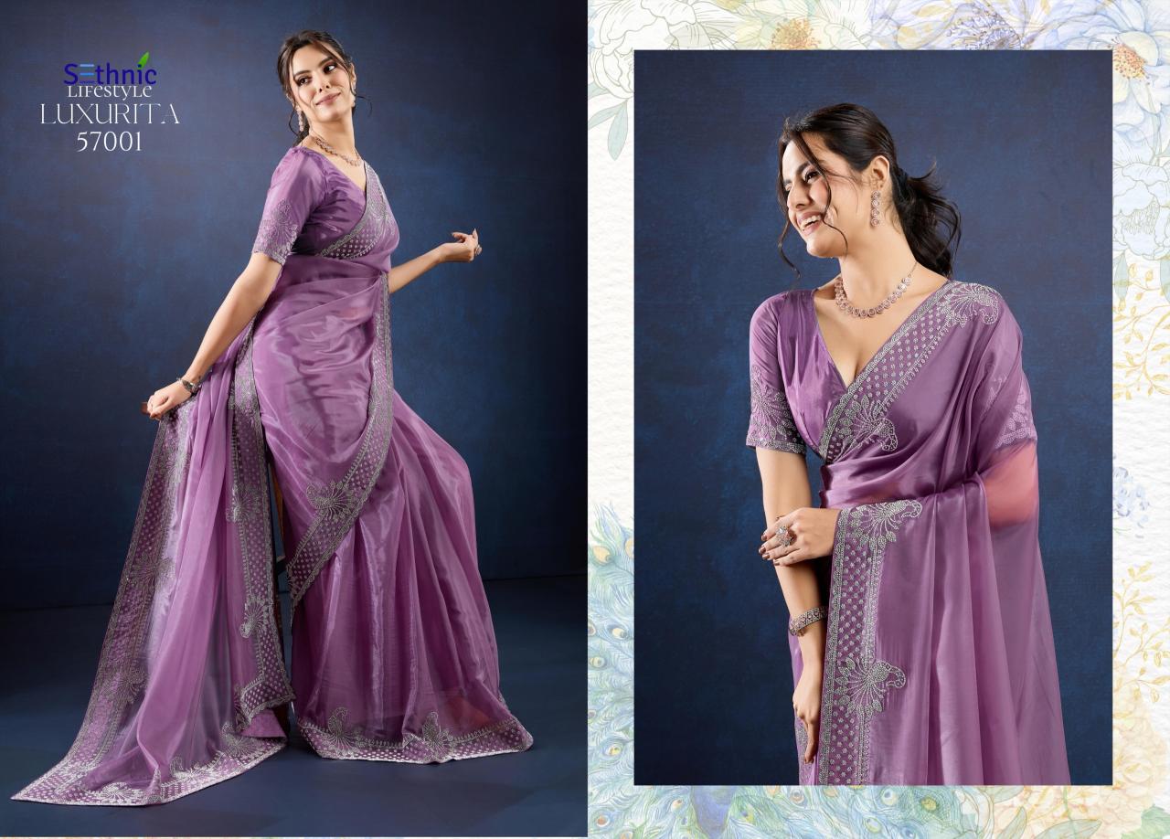An exquisite wedding saree collection featuring pure handwork and a grand figure patta concept. Adorned with crystal zarkans and golden pipes, radiating timeless beauty and grandeur. Brand : Sethnic Lifestyle Catalog Name : Luxurita Series: 57001 TO 57006 Saree Fabric : Detail Attached Blouse Fabric : Detail Attached Occasion : Festival Wear, Party Wear |