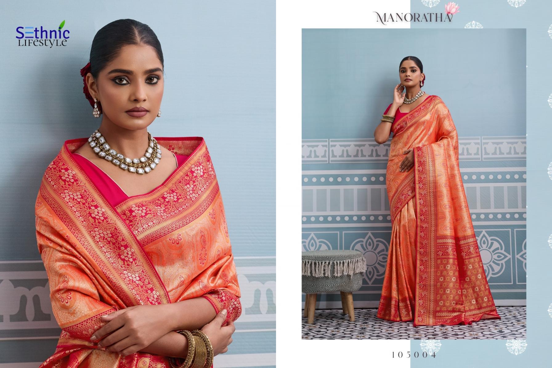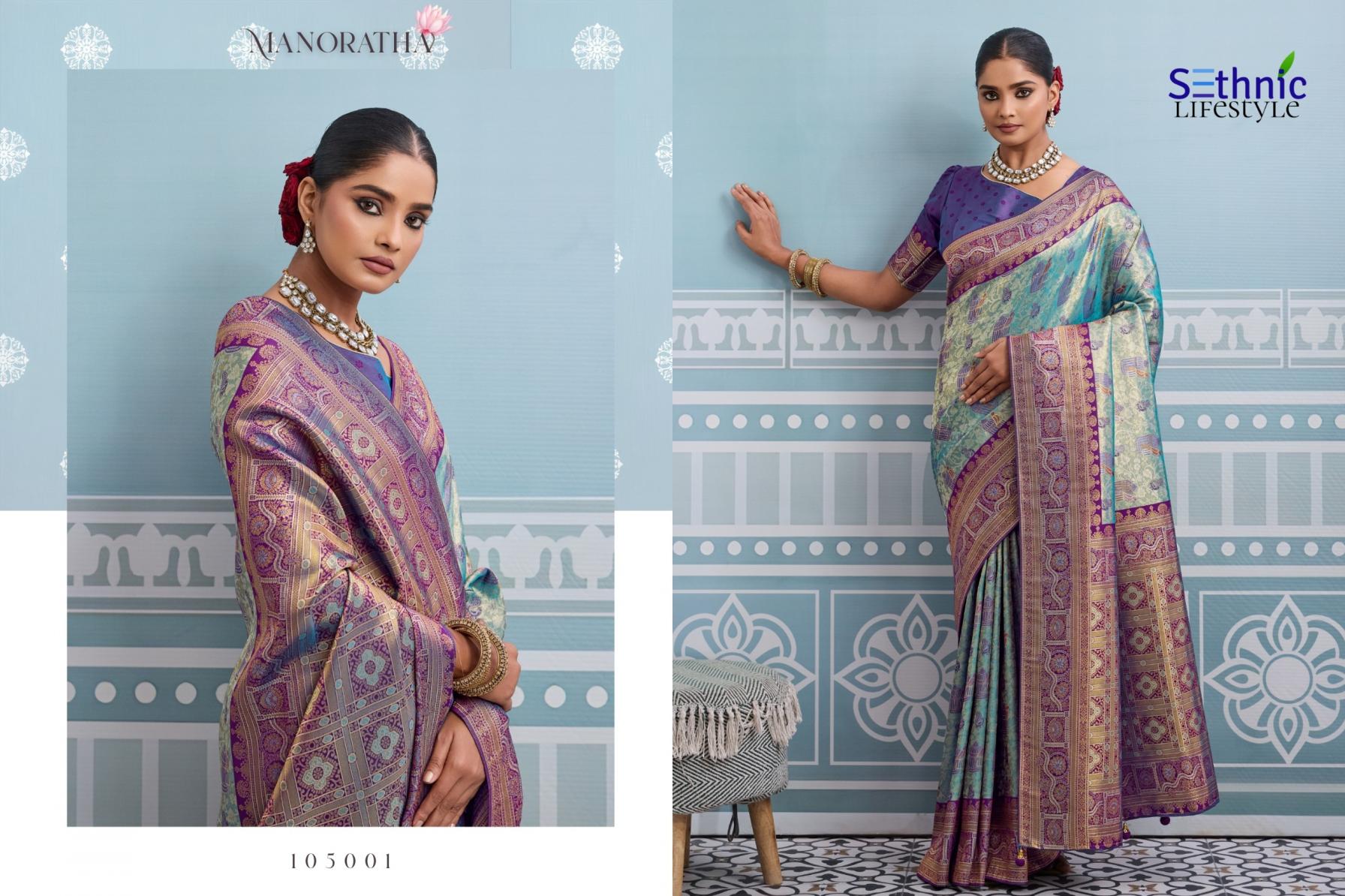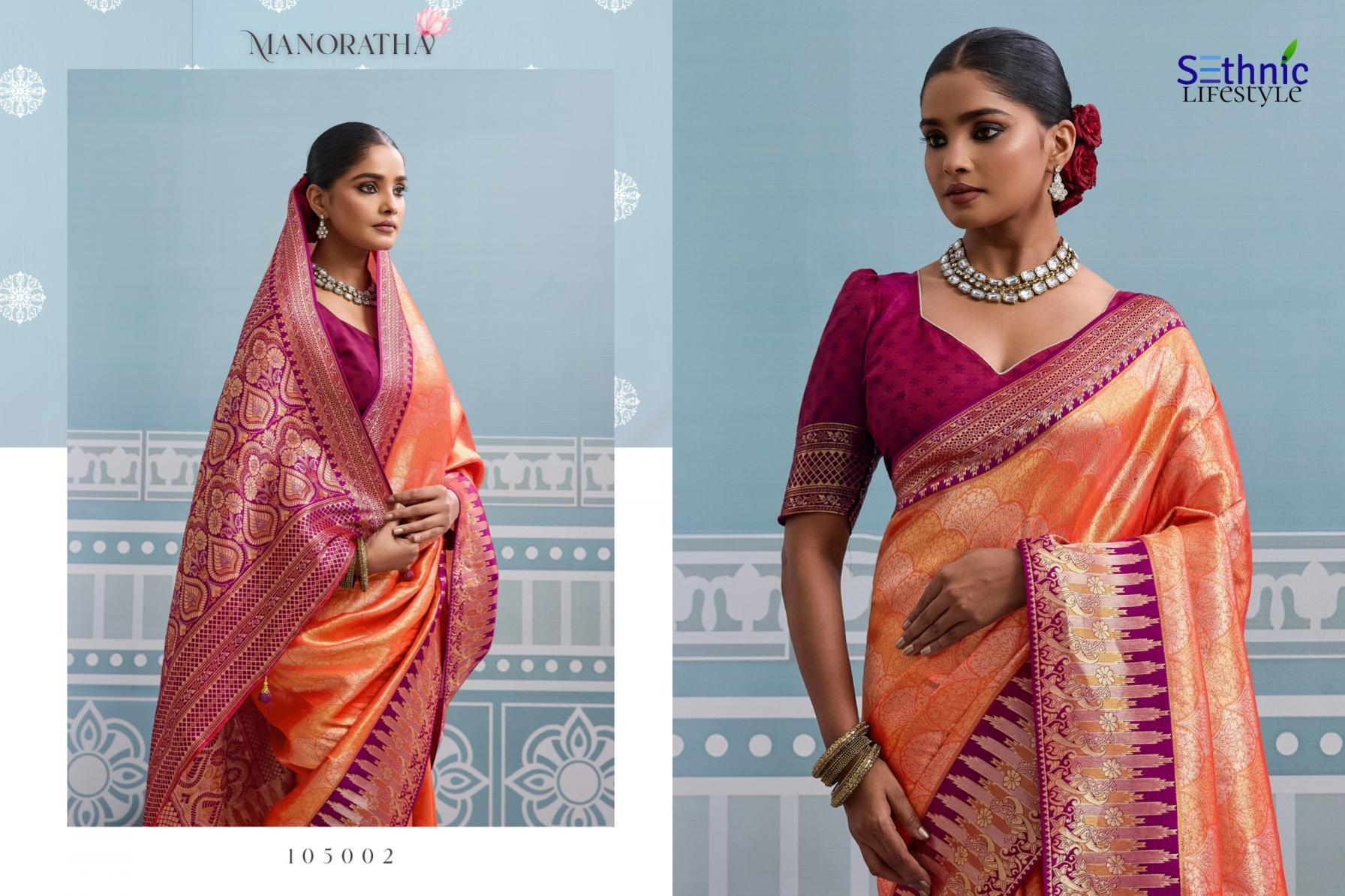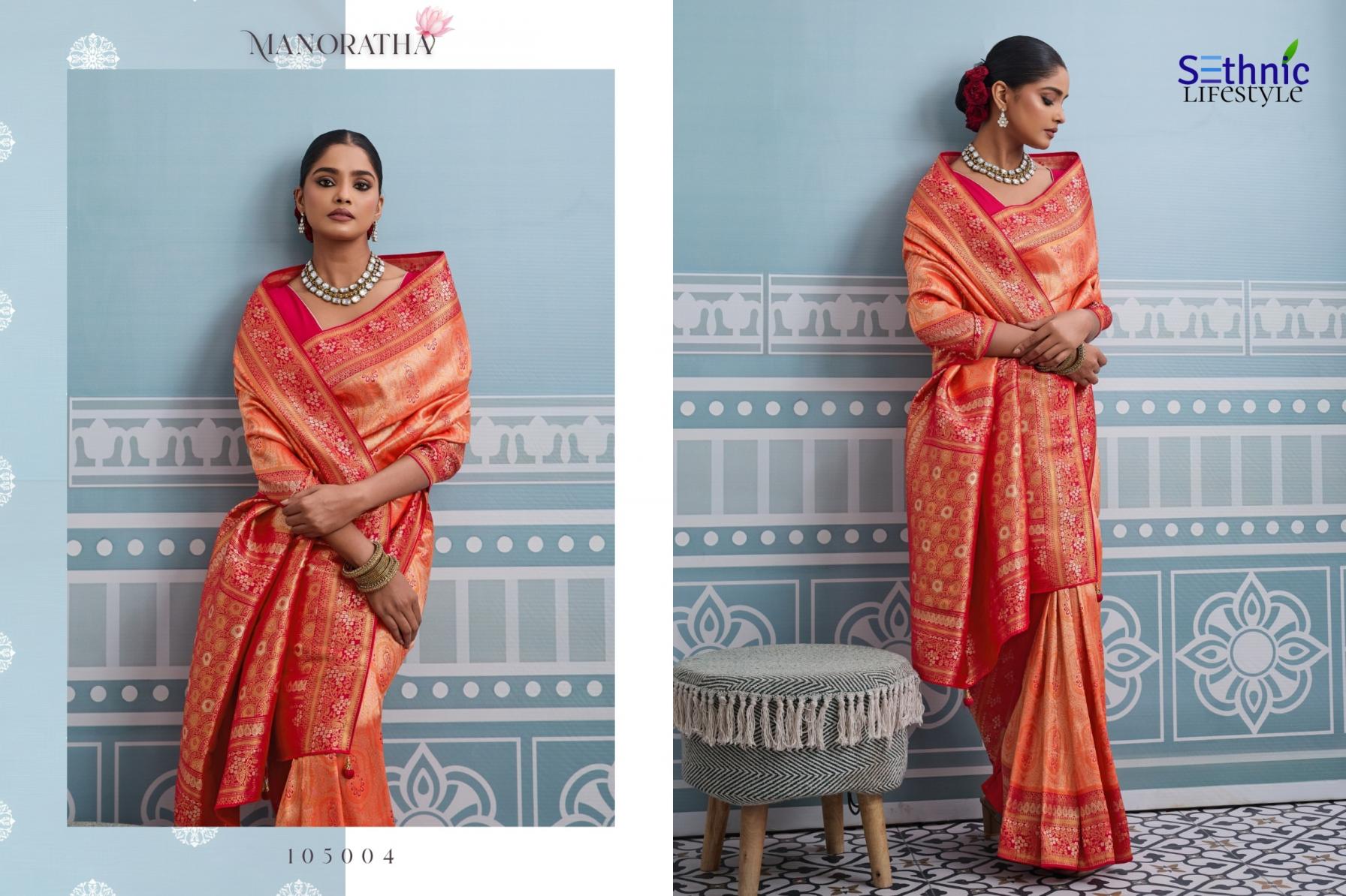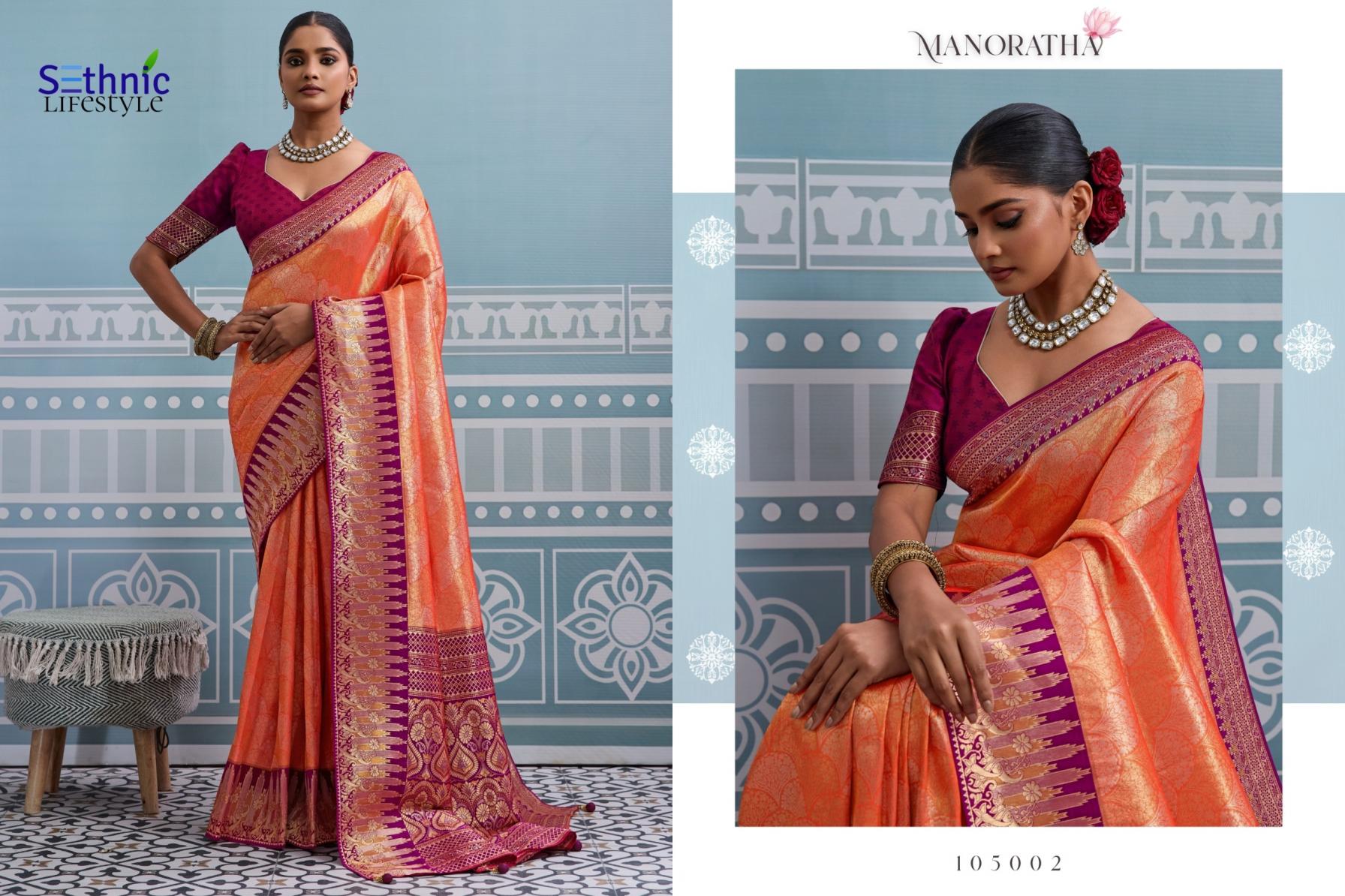 A Collection Where Kanjivaram Soft Silk Meets The Finesse Of Meenakari Artistry, Adorned With Broad Pattu Borders, Opulent Pallus, And Graceful Potli Tassels. Each Drape Is A Vision Of Heritage Reimagined – Woven To Fulfill Every Woman’s Desire For Royalty, Tradition, And Timeless Celebration. Step Into The Season Of Grandeur With Manoratha – A Weave Of Wishes Turned Into Reality. Brand : Sethnic Lifestyle Catalog Name : Manoratha Series : 105001 TO 105010 Saree: Kanjivaram Soft silk With Zari, Thread & Meenakari Weaving, Broad Pattu & Rich Pallu Blouse : Self Woven Running Blouse with Meenakari Patta for Sleeves Embellishment : Cute Potli Matching Tassels (4 units) on the Pallu Price :- 1295/- 5% Gst |