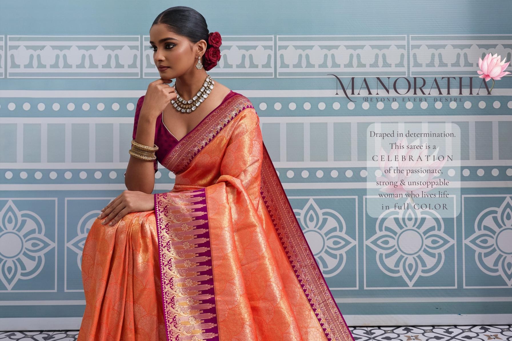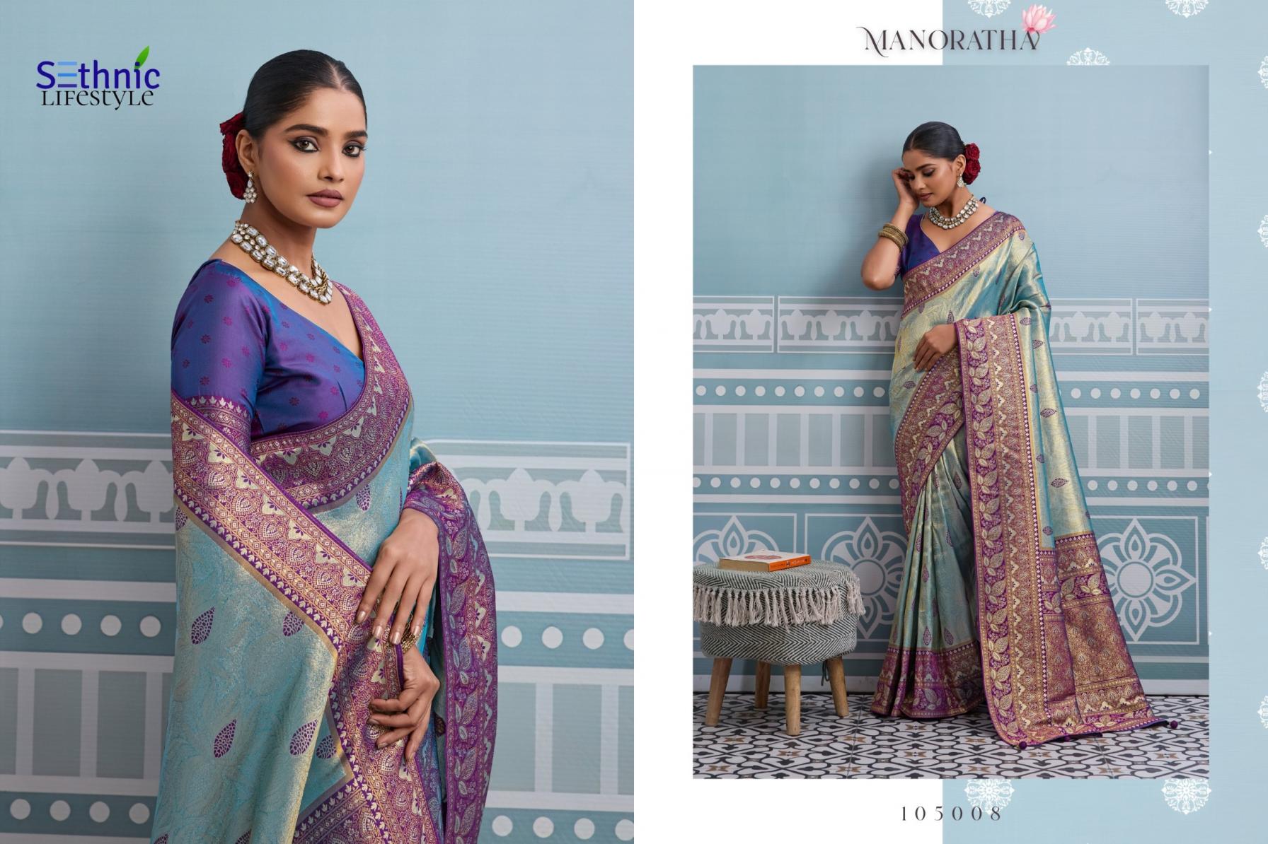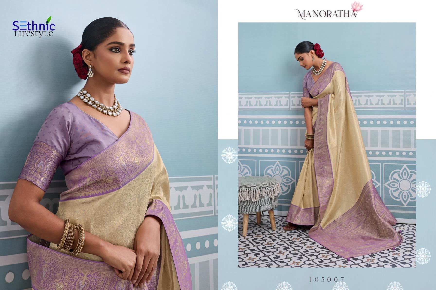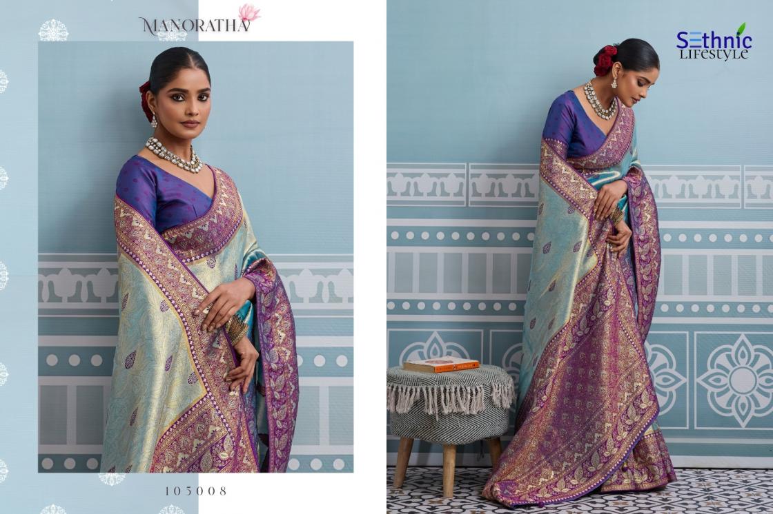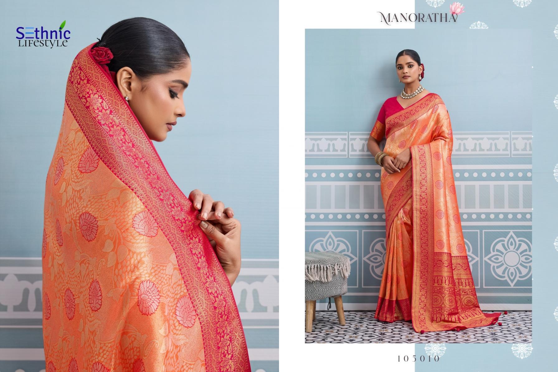 A Collection Where Kanjivaram Soft Silk Meets The Finesse Of Meenakari Artistry, Adorned With Broad Pattu Borders, Opulent Pallus, And Graceful Potli Tassels. Each Drape Is A Vision Of Heritage Reimagined – Woven To Fulfill Every Woman’s Desire For Royalty, Tradition, And Timeless Celebration. Step Into The Season Of Grandeur With Manoratha – A Weave Of Wishes Turned Into Reality. Brand : Sethnic Lifestyle Catalog Name : Manoratha Series : 105001 TO 105010 Saree: Kanjivaram Soft silk With Zari, Thread & Meenakari Weaving, Broad Pattu & Rich Pallu Blouse : Self Woven Running Blouse with Meenakari Patta for Sleeves Embellishment : Cute Potli Matching Tassels (4 units) on the Pallu Price :- 1295/- 5% Gst |