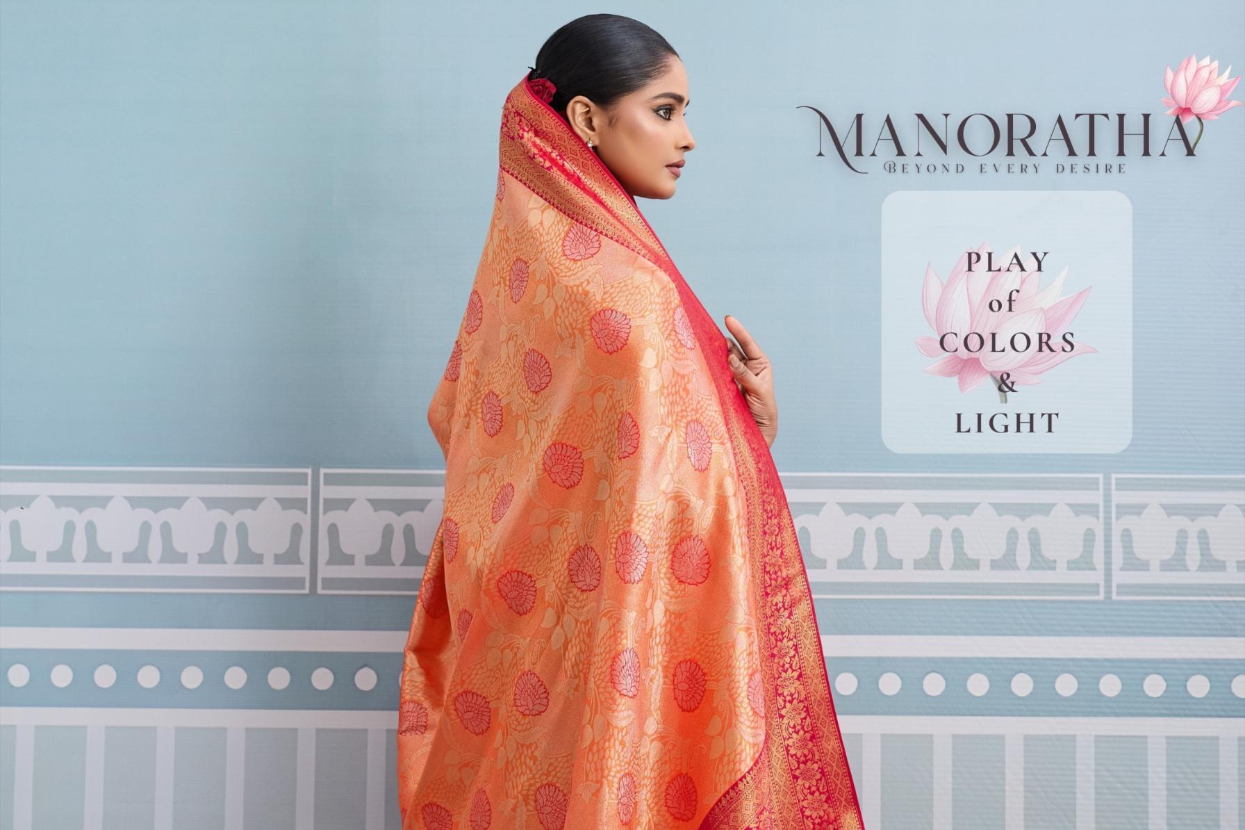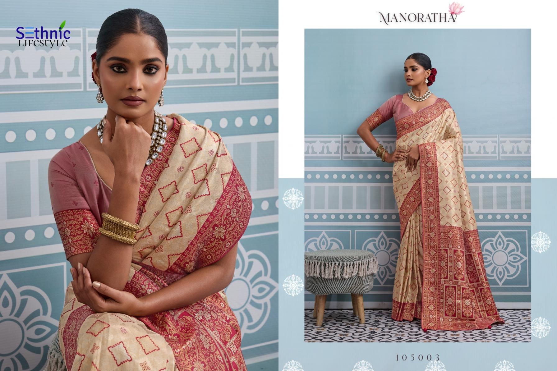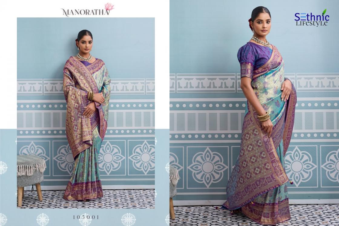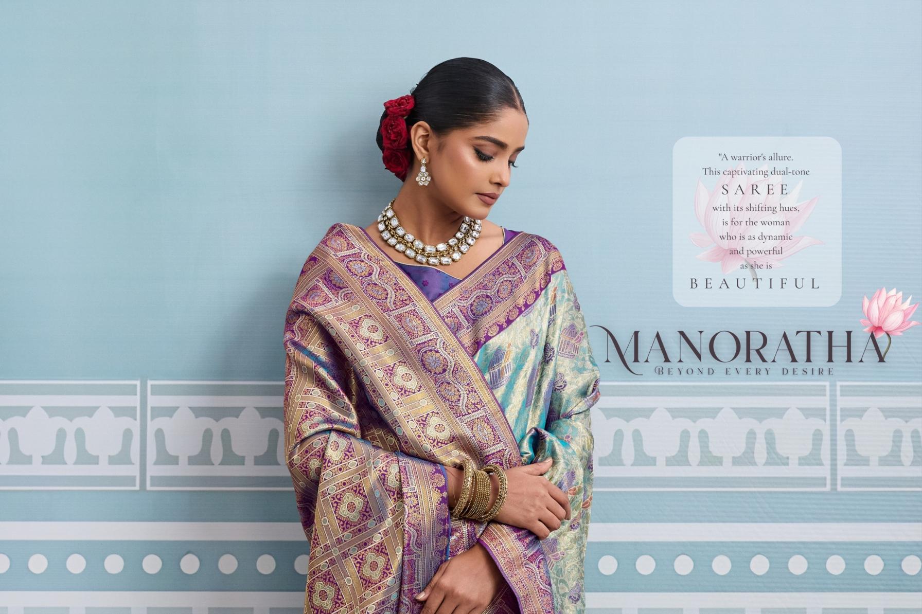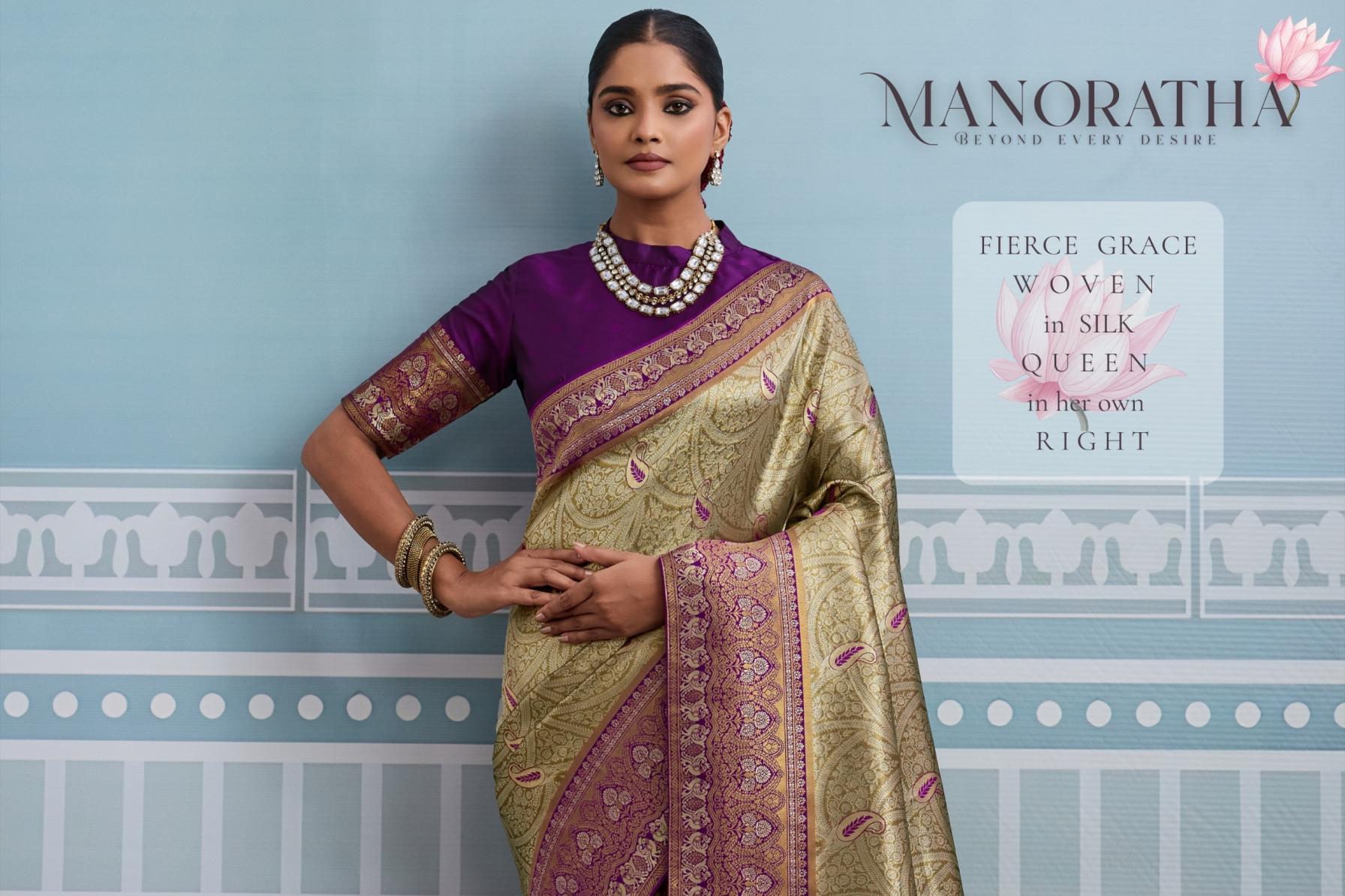 A Collection Where Kanjivaram Soft Silk Meets The Finesse Of Meenakari Artistry, Adorned With Broad Pattu Borders, Opulent Pallus, And Graceful Potli Tassels. Each Drape Is A Vision Of Heritage Reimagined – Woven To Fulfill Every Woman’s Desire For Royalty, Tradition, And Timeless Celebration. Step Into The Season Of Grandeur With Manoratha – A Weave Of Wishes Turned Into Reality. Brand : Sethnic Lifestyle Catalog Name : Manoratha Series : 105001 TO 105010 Saree: Kanjivaram Soft silk With Zari, Thread & Meenakari Weaving, Broad Pattu & Rich Pallu Blouse : Self Woven Running Blouse with Meenakari Patta for Sleeves Embellishment : Cute Potli Matching Tassels (4 units) on the Pallu Price :- 1295/- 5% Gst |