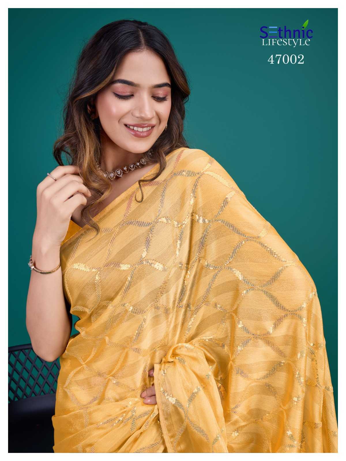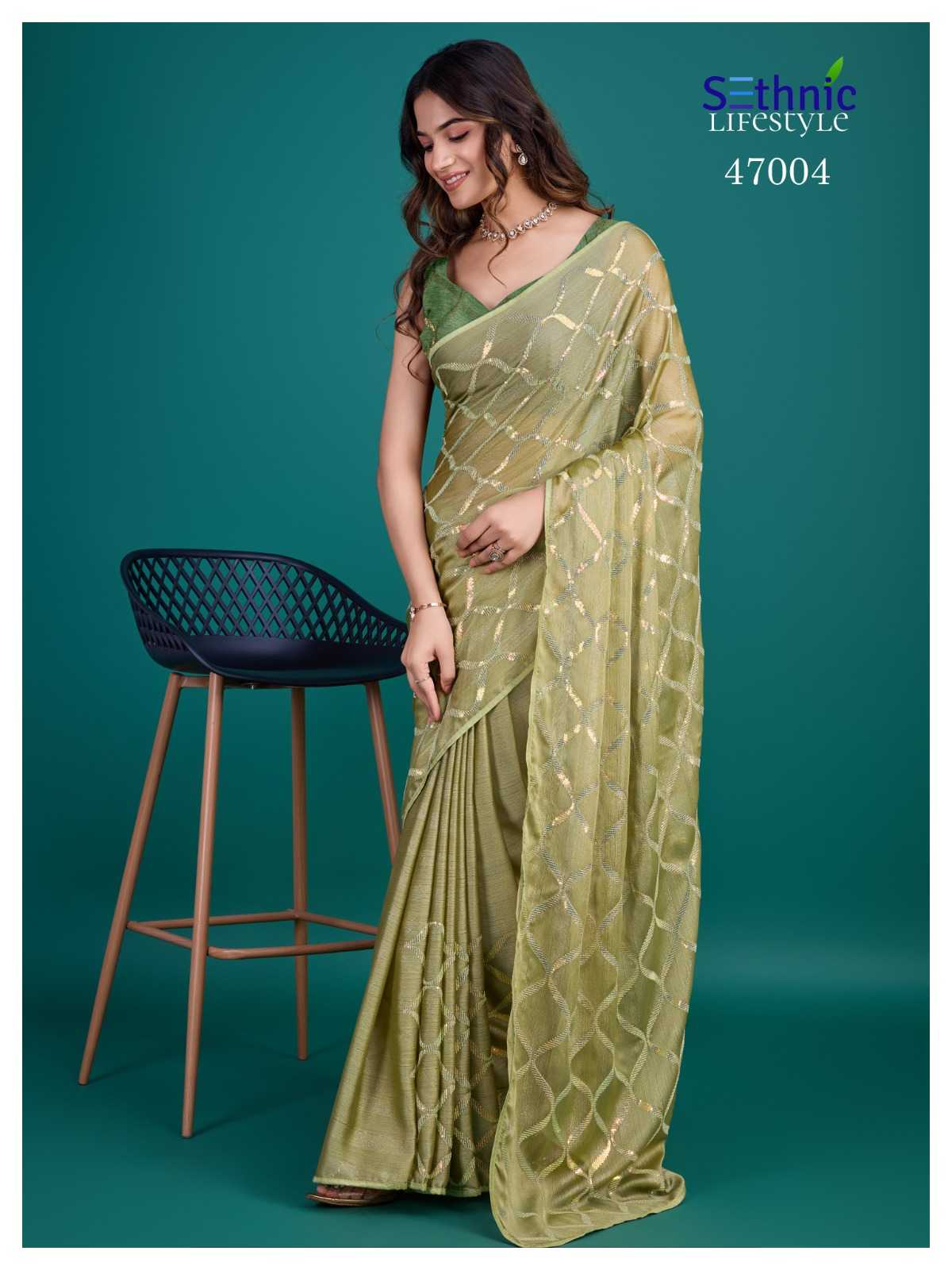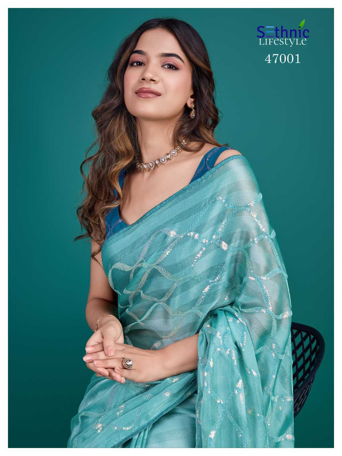 Elevate your elegance with our self-pattern embroidered saree, a timeless masterpiece that seamlessly blends intricate craftsmanship with modern sophistication, perfect for the woman who values grace and subtlety Brand : Sethnic Lifestyle Catalog Name : Saamya Vol 2 Series: 47001 to 47005 Saree Fabric : Glass Zari (Shimmer Georgette Base With All over double sequins embroidery with clean piping Blouse Fabric : Albela _Double Sequins Embroidery Occasion : Festival Wear, Party Wear |