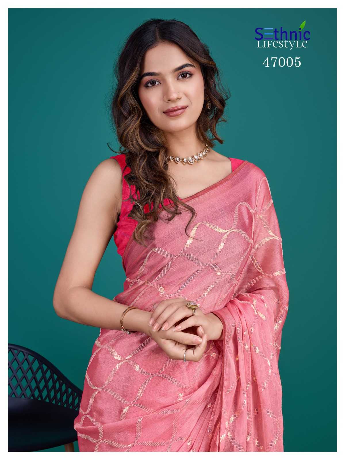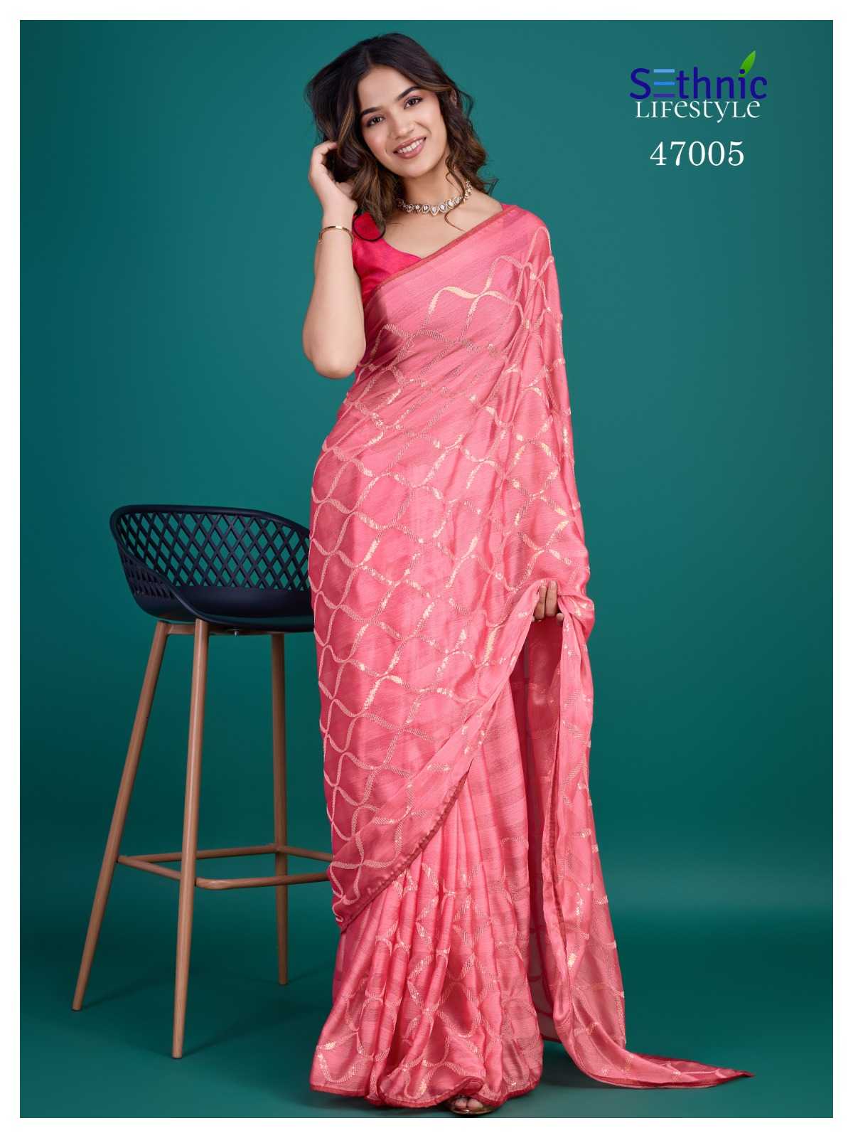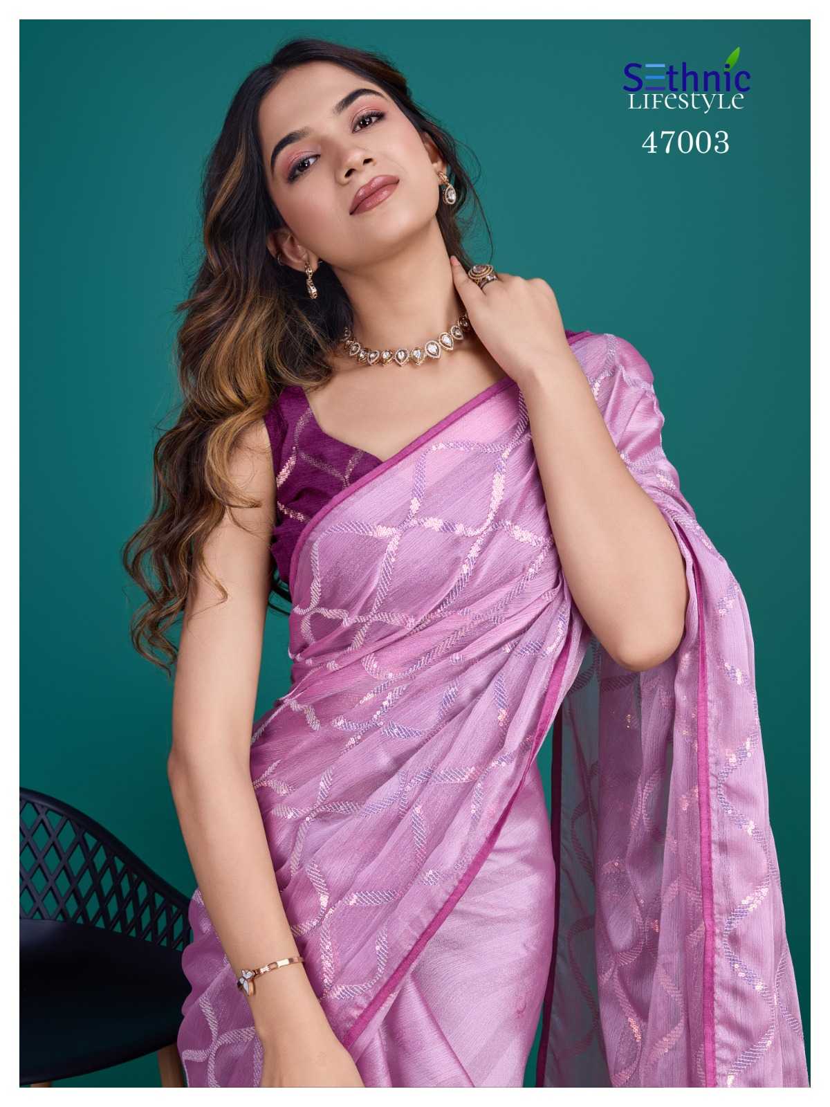 Elevate your elegance with our self-pattern embroidered saree, a timeless masterpiece that seamlessly blends intricate craftsmanship with modern sophistication, perfect for the woman who values grace and subtlety Brand : Sethnic Lifestyle Catalog Name : Saamya Vol 2 Series: 47001 to 47005 Saree Fabric : Glass Zari (Shimmer Georgette Base With All over double sequins embroidery with clean piping Blouse Fabric : Albela _Double Sequins Embroidery Occasion : Festival Wear, Party Wear |