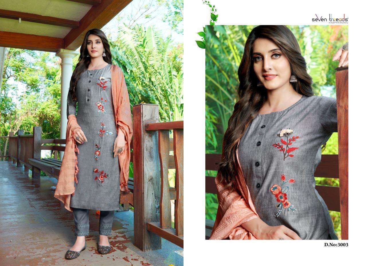 Weâre proud to announce the launch of our new catalogue as part of the ongoing evolution of our brand                                      âSEVEN THREADSâ Catalogue name:-EVA * - 7 Designs * Fabric -                               Top -Pure viscous slub Bottom -Metro slub Dupatta - Viscous slub lining * Size - M , L , XL , XXL , XXXL * Length - 46+ * Work -                            Top - Elegant handwork with khatli touchup with classic hand thread Embroidery work and stylish laces Bottom - pant with stylish laces and pattern Dupatta - beautiful viscous solid died lining with contrast colour Type - Full stitched  - 831/- Rs per pcs . Set to set Delivery 2-3 days |