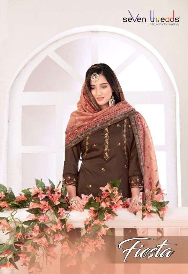 Weâre proud to announce the launch of our new catalogue as part of the ongoing evolution of our brand                                      âSEVEN THREADSâ Catalogue name:-FIESTA * - 7 Designs * Fabric -                               Top -Bitalian viscous silk Bottom -Prime silk Dupatta - Pure Jacquard butti * Size - M , L , XL , XXL , XXXL * Length - 46+ * Work -                            Top - Elegant handwork with khatli and Embroidery work Bottom -Sharara with classic sequence embroidery butti Dupatta -pure jacquard butti with beautiful digital print Type - Full stitched  - 1071/-Rs per PCâs Set to set. Delivery 2 days |