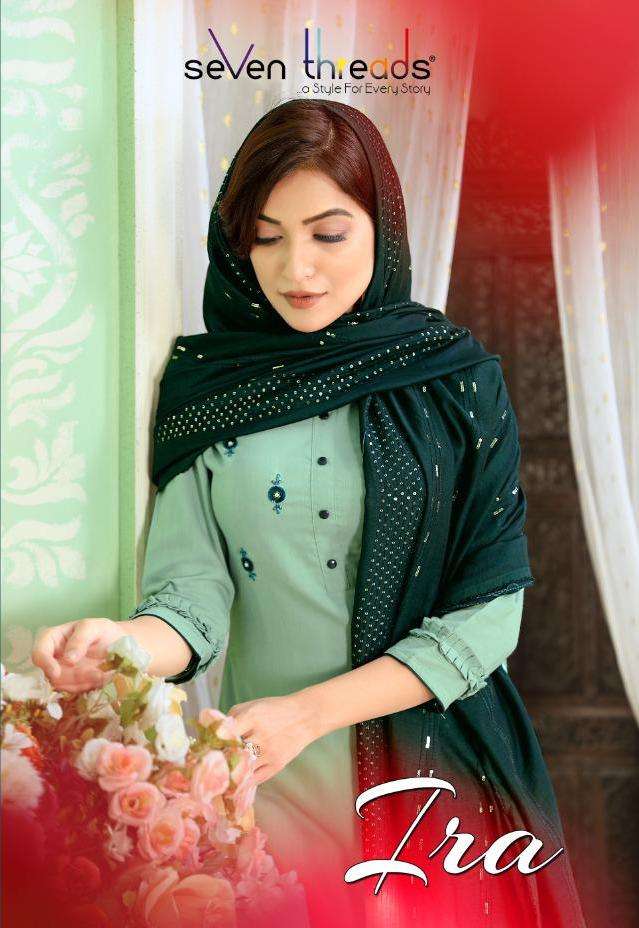 Weâre proud to announce the launch of our new catalogue as part of the ongoing evolution of our brand                                      âSEVEN THREADSâ Catalogue name:-IRA * - 7 Designs * Fabric -                               Top -Tesla silk (viscous slub) Bottom -Metro cotton Dupatta - Viscous silk * Size - M , L , XL , XXL , XXXL * Length - 46+ * Work -                            Top - Elegant pure handwork with khatli Bottom - pant with amazing handowrk and pattern Dupatta - beautiful viscous sequence shaded Duppata with classic sequence Desgins Type - Full stitched  - 931/- Rs per pcs . Set to set. GST 5 Percent Extra. |