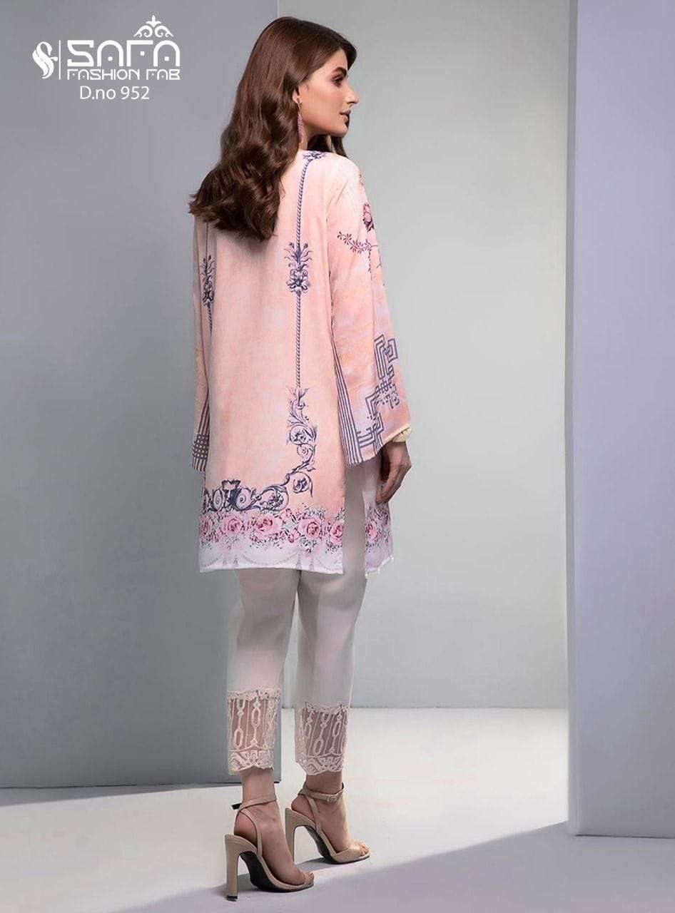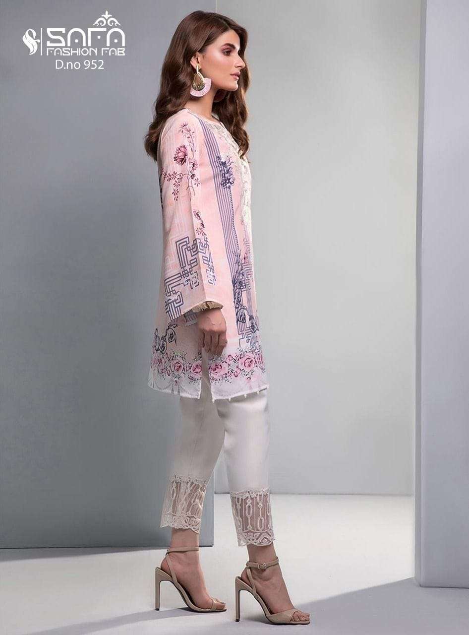 Luxury Formals We are Introducing our LUXURY PRET FORMAL WEAR  COLLECTION To Make You Unique and Classy.. With Supirier Quality and Affordable Price  S.F.952 by SAFA FASHION  FAB Description  Designer Embroidered Tunic with Sleeves paired with Designer Cigarette pants*With  *Designer Duptta Details Top:-Heavy Maslin Fabric Bottom :- Cotton Stretchable Fabric Duppta :- Designer Duptta Colour  Pink        Size Chart Top xl size chest (42) Bottom xl size (38) Rate 1050/- Full set available      Colour may slightly vary due to light effect Book Fast Limited Stock        Ready To Ship |