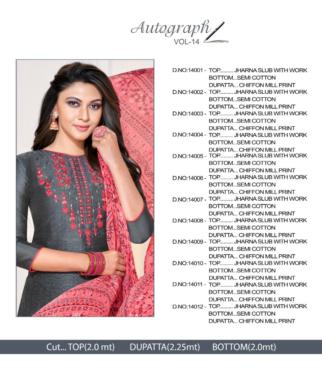 AUTOGRAPH-14 TOP- SLUB LININGS WITH EMB. WORK (2) BOTTOM- COTTON (2) DUPATTA- CHIFFON PRINT (2:30) PCS.-12 Rate - 435 per PC’s . Set to set . GST 5 Percent Extra. Delivery from tomorrow |