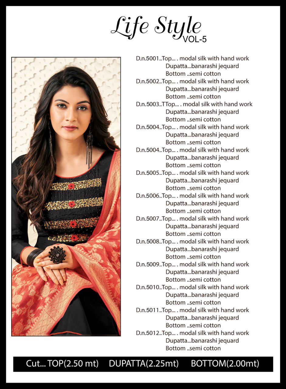 LIFE -STYLE VOL.5 TOP - MODAL WITH HAND WORK (2:40) BOTTOM-COTTON v(2) DUPATTA - BANARASI JEQ (2:40) PCS.-12 Rate 750 READY DELIVERY |
