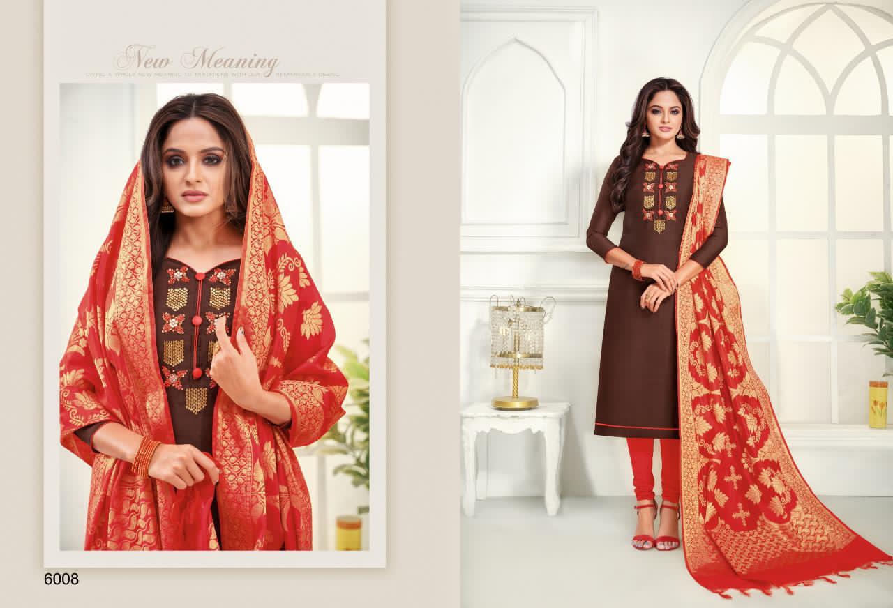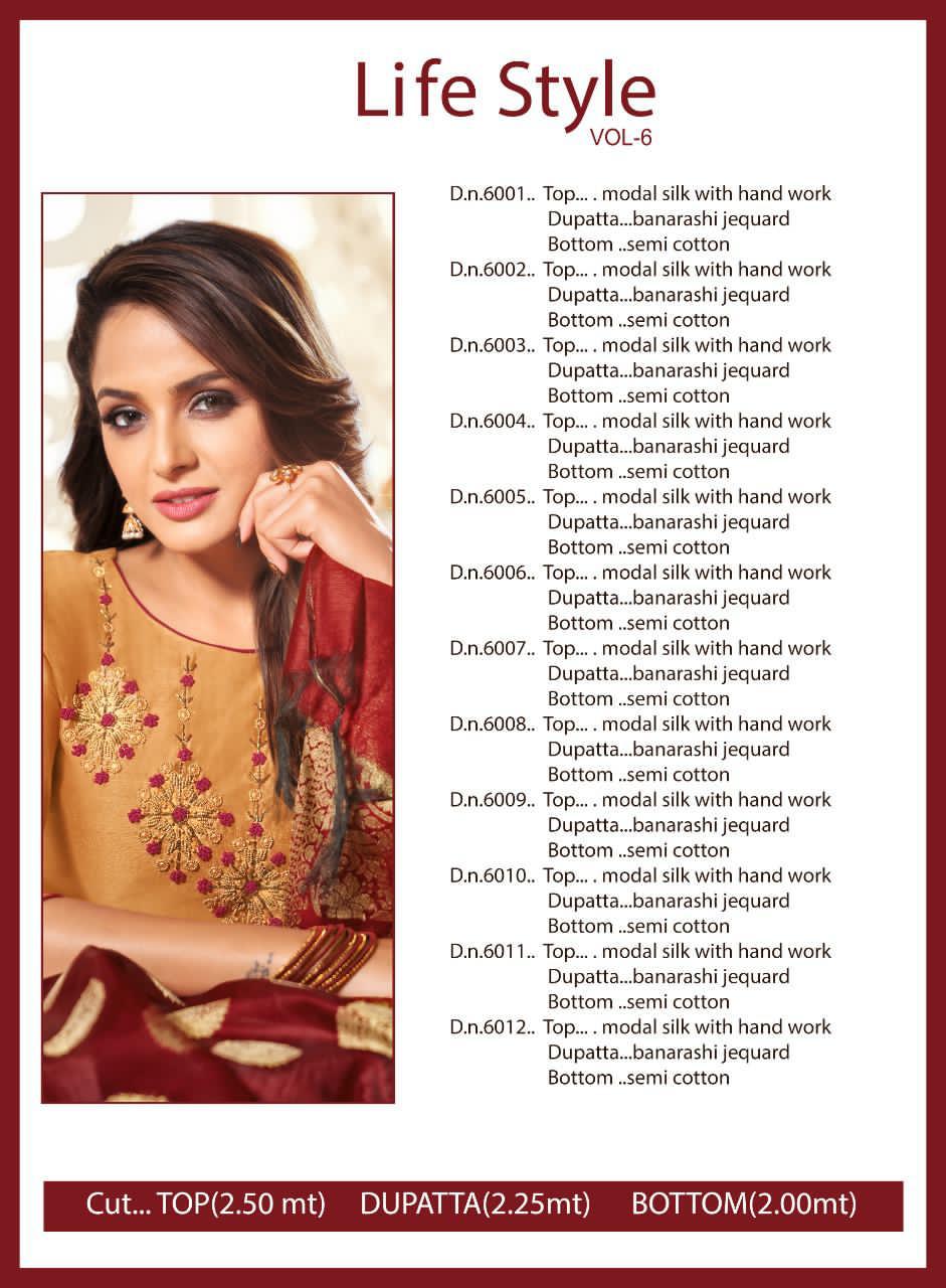 LIFE -STYLE VOL-6 TOP -MODAL SILK WITH HAND WORK (2:40) BOTTOM -COTTON (2) DUPATTA- BANARASI JEQ (2:25) PCS.-12 DELIVERY- FRIDAY Rate - 750 per pcs . Set to set . GST 5 Percent Extra. |
